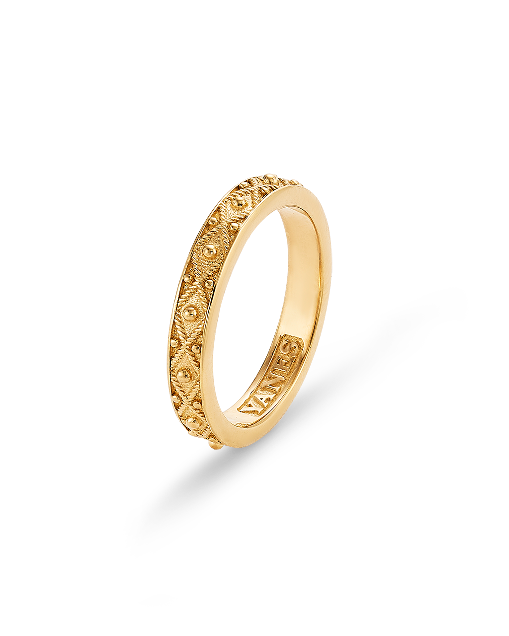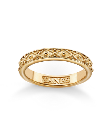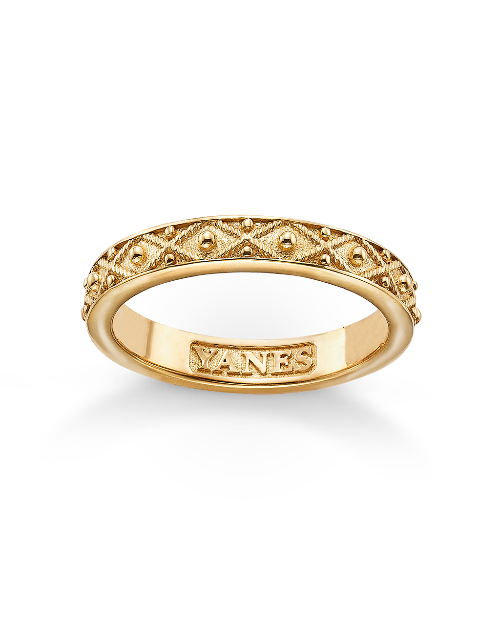 Anillo rombos bisel cordón centro mini bolas. En oro amarillo de 18K. Ancho 5 mm. Colección Malpica.