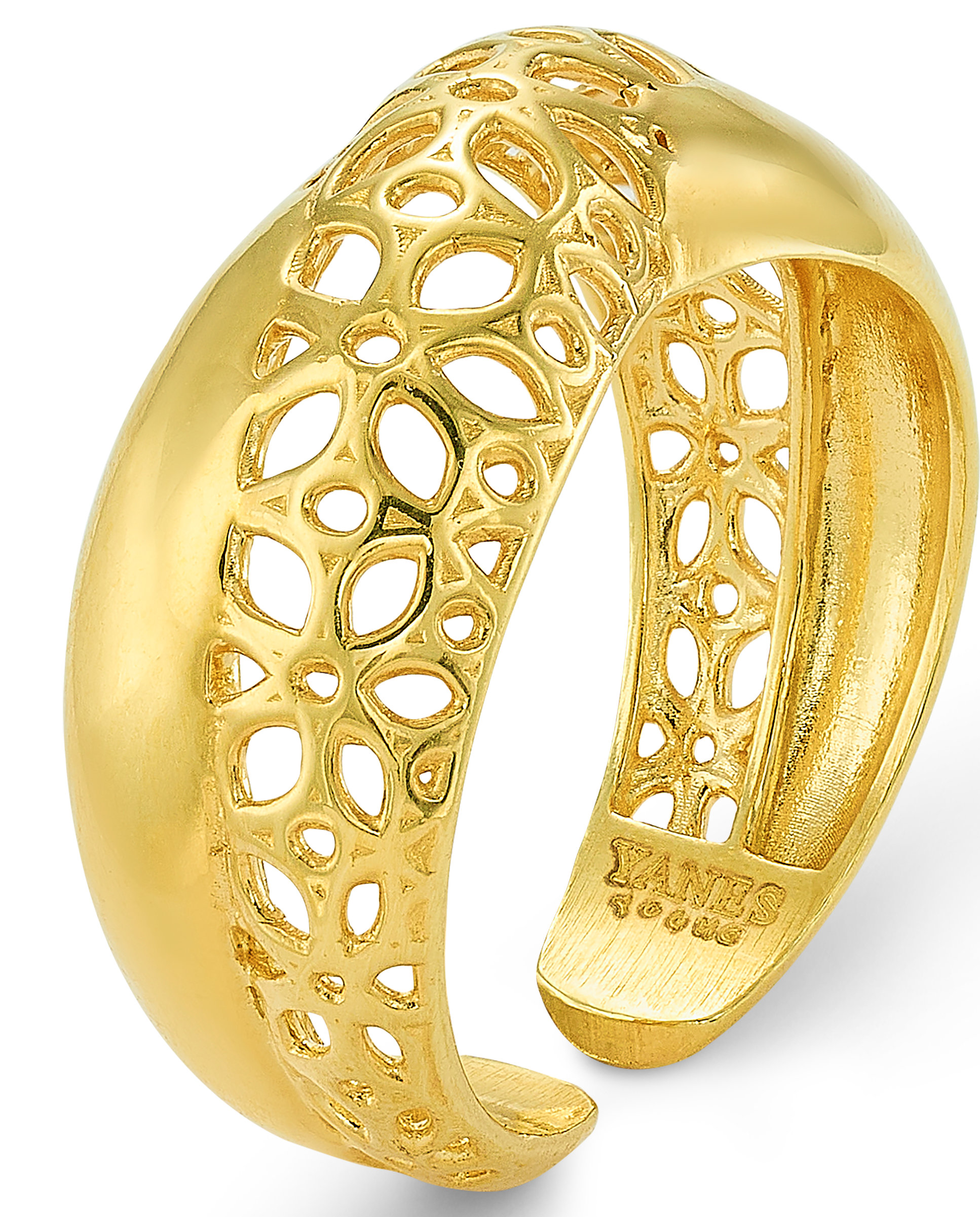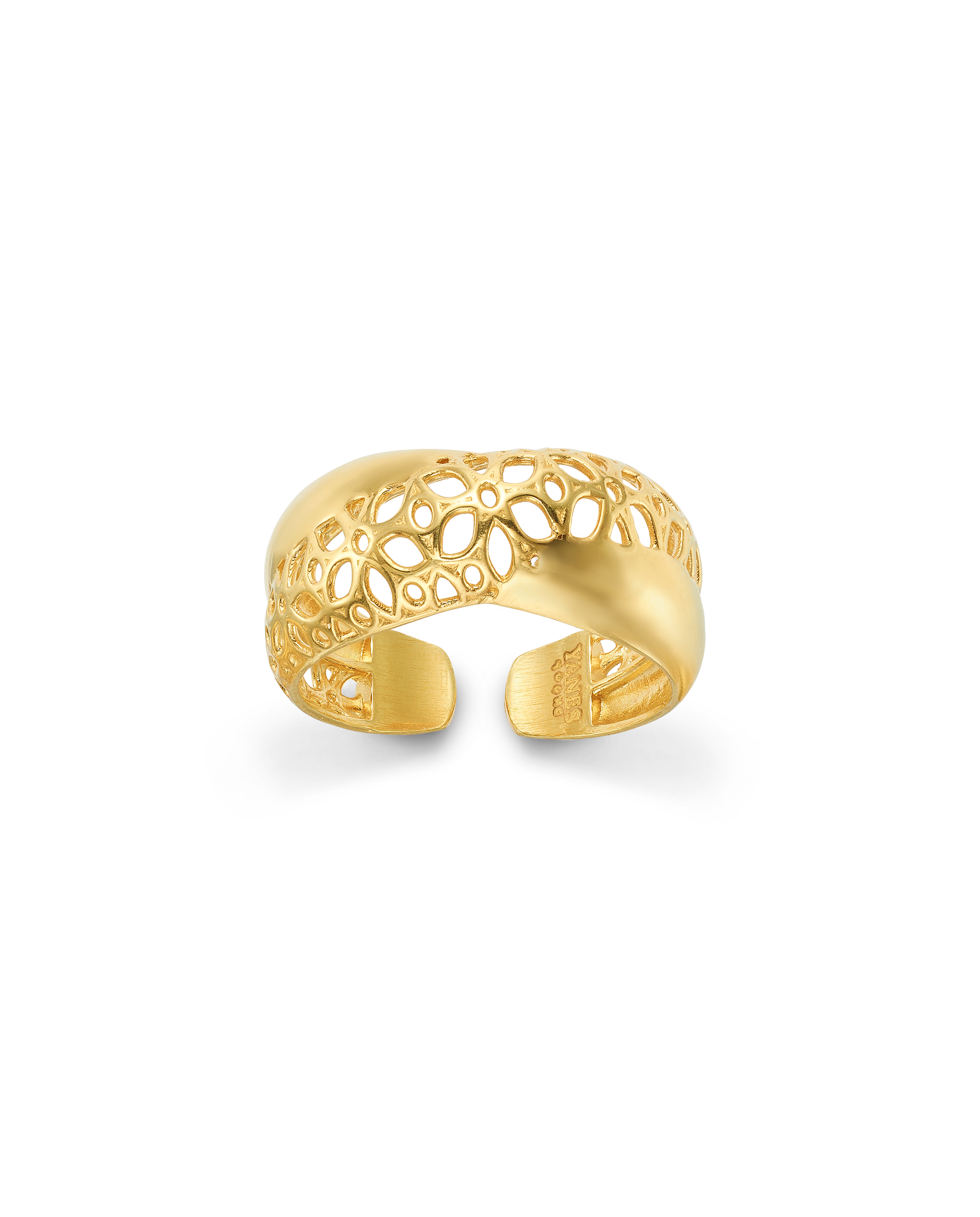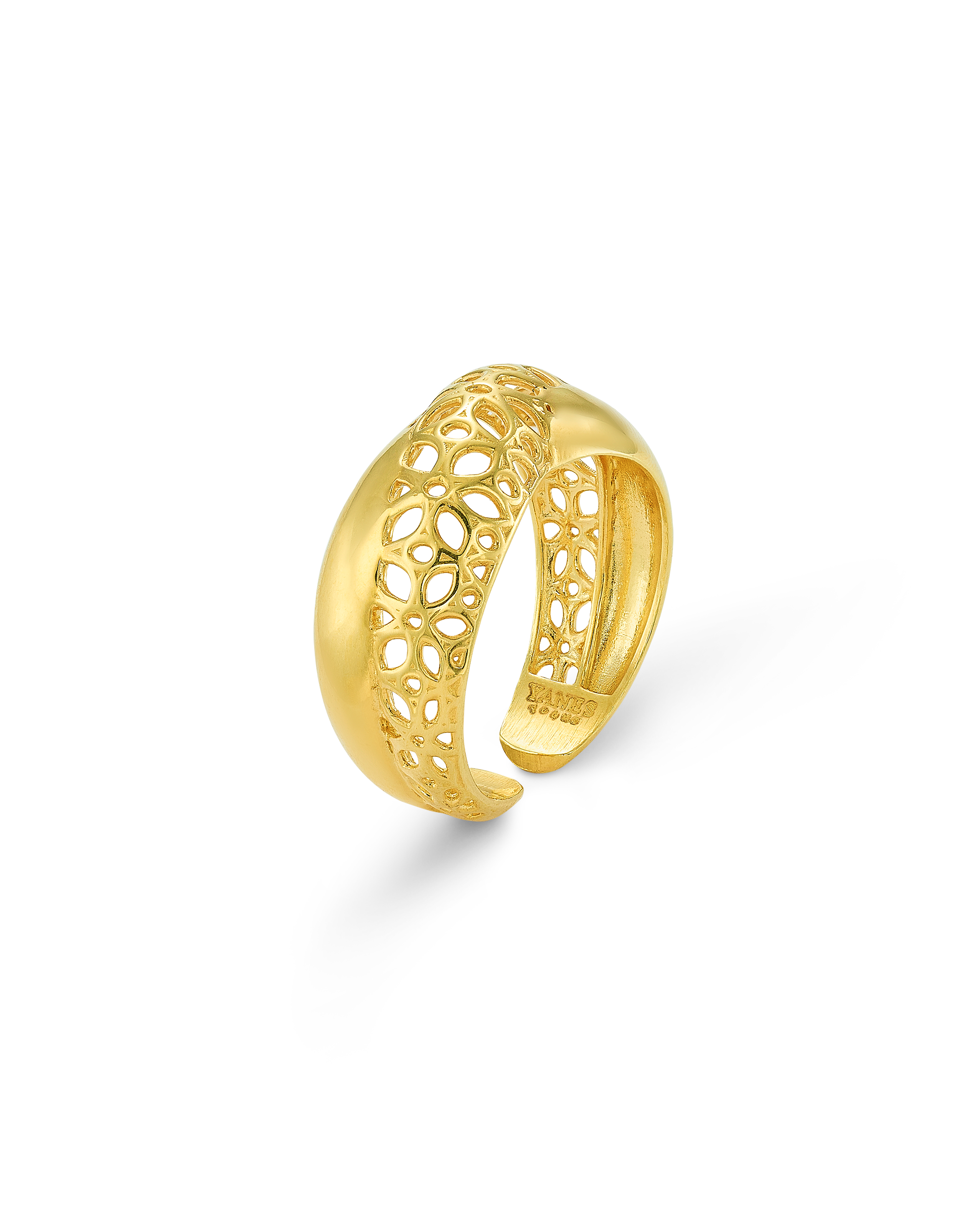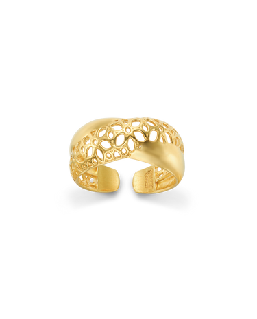 Anillo en plata de ley dorada, dos bandas cruzadas, una banda lisa y una banda en flores caladas. Ancho 1 cm en disminución. Colección Costa de la Luz.