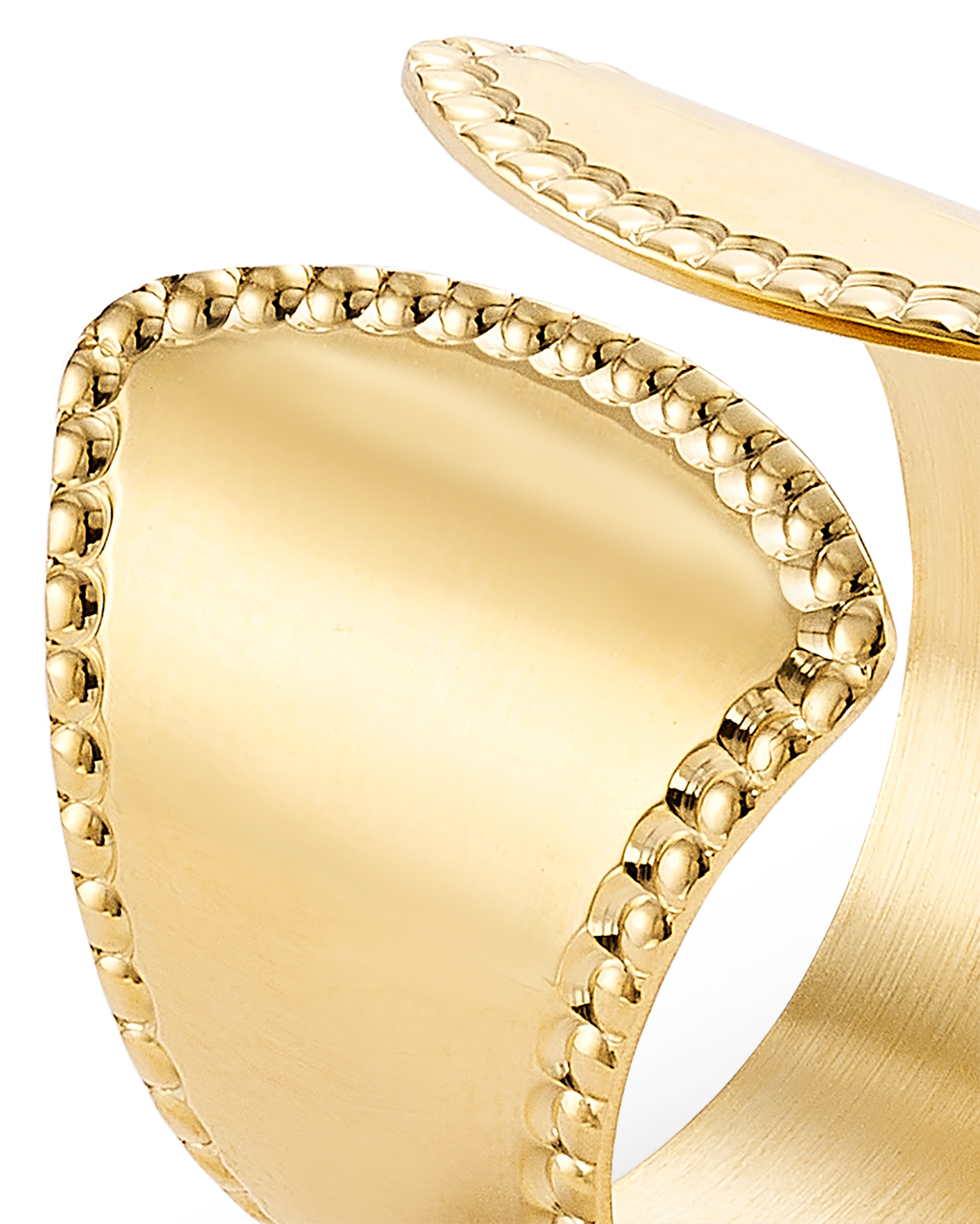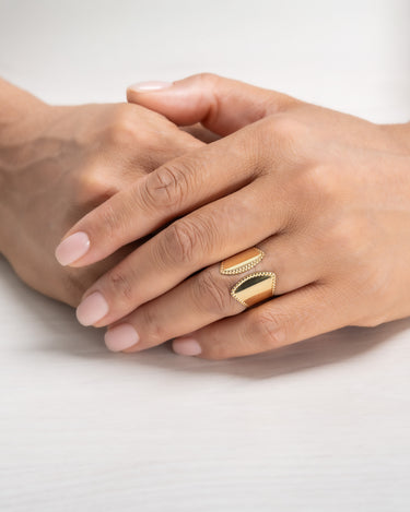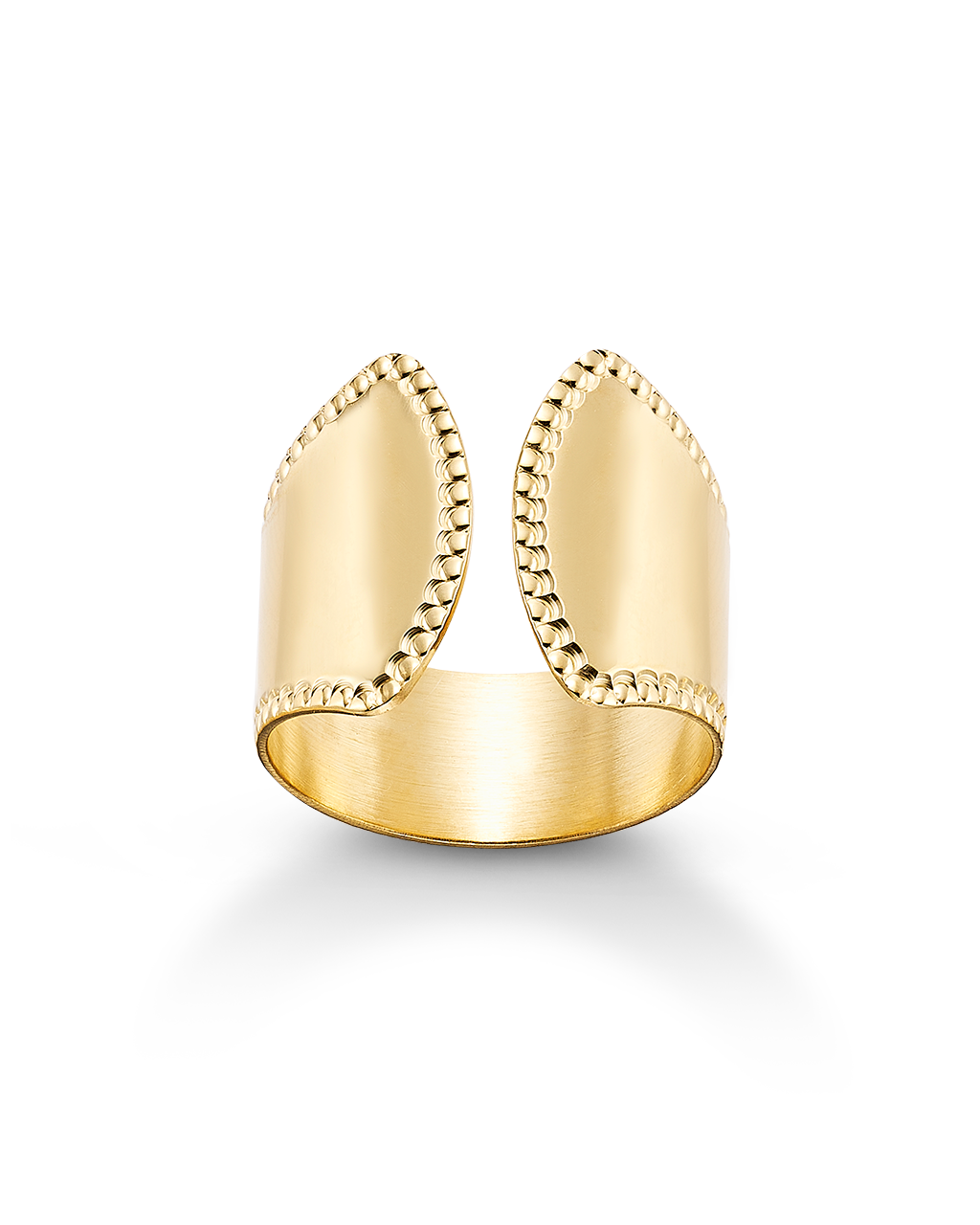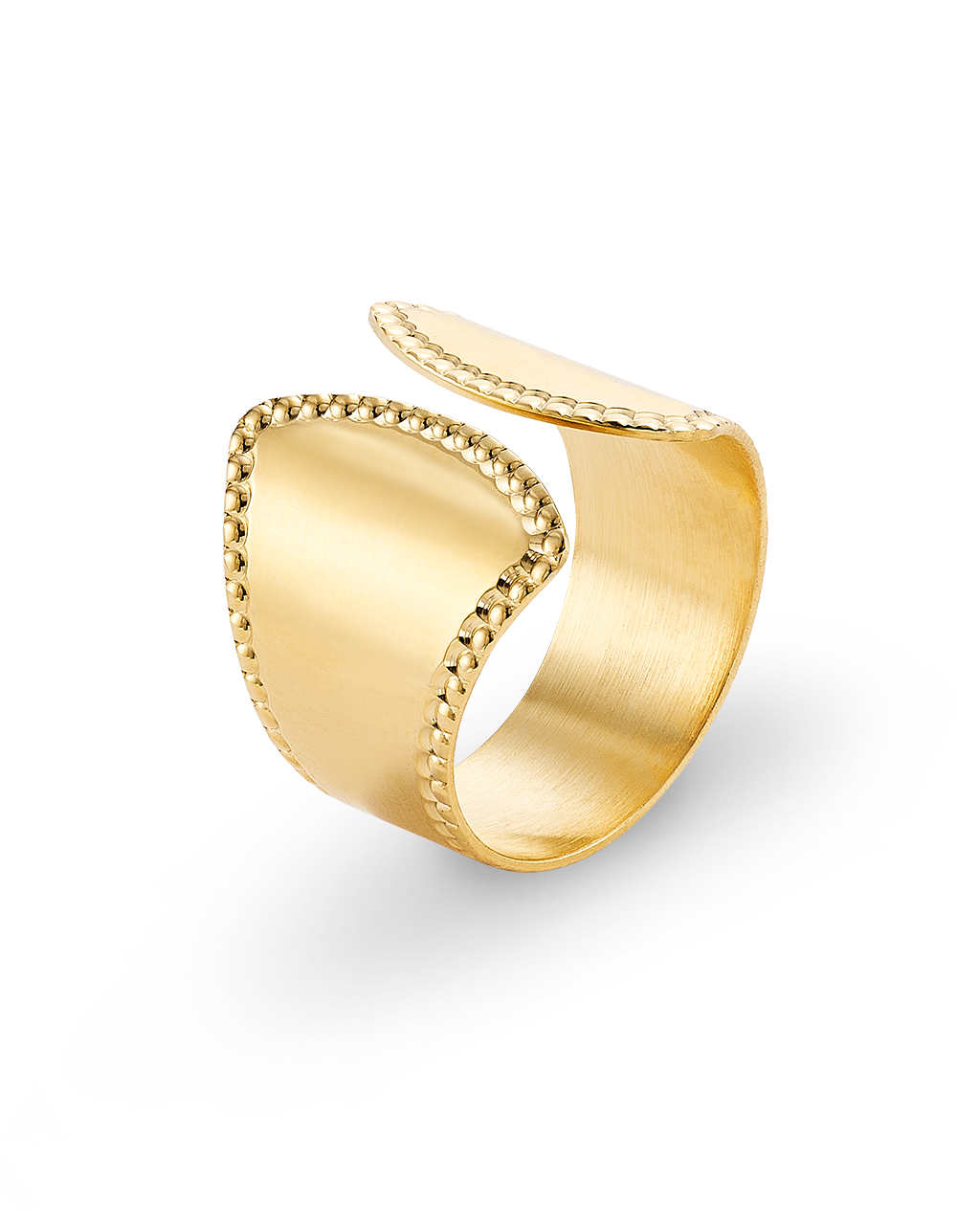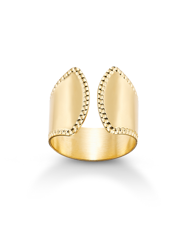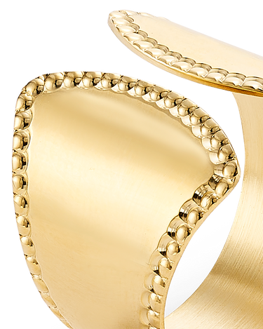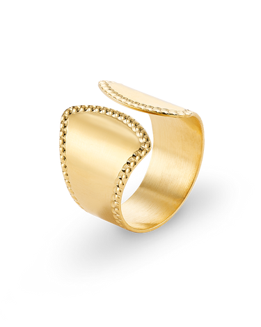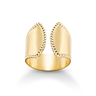Anillo ancho abierto bisel cordón, plata de ley dorada. Ancho 17 mm en disminución. Colección Liceo.