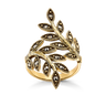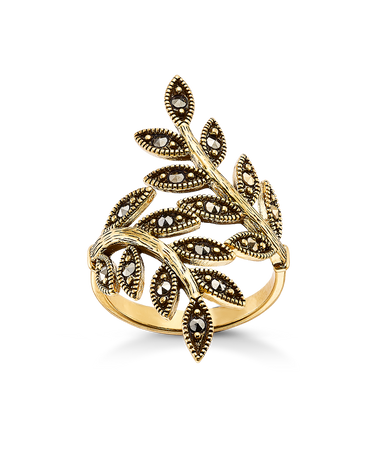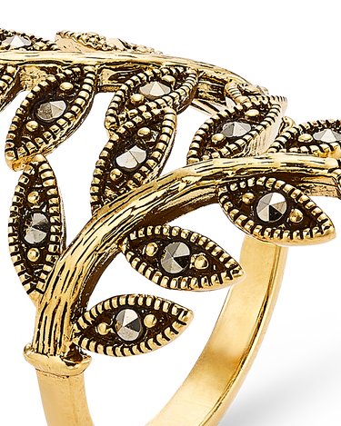 Anillo dos ramas hojas marcasitas, plata de ley dorada. Medida largo ramas 34 mm. Colección Viena.