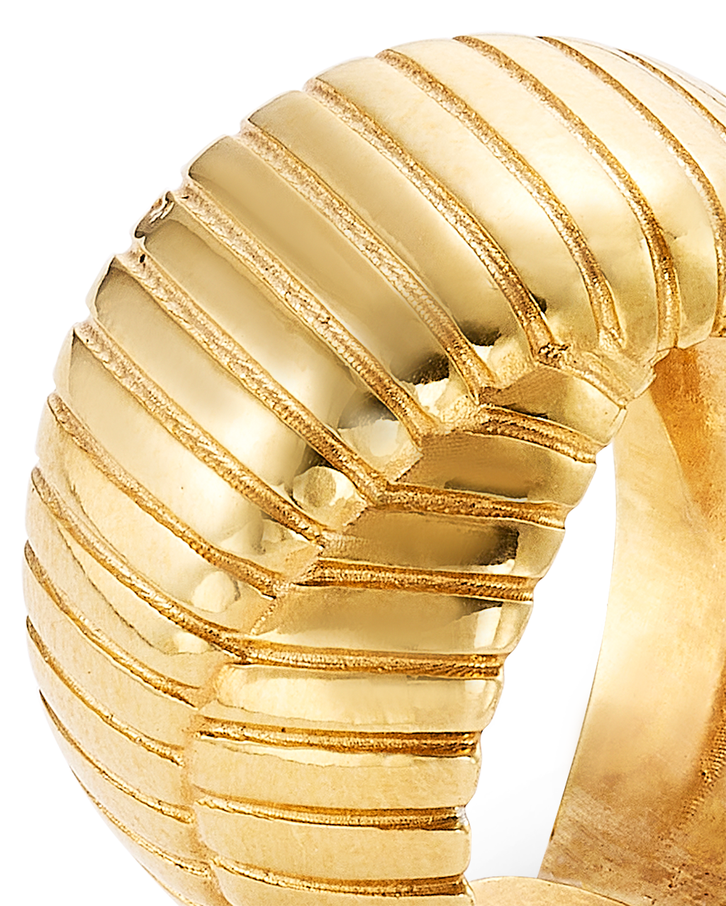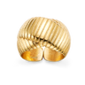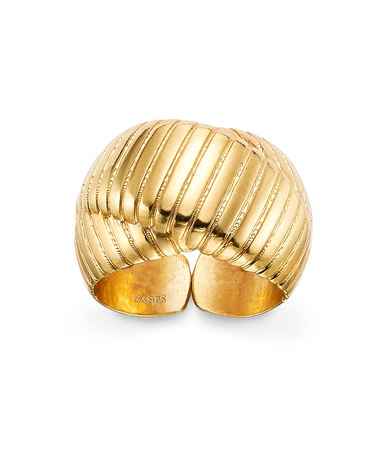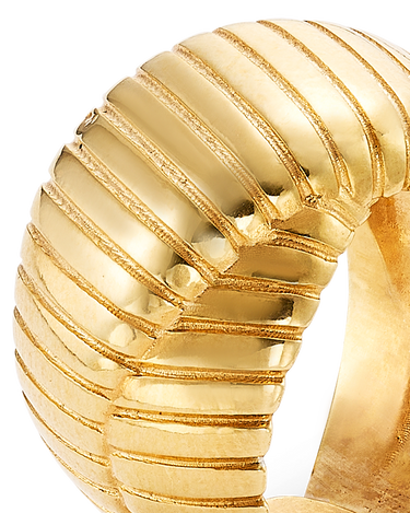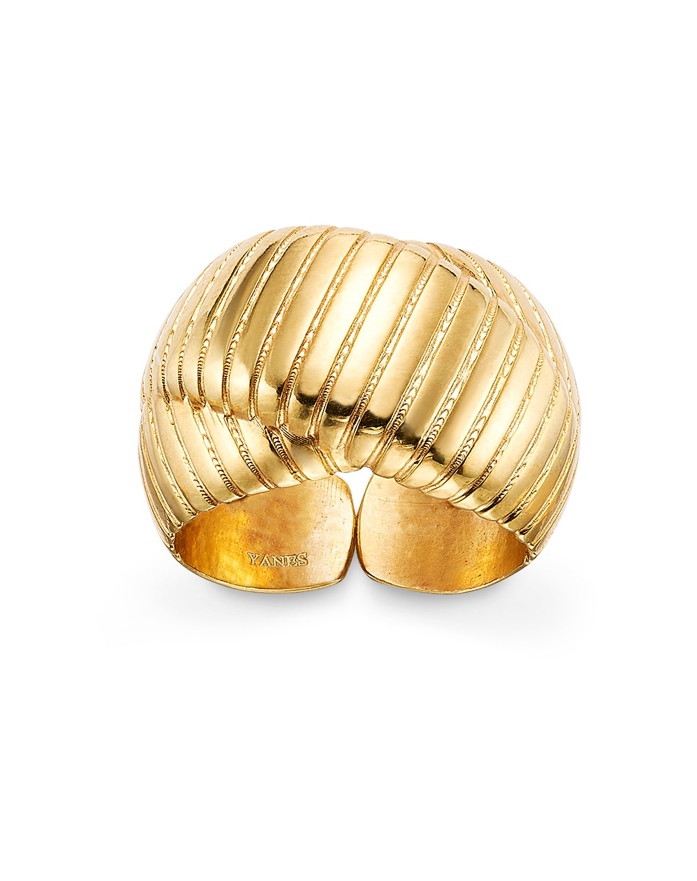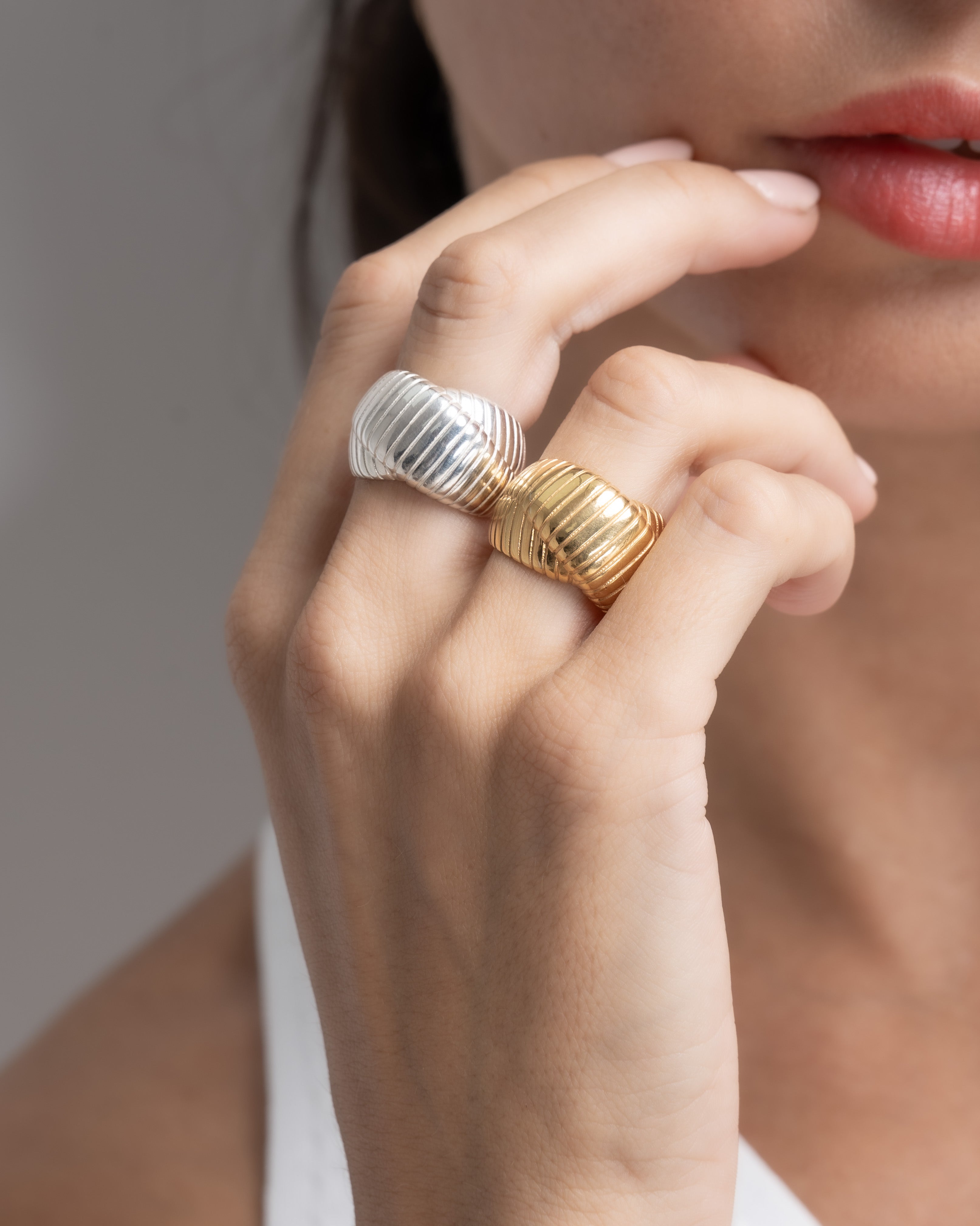 Anillo dos bandas estriadas cruzadas, plata de ley dorada. Ancho 14 mm en disminución. Colección Met.