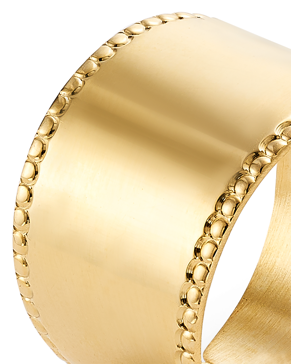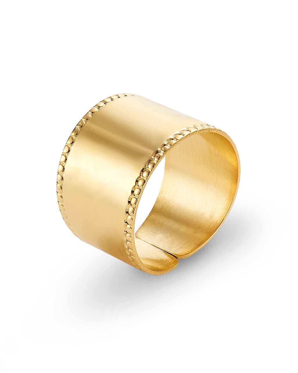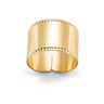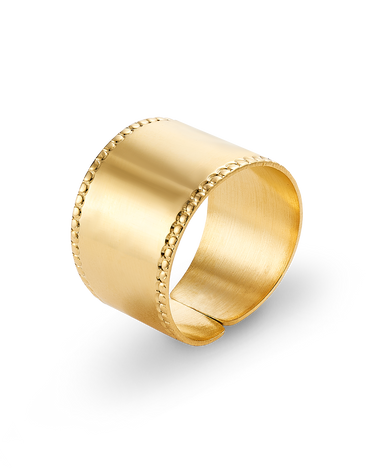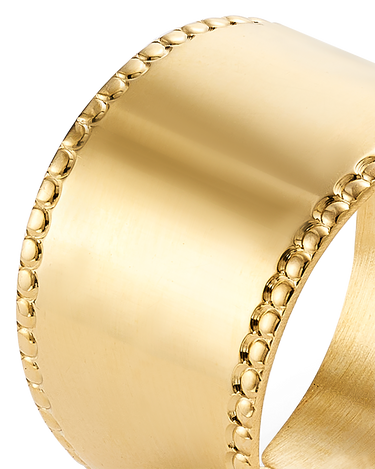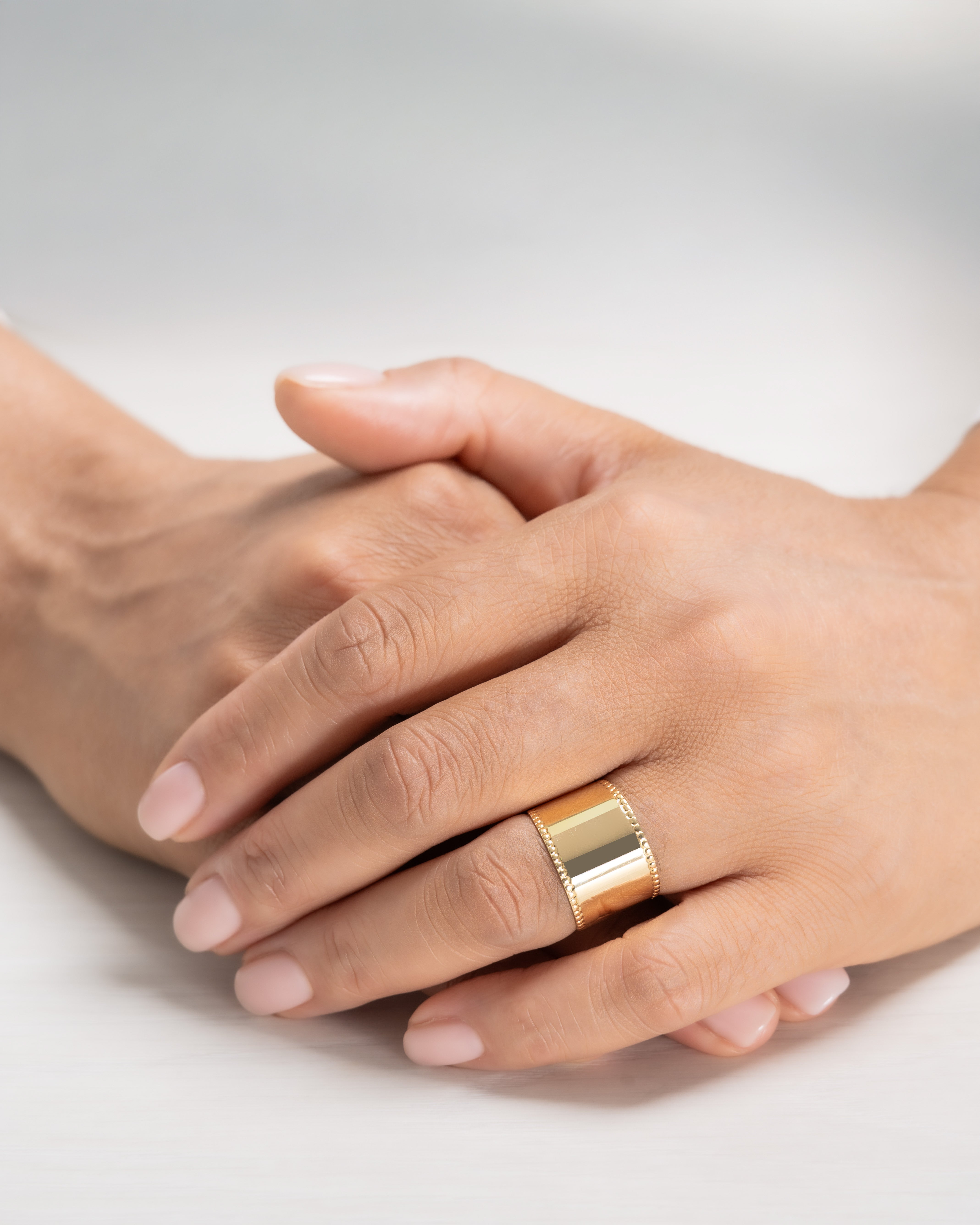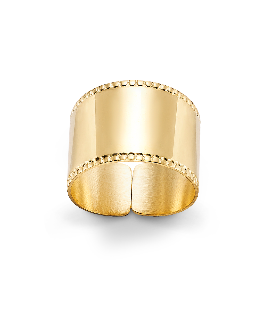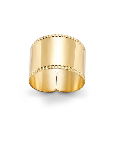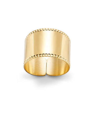 Anillo abierto ancho liso bisel cordón, plata de ley dorada. Ancho 14 mm en disminución. Colección Liceo.