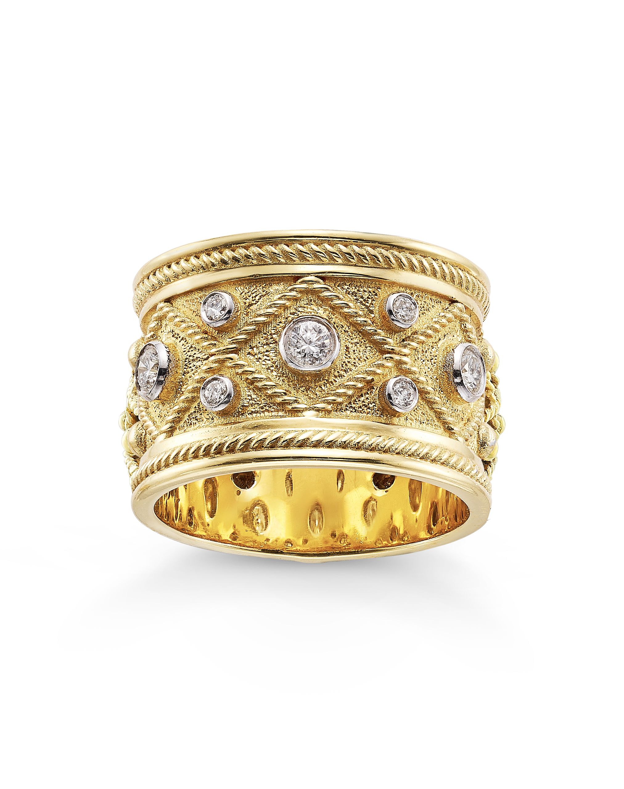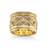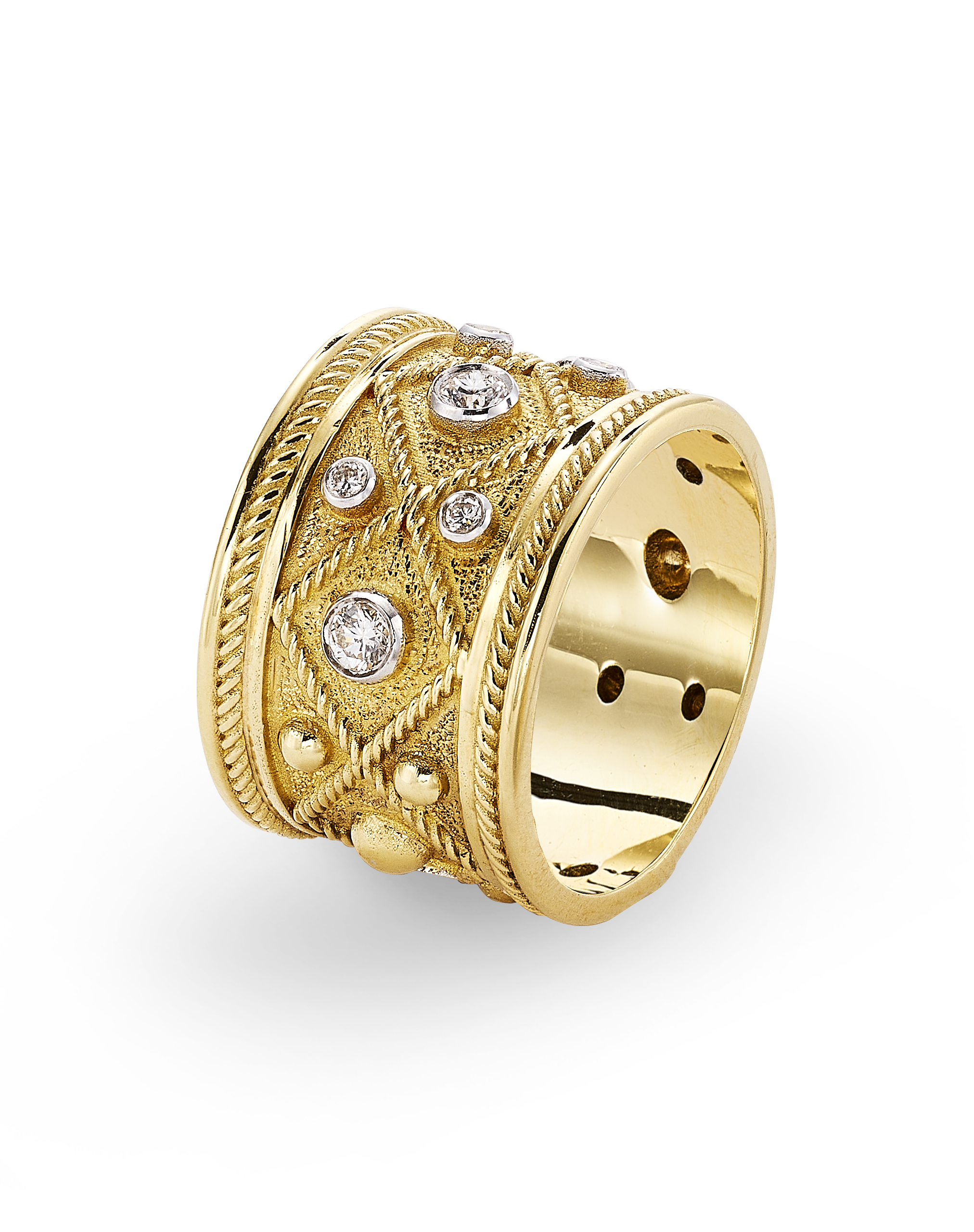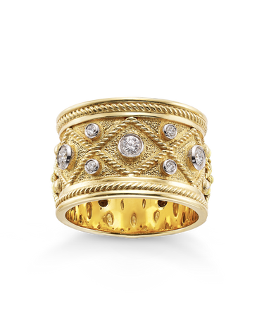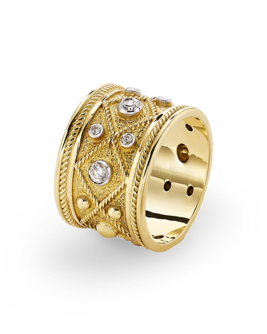 Anillo Tambor con centros de diamantes talla brillante, 7 diamantes talla brillante peso total 0,26 ct. En oro amarillo 18K. Colección Malpica fabricada artesanalmente en nuestros talleres.
