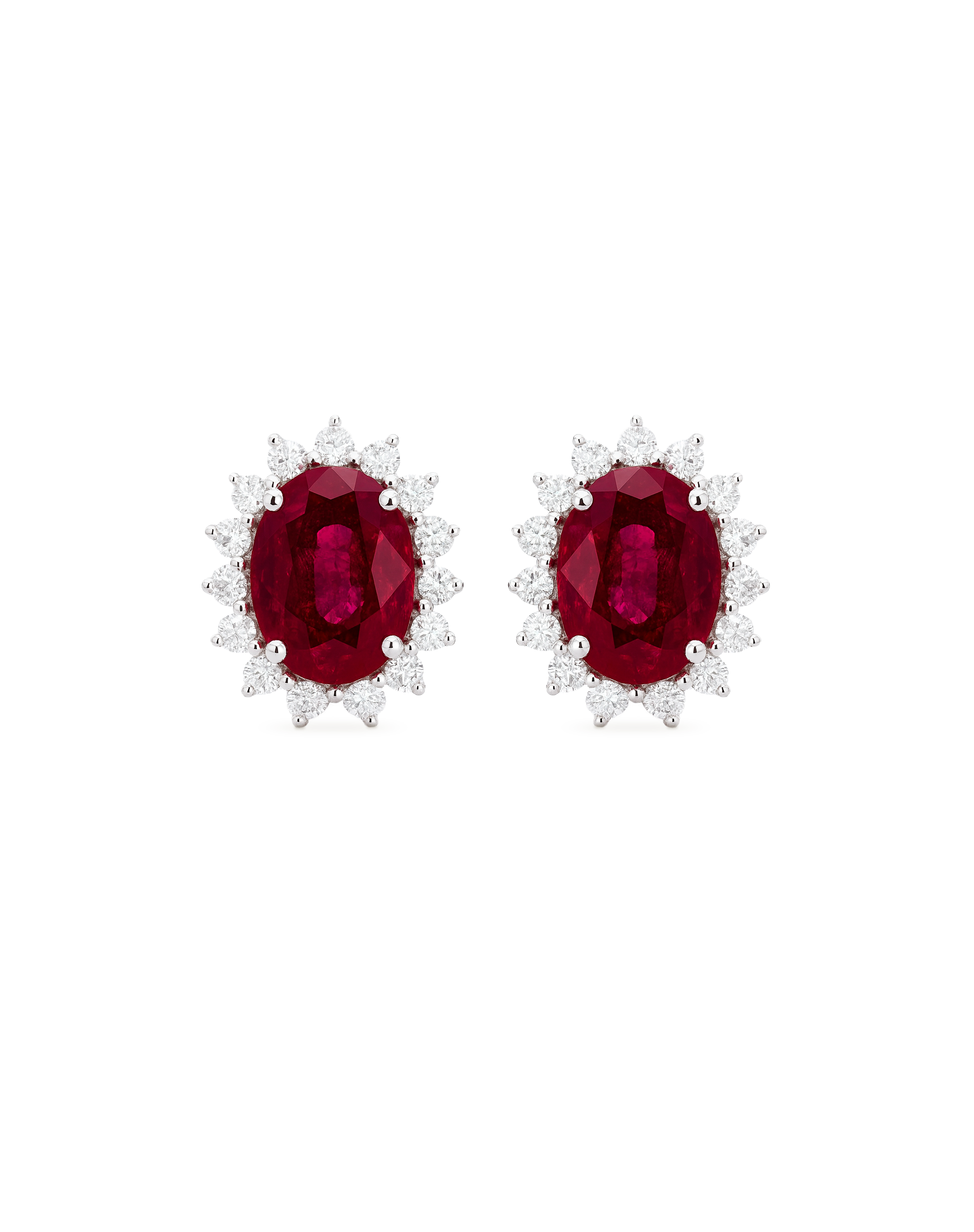 Pendientes rubíes ovales calidad VS, color H de peso 1,85 ct, rodeados de 28 diamantes talla brillante, peso 0,44 ct, oro blanco 18K. Medida 10 x 8 mm.