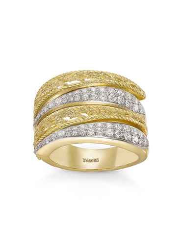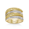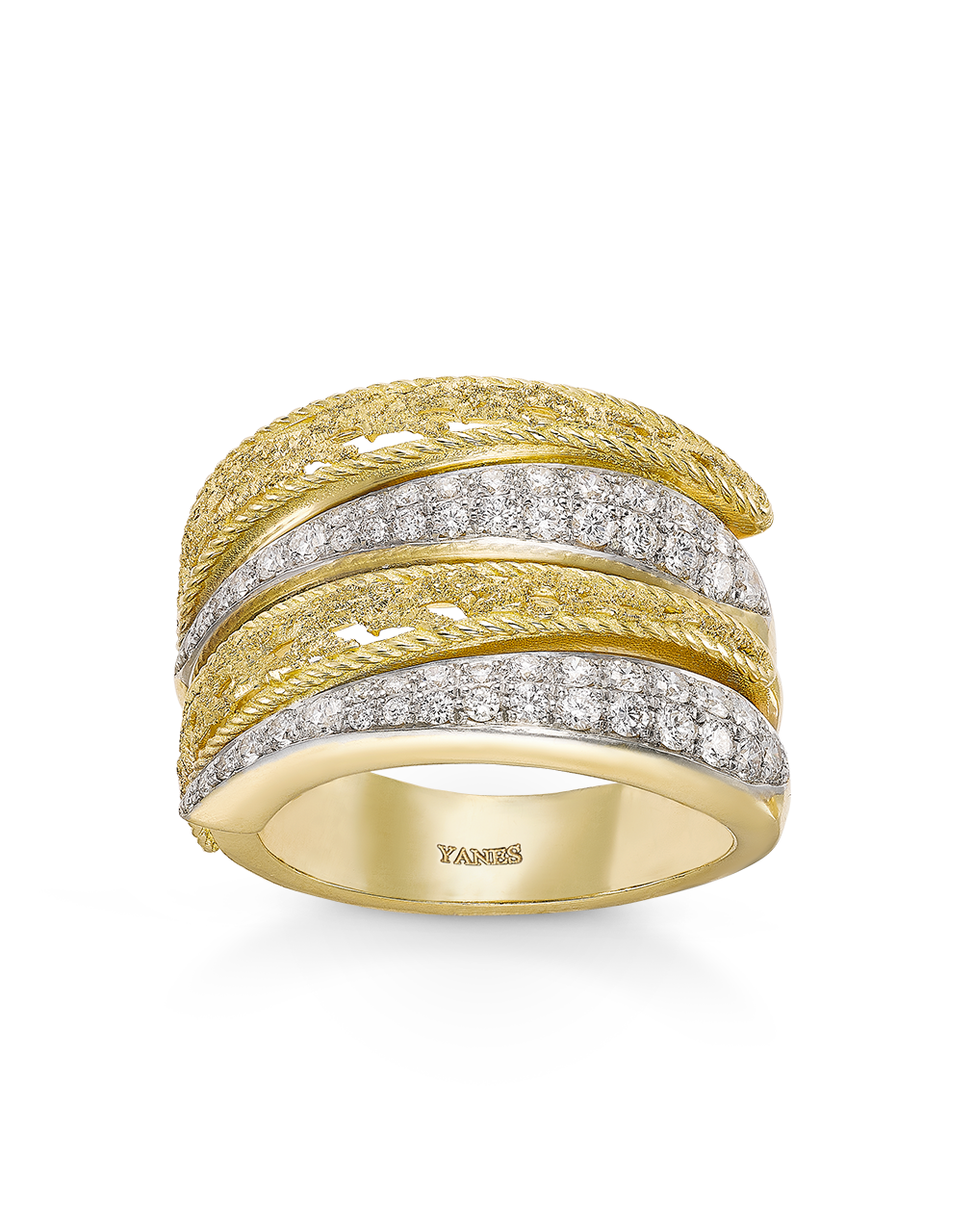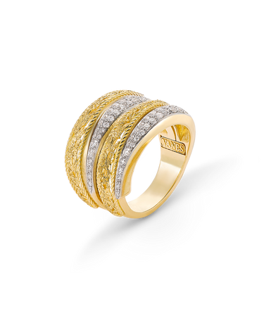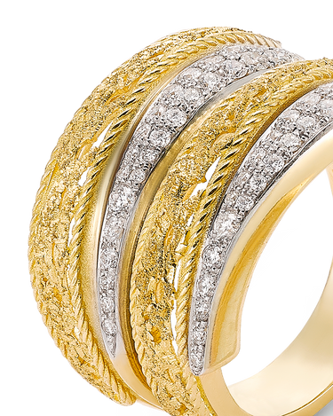 Sortija ancha entrelazando dos alianzas hojivales Alhambra y dos pavé de 54 diamantes talla brillante, peso 0,80 ct. Oro amarillo de 18K. Ancho 16 mm en disminución. Colección Alhambra.