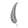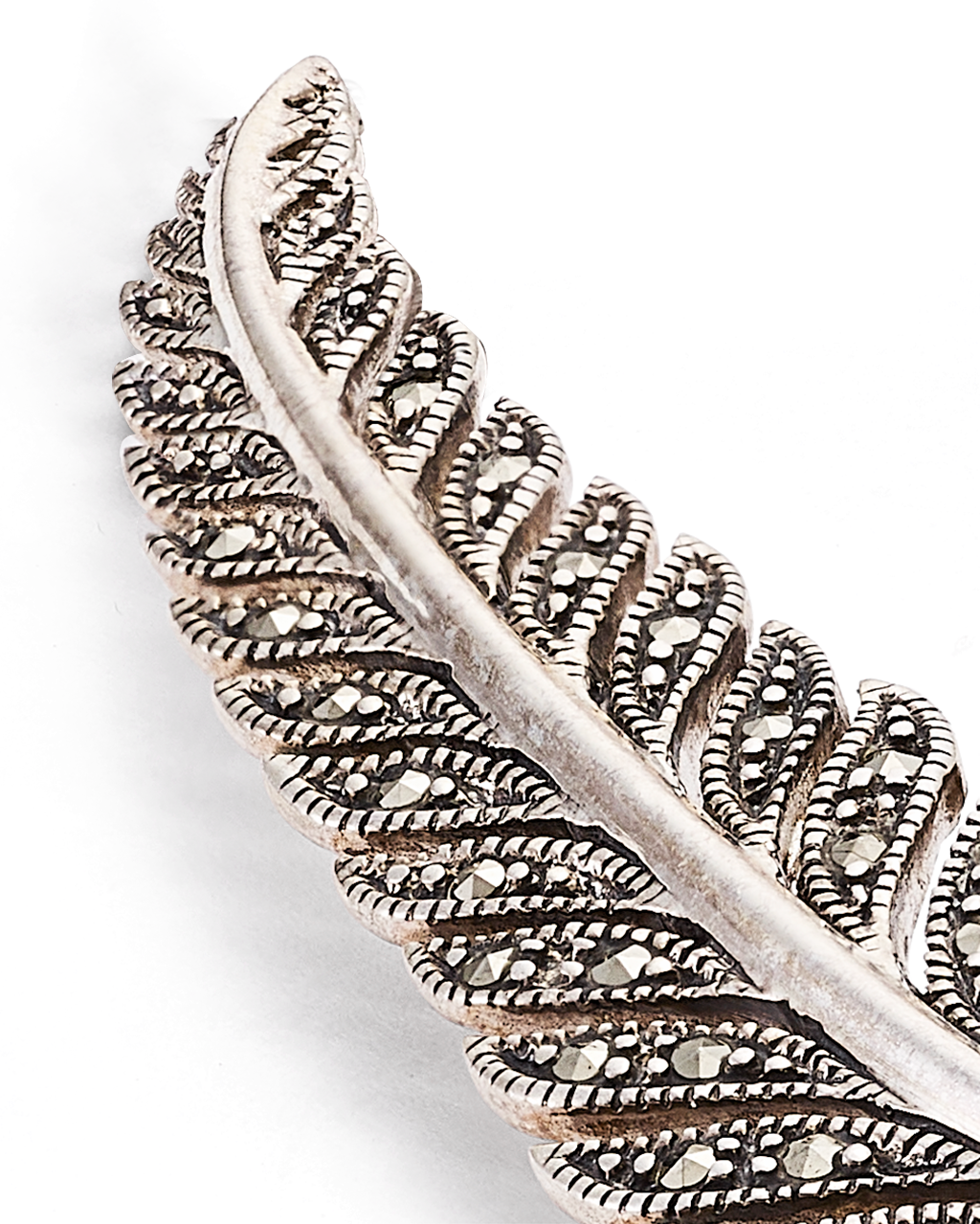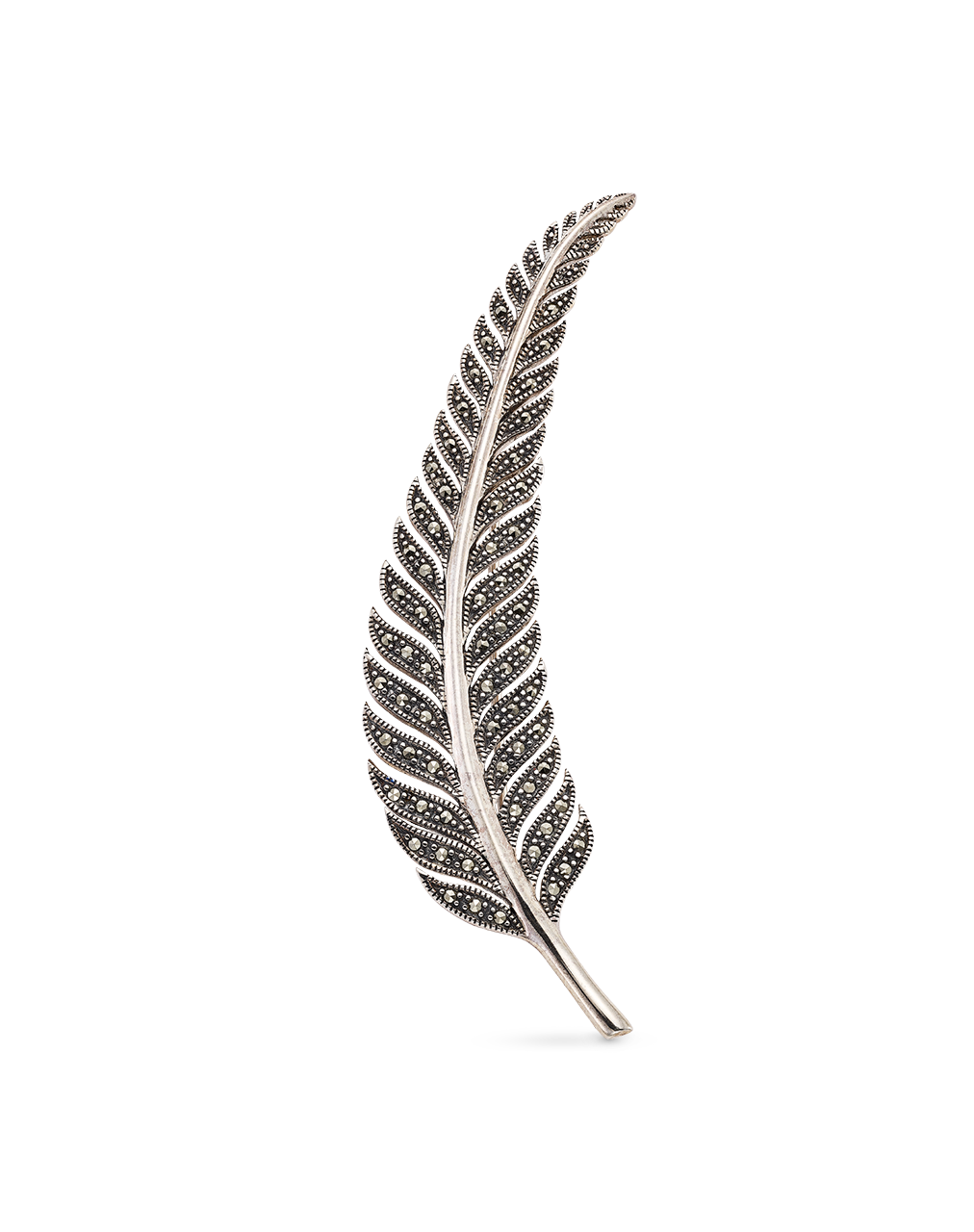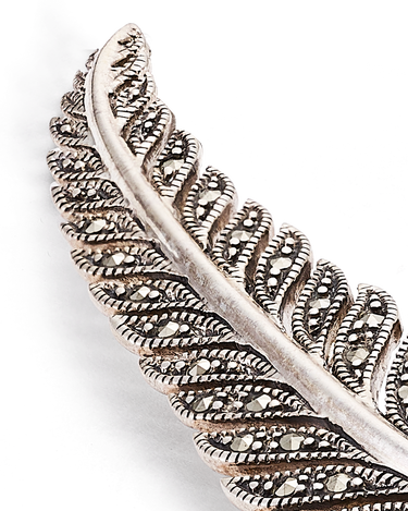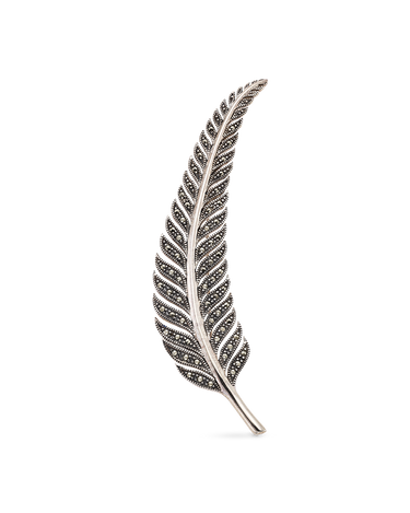 Broche forma pluma, marcasitas, plata de ley. Medida 8 cm, ancho 12 mm en disminución. Colección Viena.