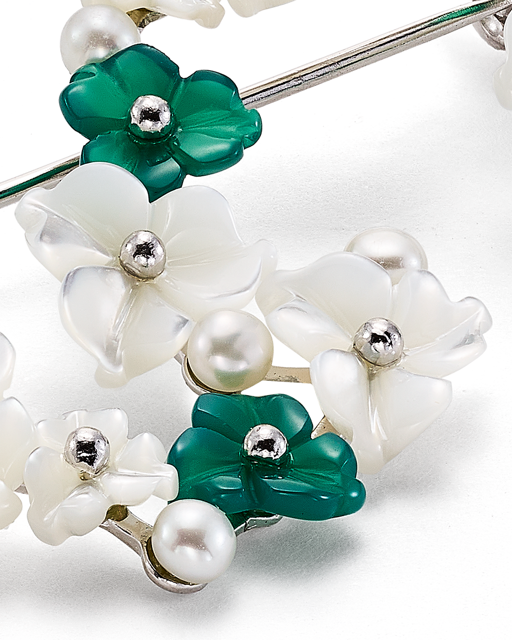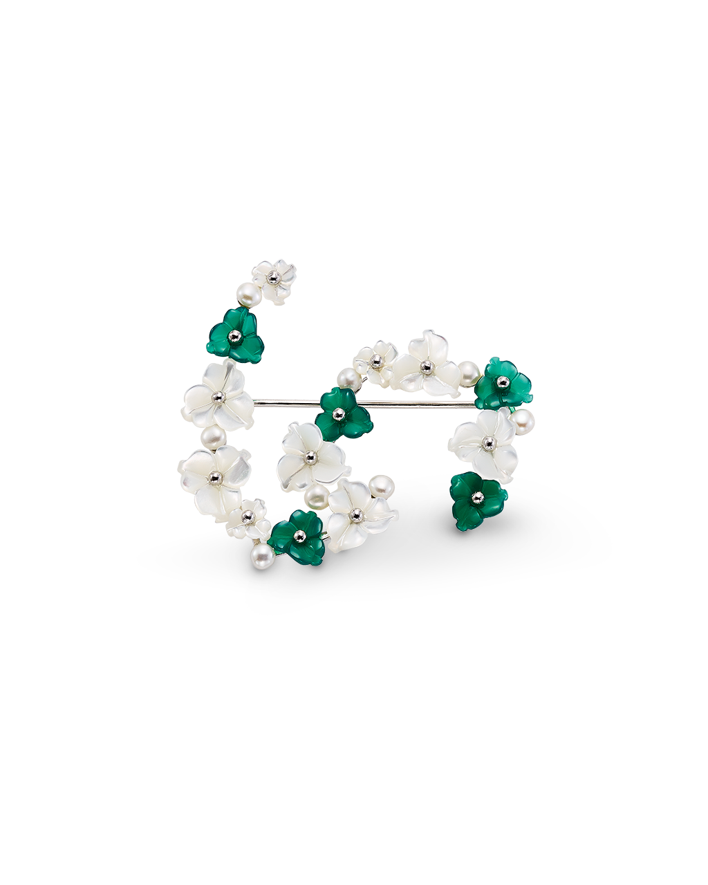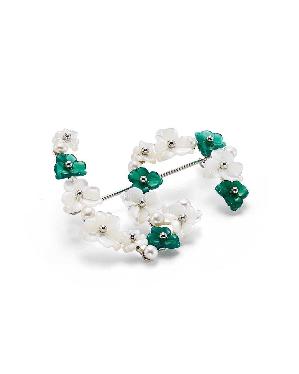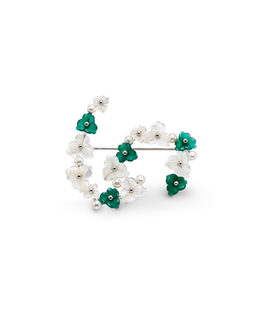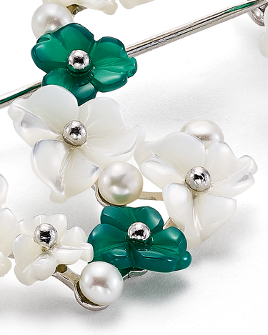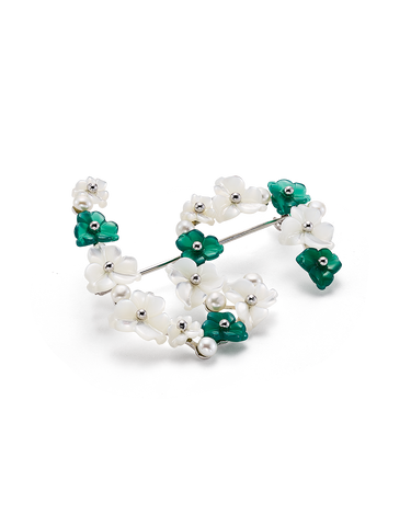Broche ondas flores combinadas ágata verde y nácar, plata de ley. Medida 45 x 40 mm. Colección Scala.