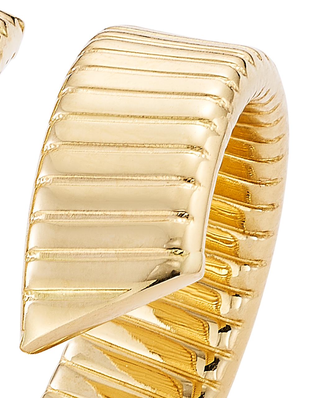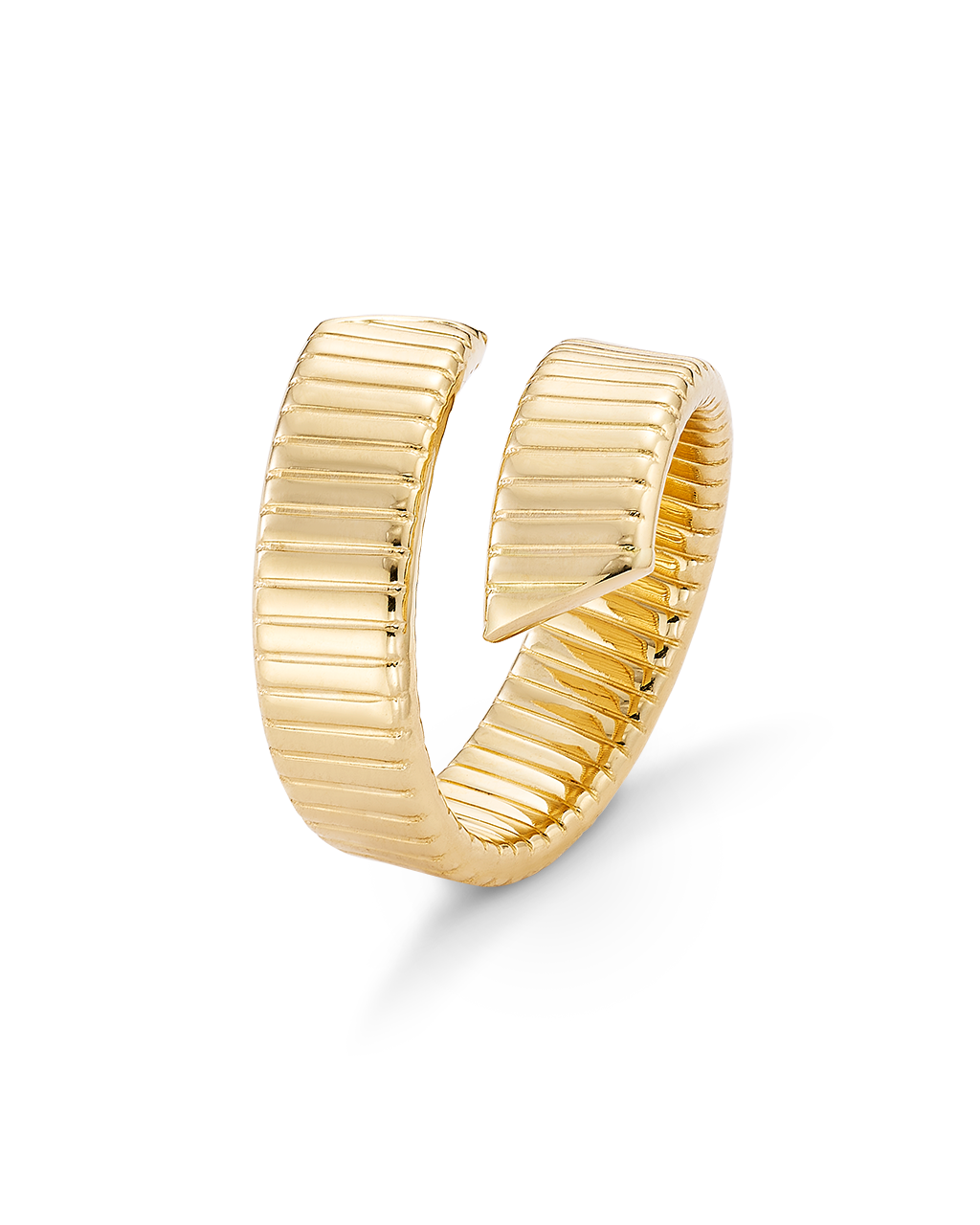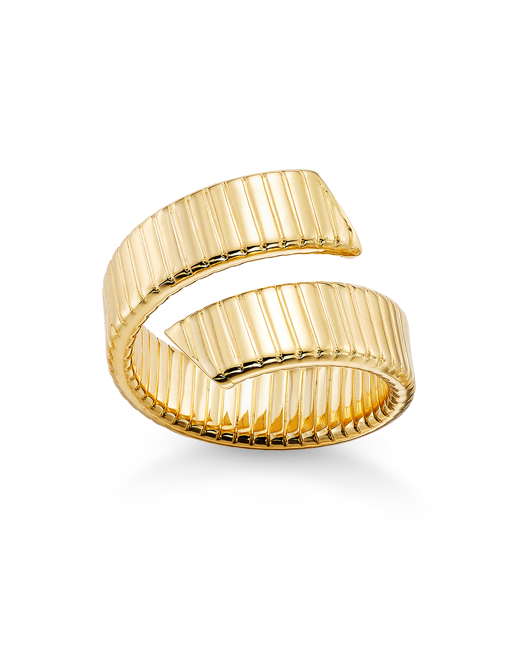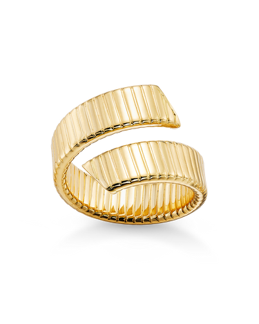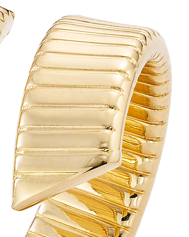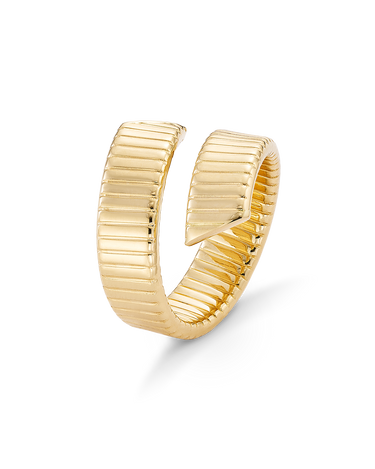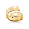 Anillo abierto envolvente rayas labradas. Oro amarillo de 18K, peso 2,22 g. Ancho 15 mm en disminución. Colección City.