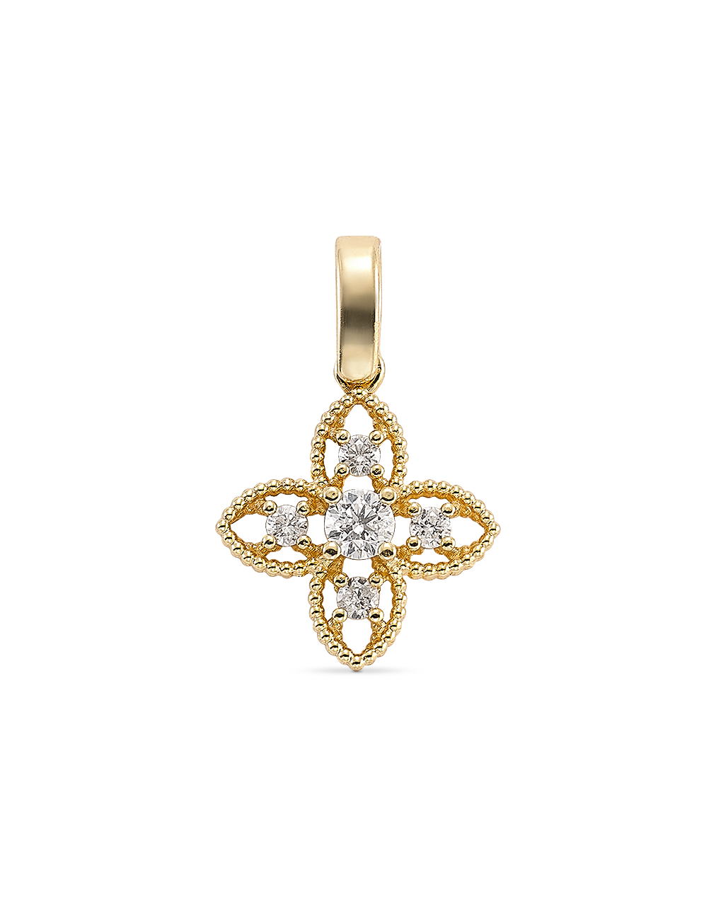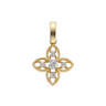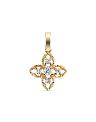 Cruz forma trébol, cinco centros diamantes, peso 0,12 ct, bisel cordón, oro amarillo de 18K. Colección Granada.