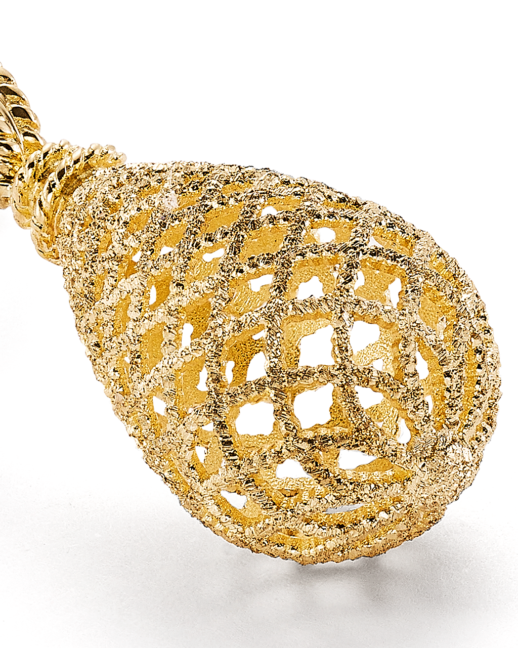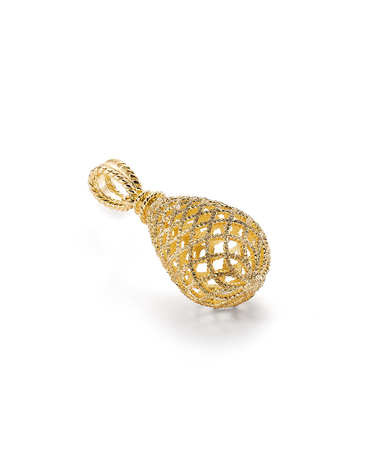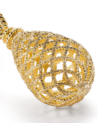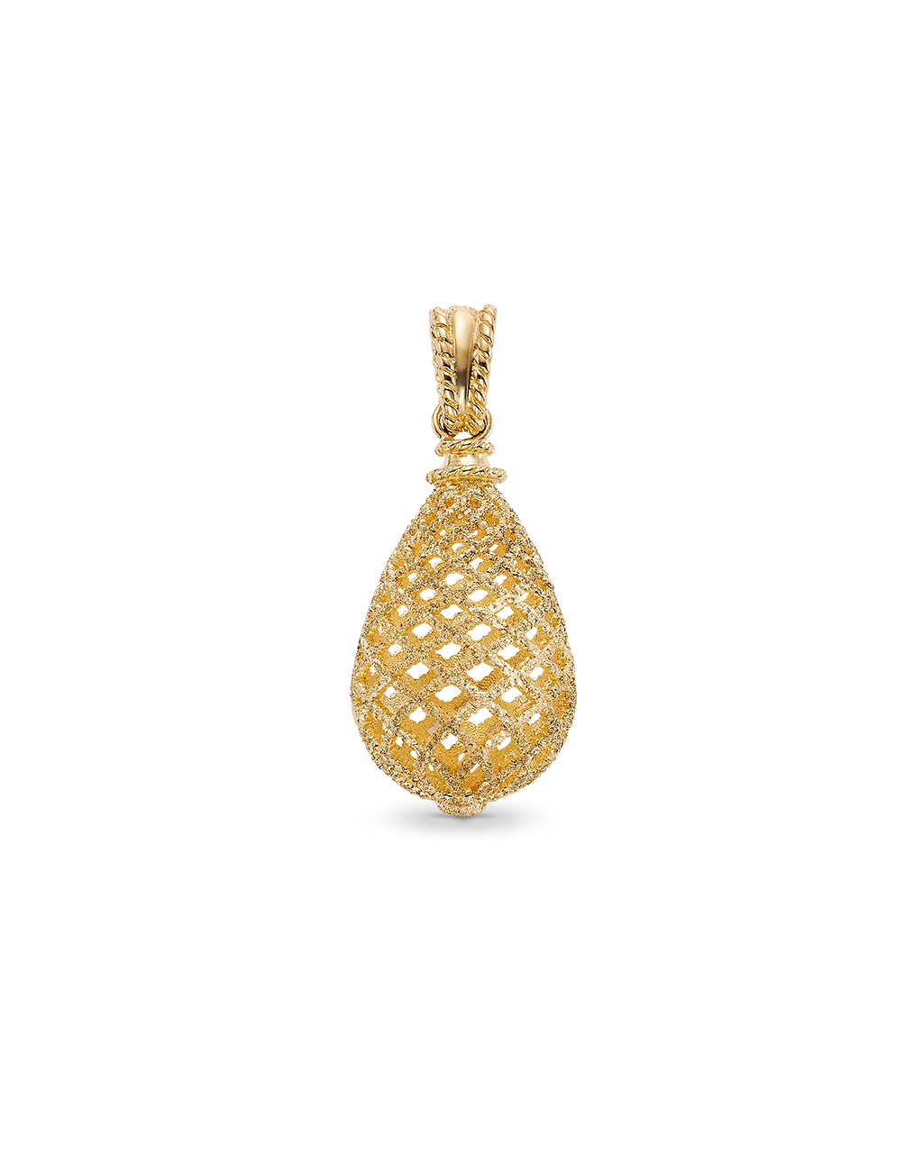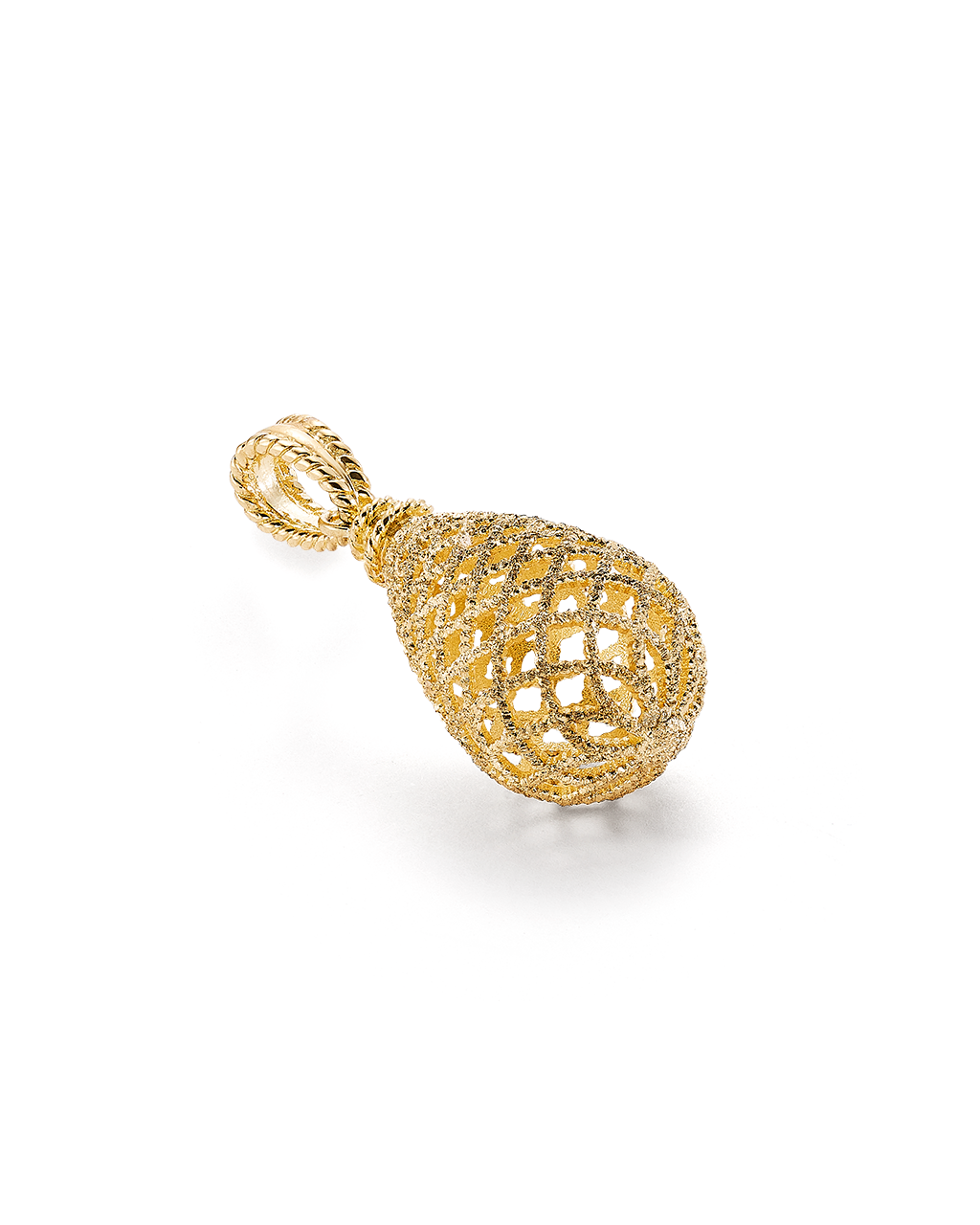 Colgante forma lágrima celosía. Oro amarillo de 18K. Medida total 30 mm. Colección Malpica.
