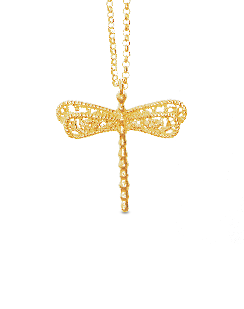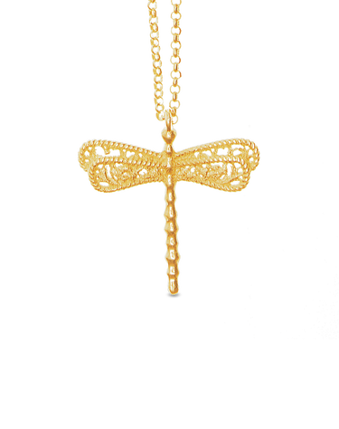 Colgante libélula con cadena, en oro amarillo de 18K. Largo cadena 46 cm. Colgante 18 x 17 mm.