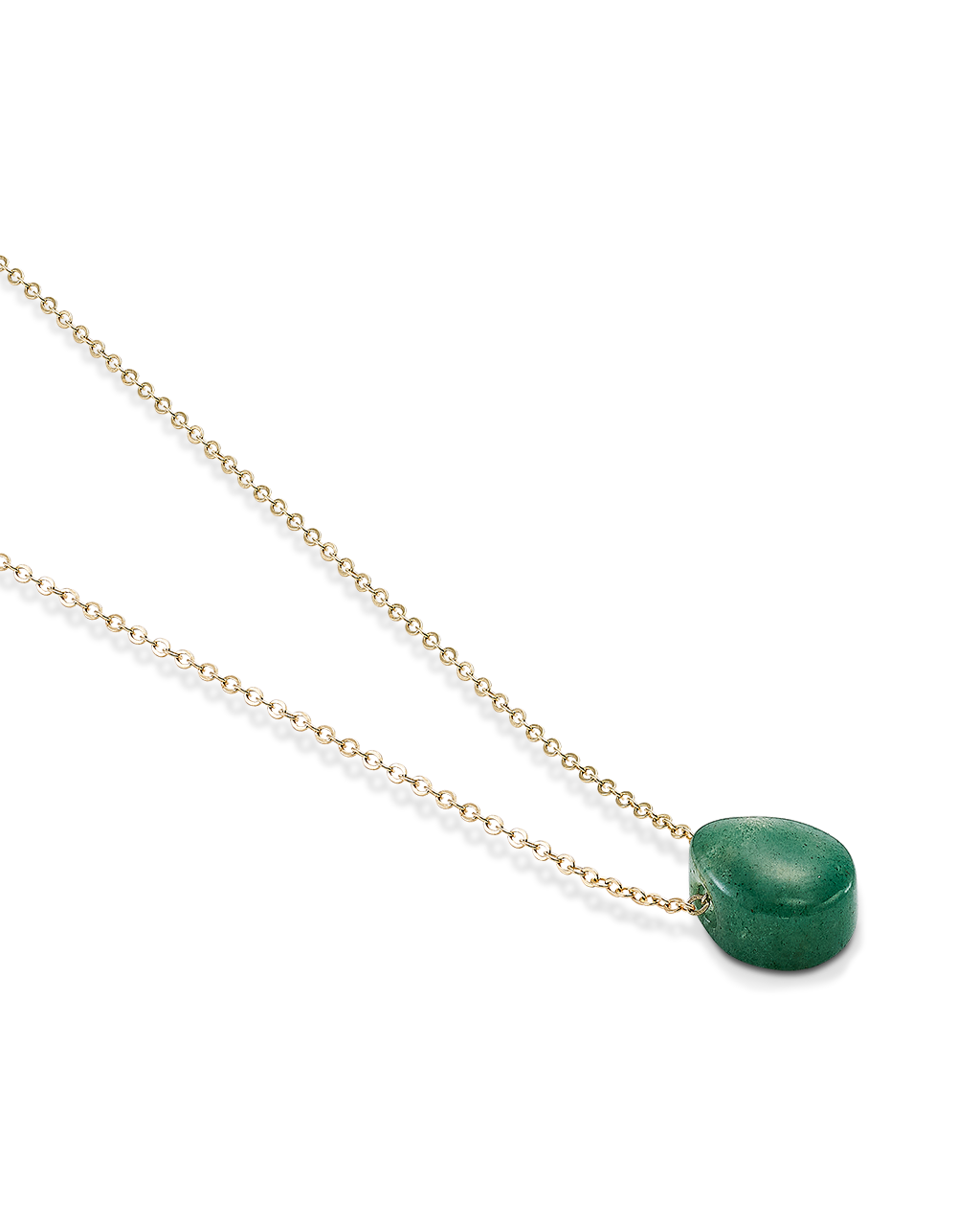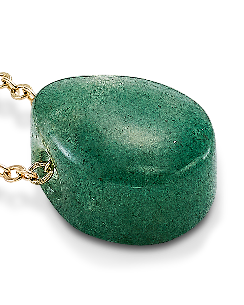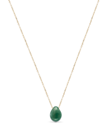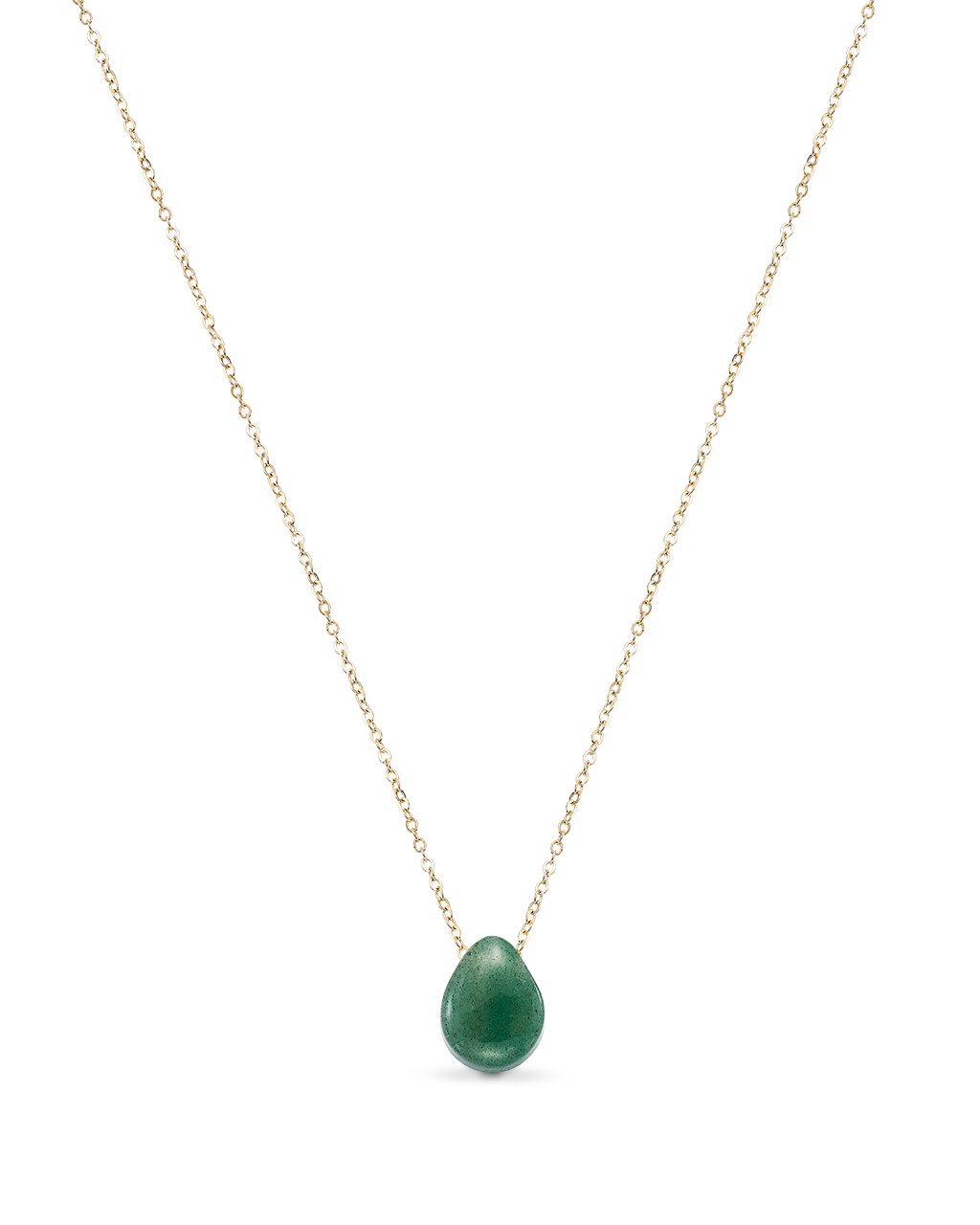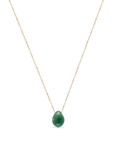 Colgante pera cuarzo verde en cadena terminada en bola cuarzo verde, plata de ley dorada. Medida motivo 10 x 14 mm, largo cadena 45 - 50 cm. Colección Sidney.