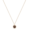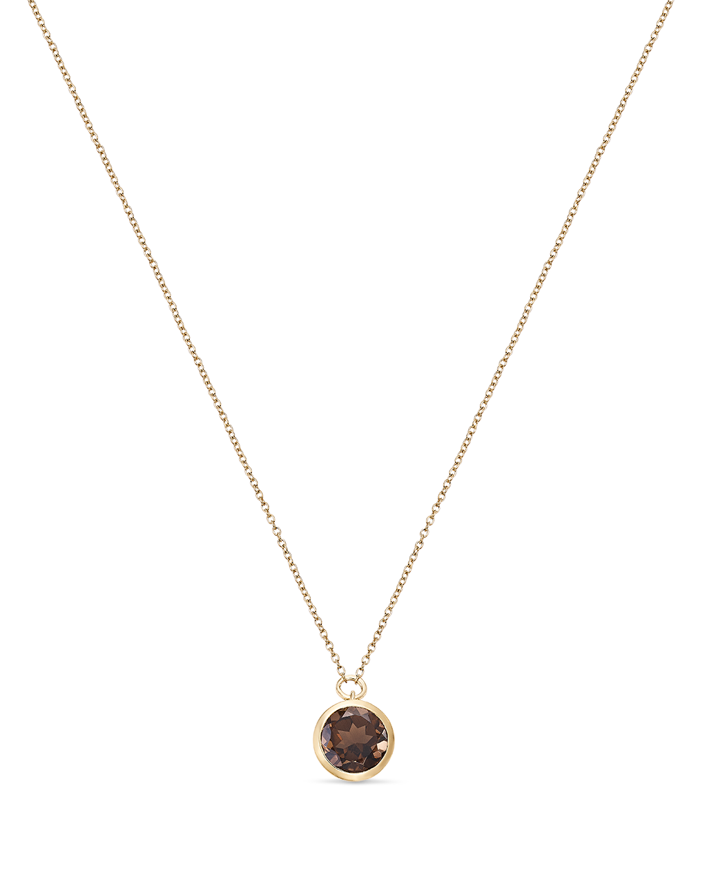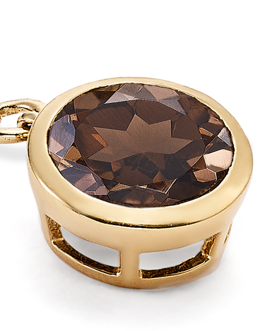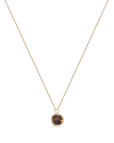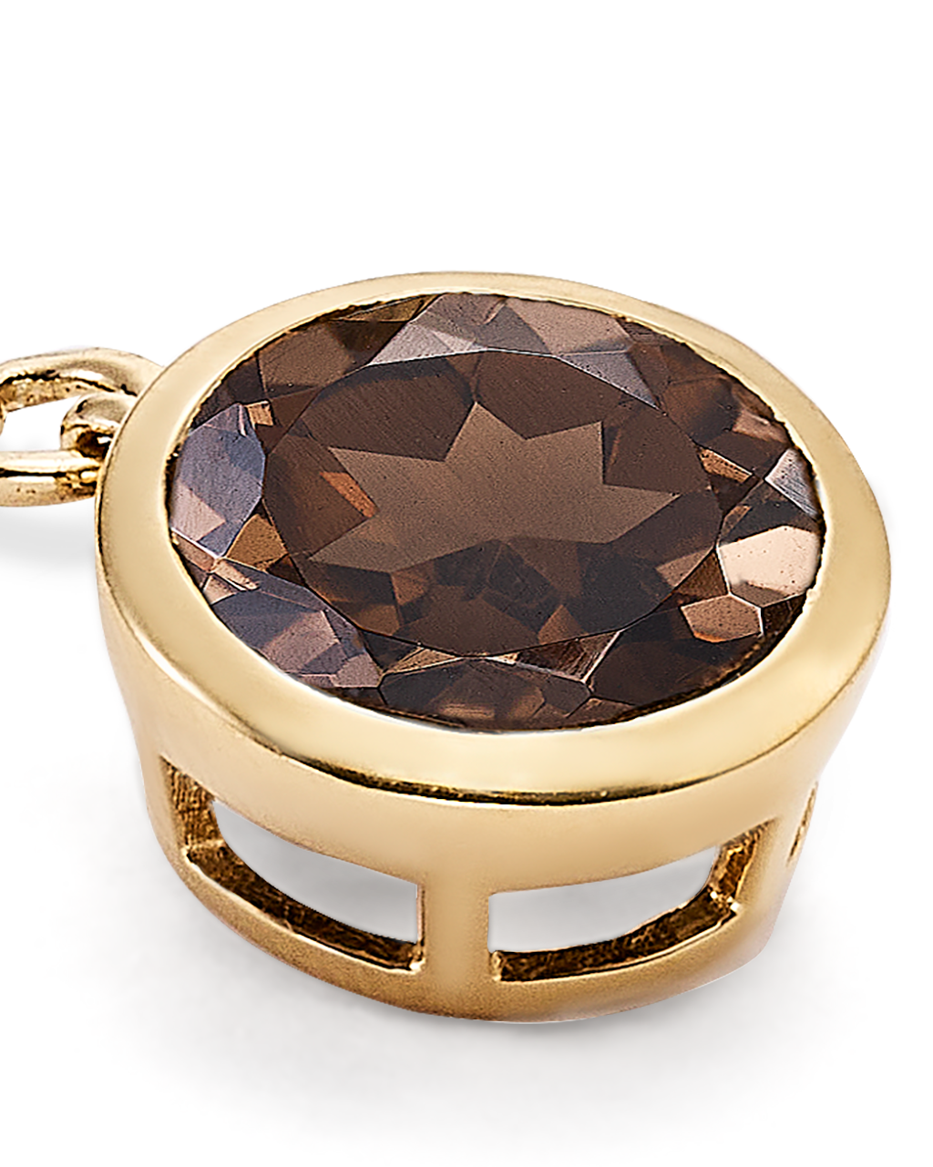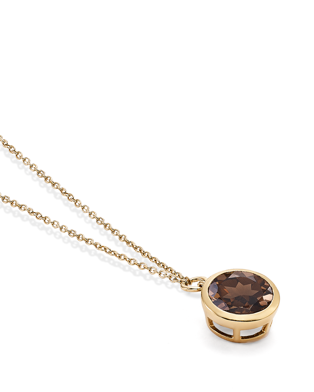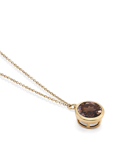 Colgante cuarzo fumé en chatón, con cadena, plata de ley dorada. Diámetro 12 mm, largo cadena 45 cm. Colección Princesa.