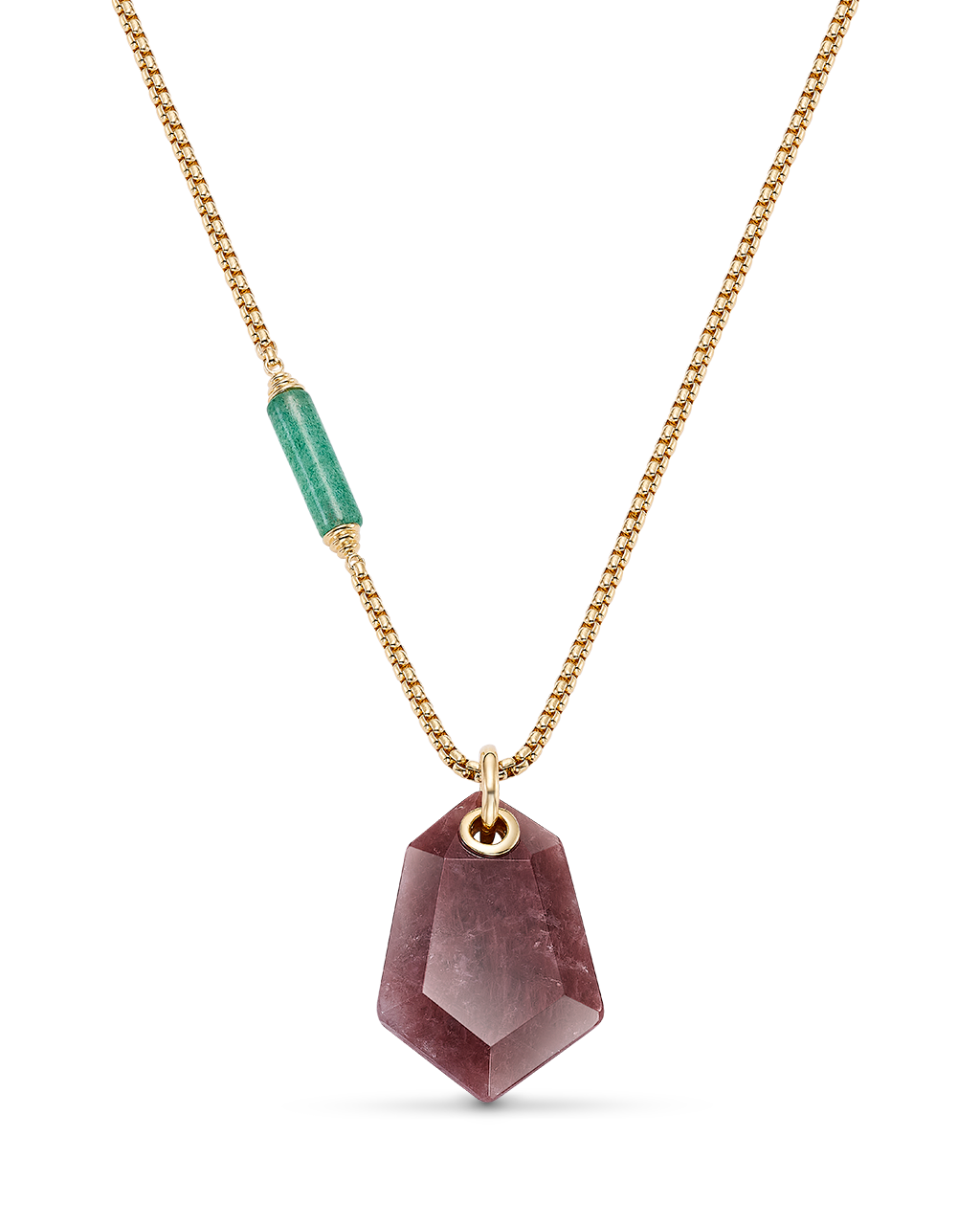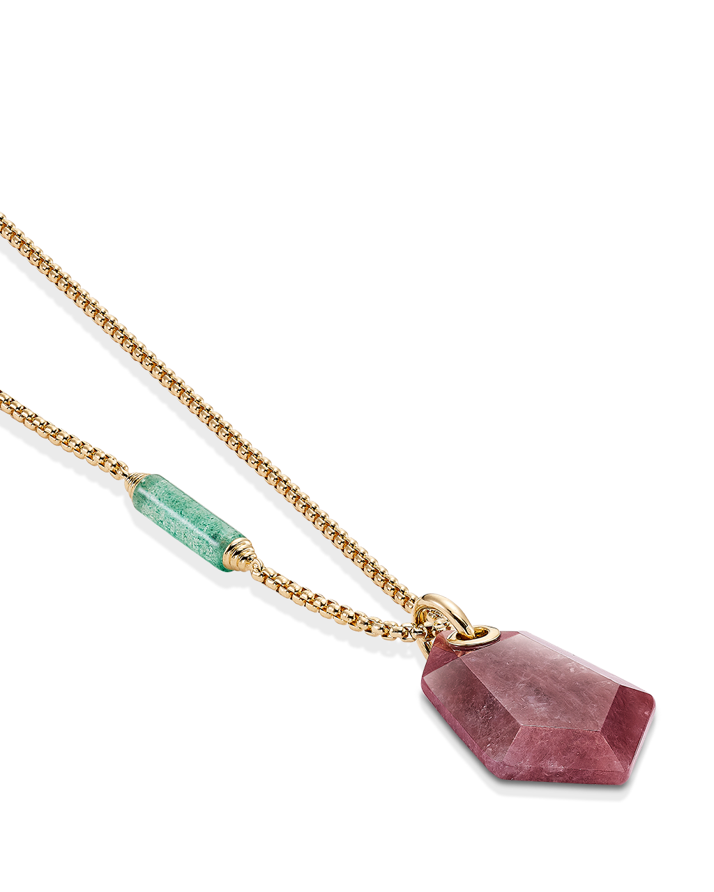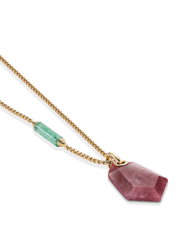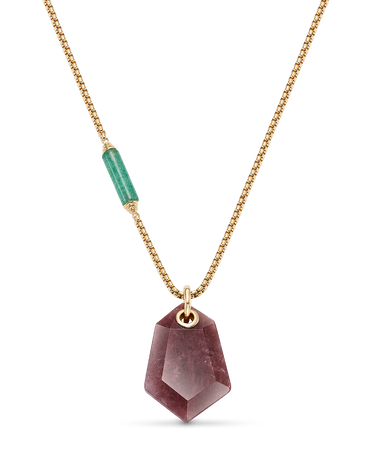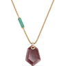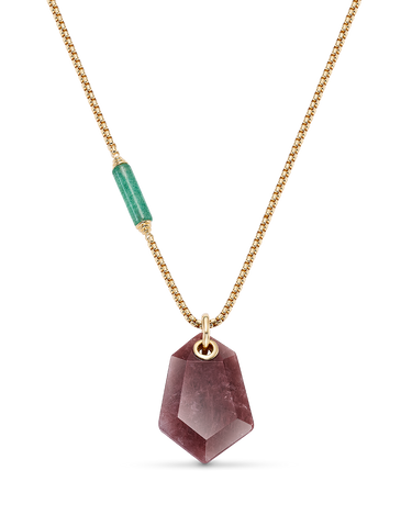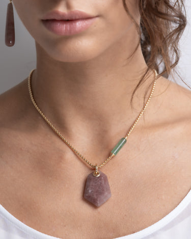 Colgante cuarzo rojo forma hexagonal, cadena con barrilete cuarzo verde, plata de ley dorada. Medida centro 35 x 25 mm, cadena 45 - 50 cm. Colección Sidney.