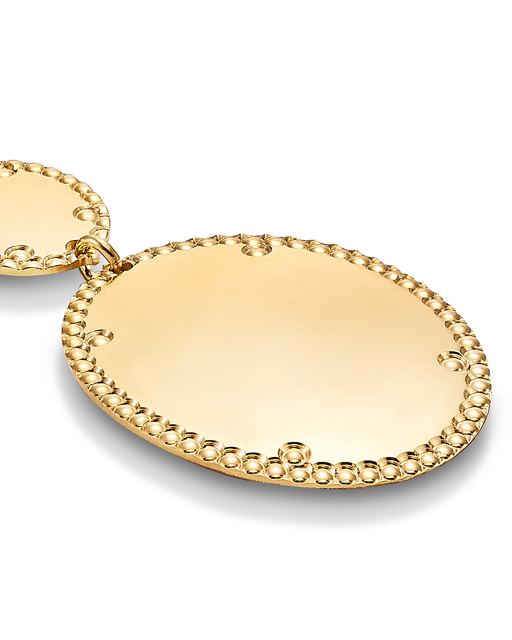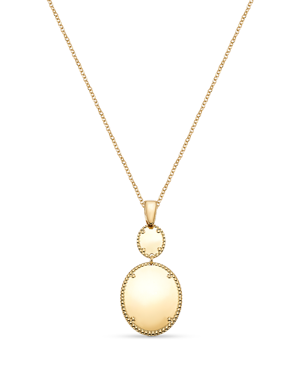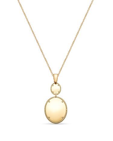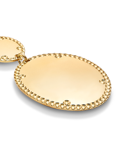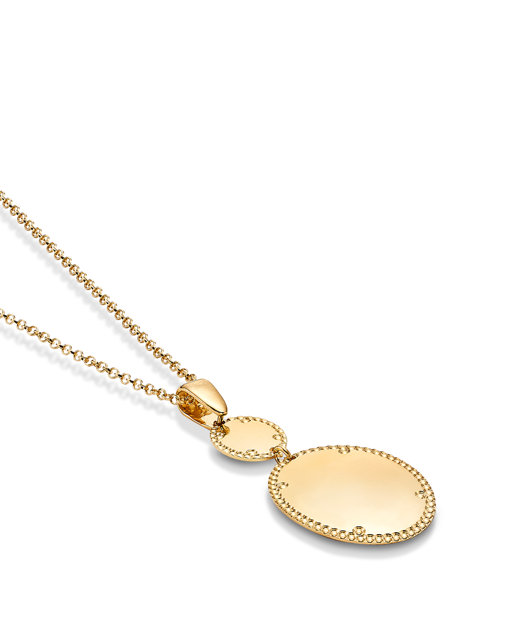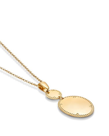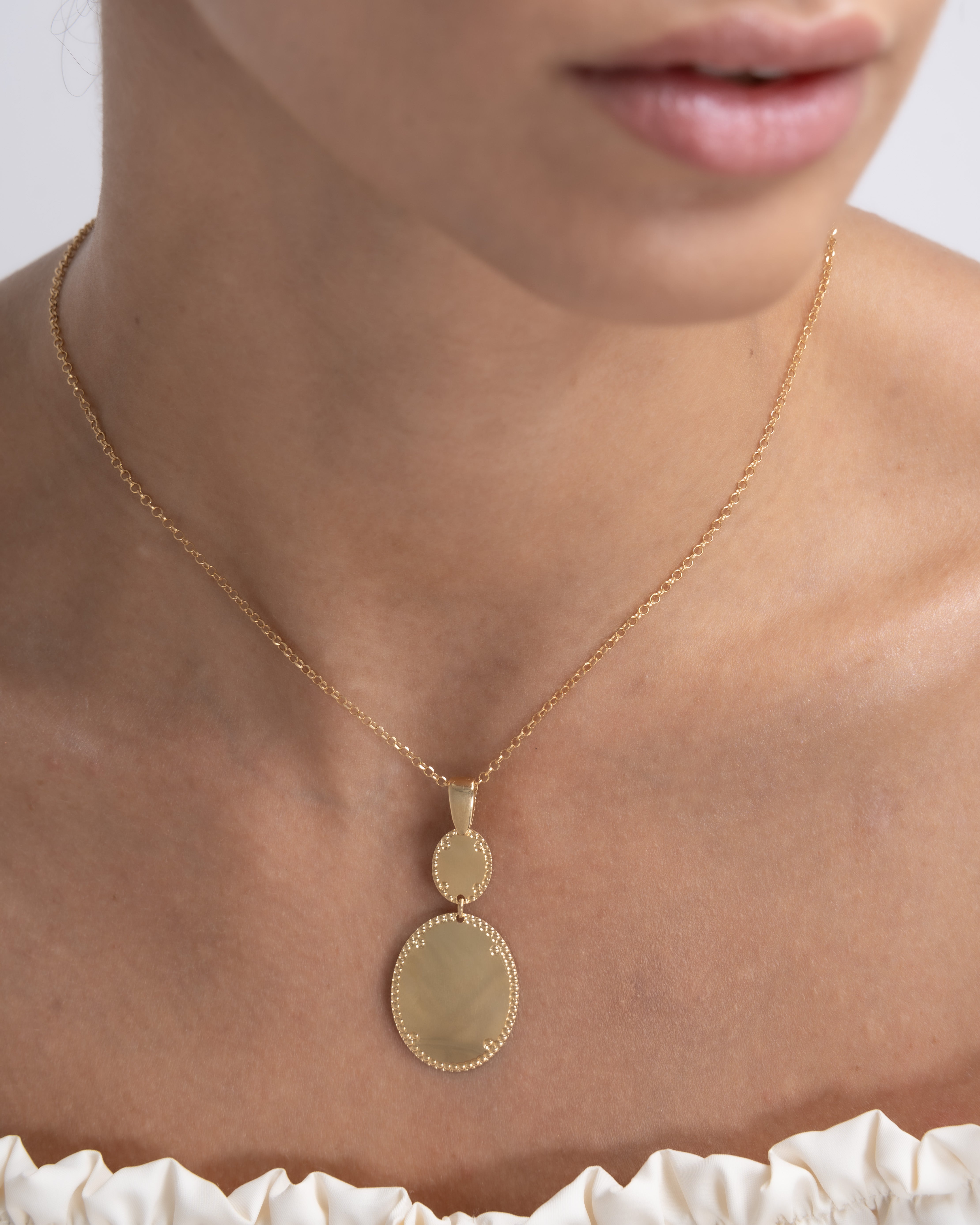 Colgante dos centros ovalados bisel cordón, plata de ley dorada. Medida centro 46 mm x 26 mm ancho en disminución, largo cadena 42 - 45 cm. Colección Liceo.