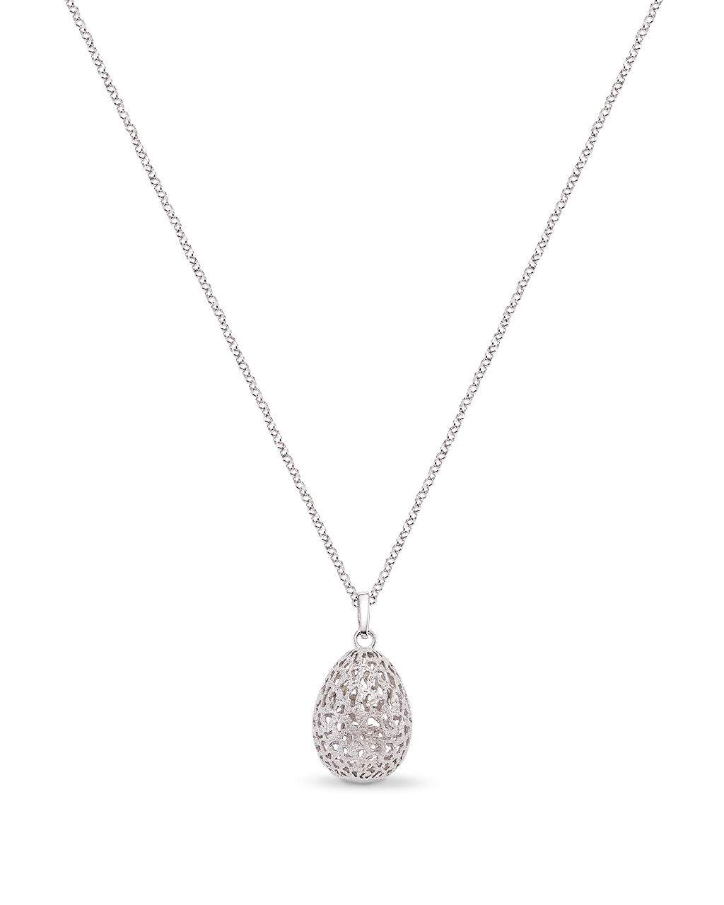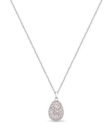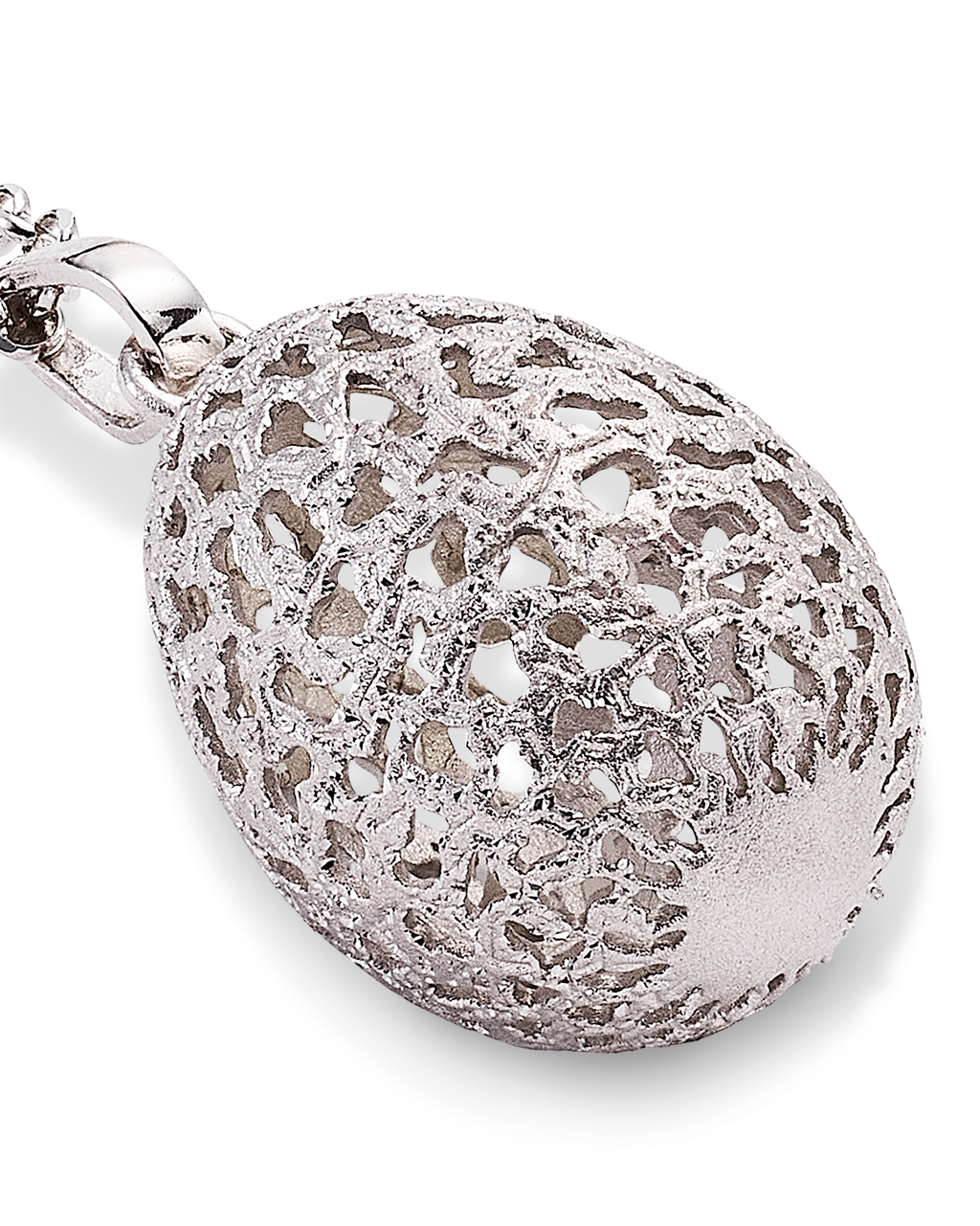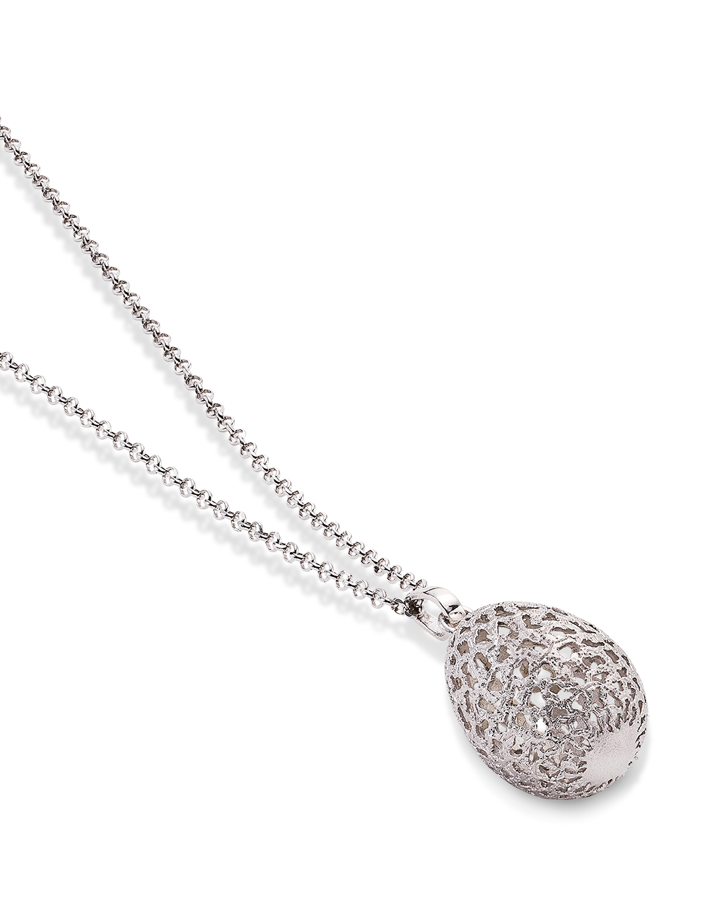 Colgante forma huevo filigrana acabado polvo diamante, con cadena, plata de ley. Medida 22 x 16 mm, largo cadena 45 cm. Colección Bolshoi.