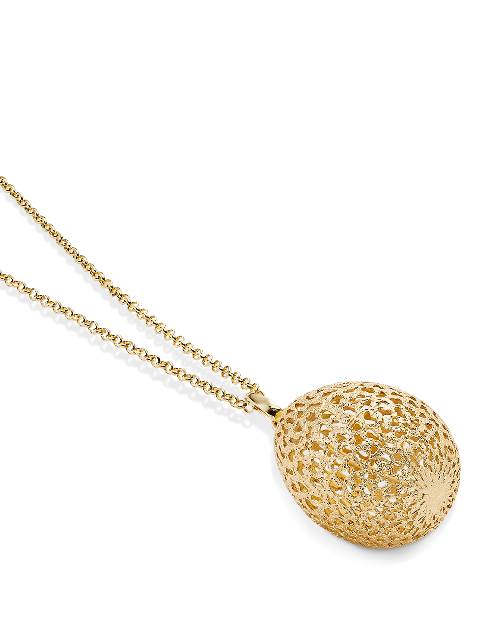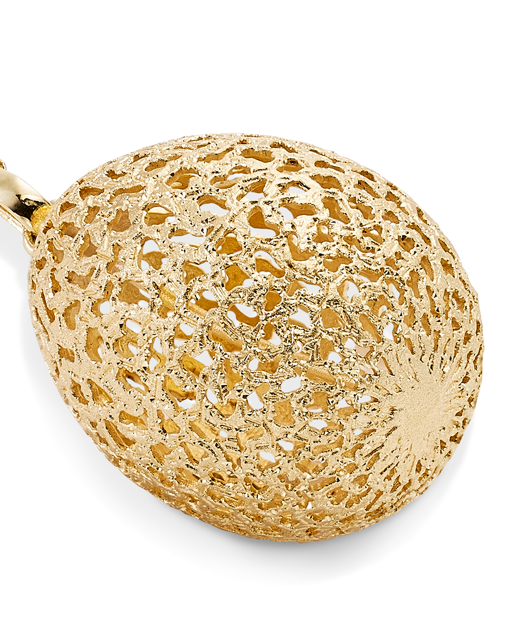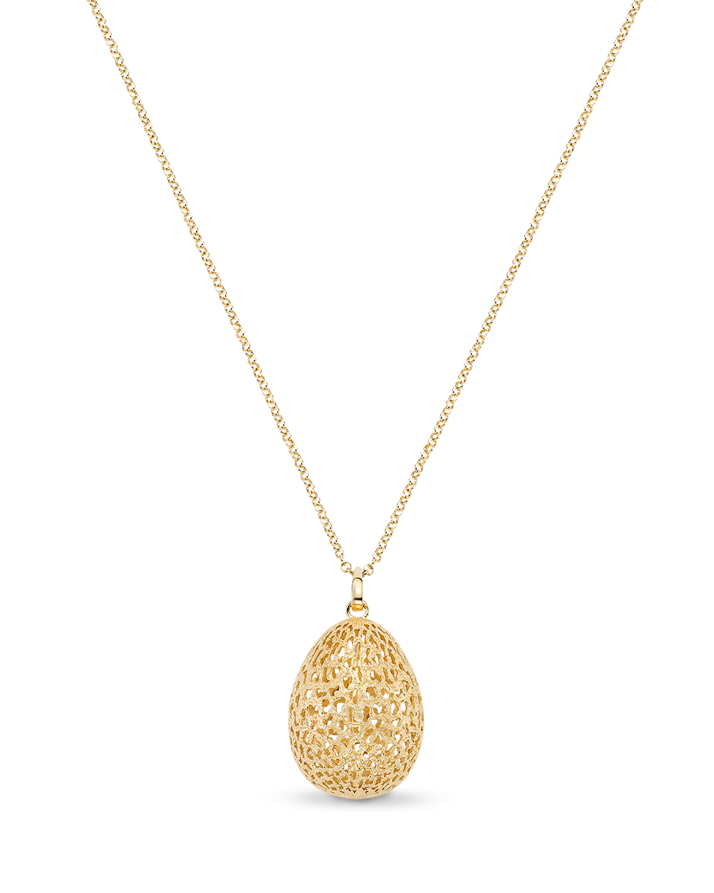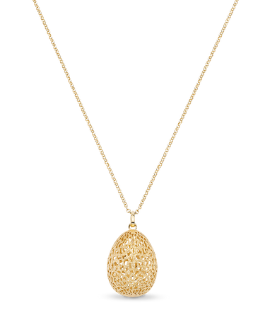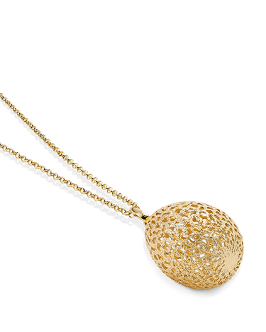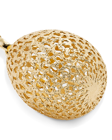 Colgante forma huevo filigrana acabado polvo diamante, con cadena, plata de ley dorada. Medida 30 x 23 mm, largo cadena 90 cm. Colección Bolshoi.