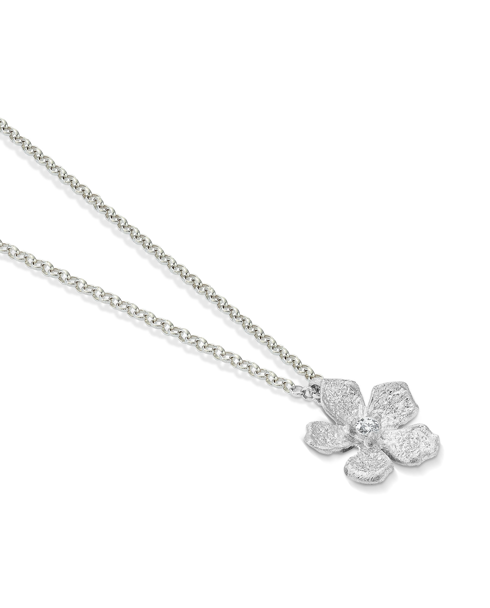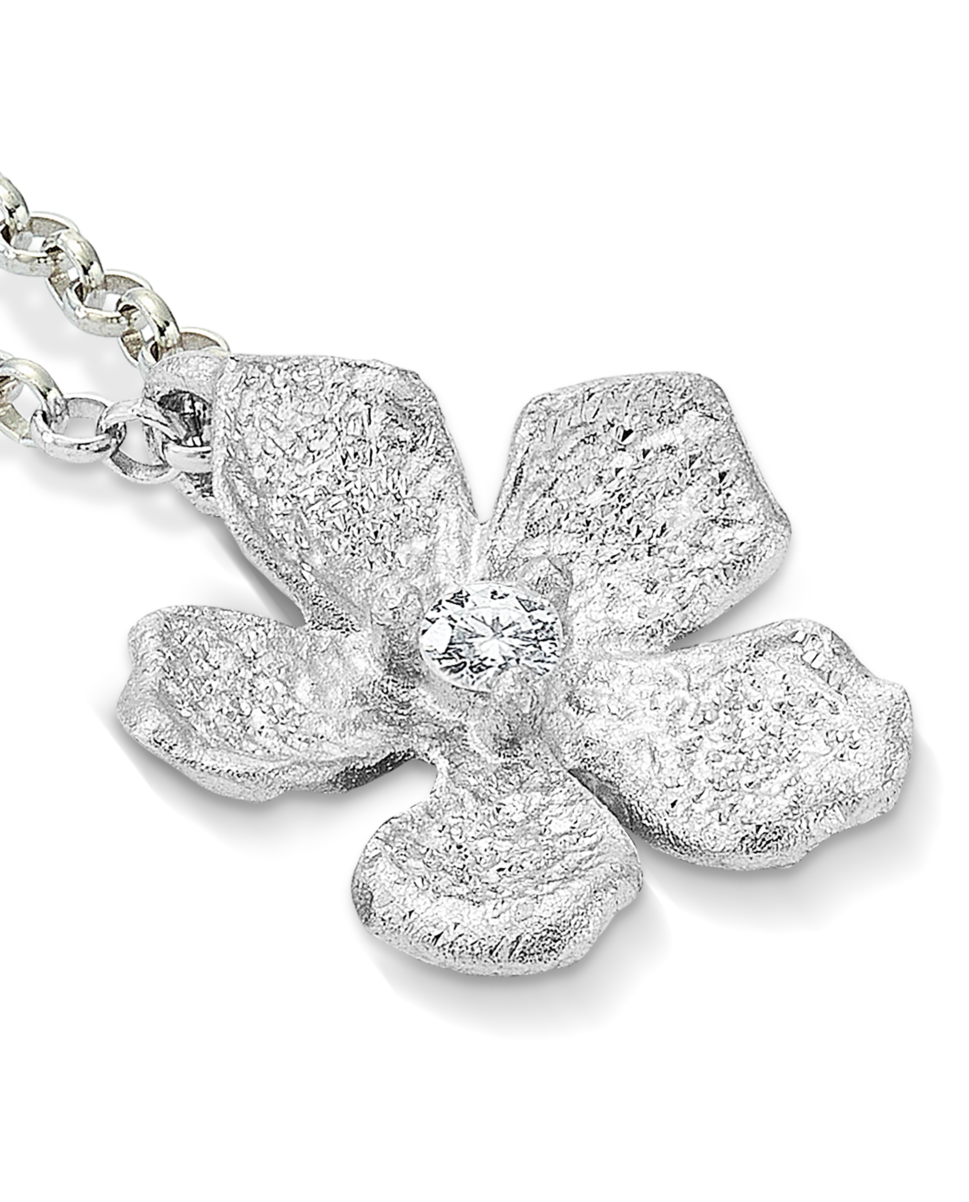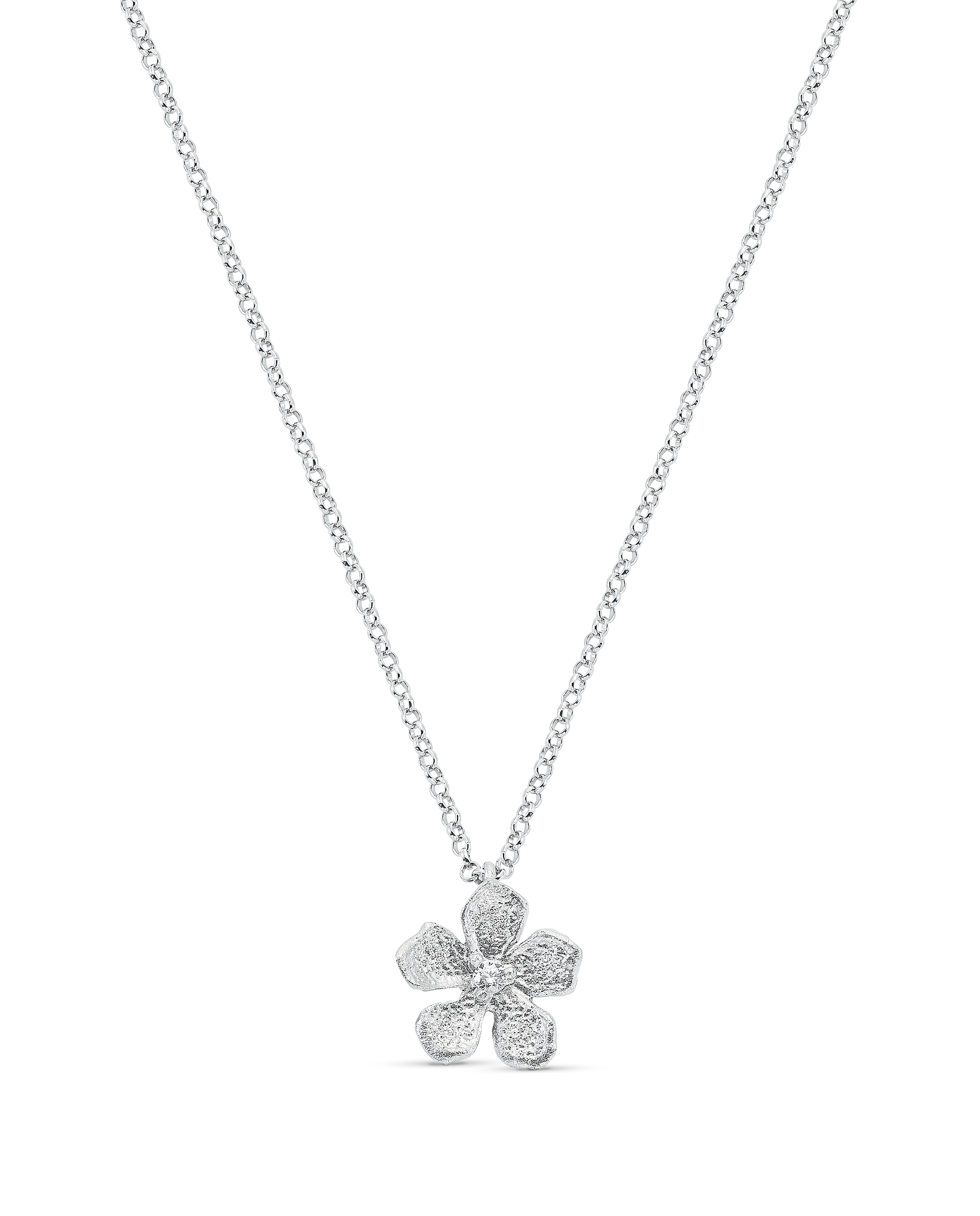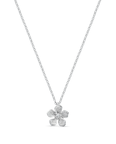 Colgante en plata de ley, motivo flor, acabado polvo de diamante, circonita central. Motivo 11 mm. Largo 40 cm. Colección Divina.