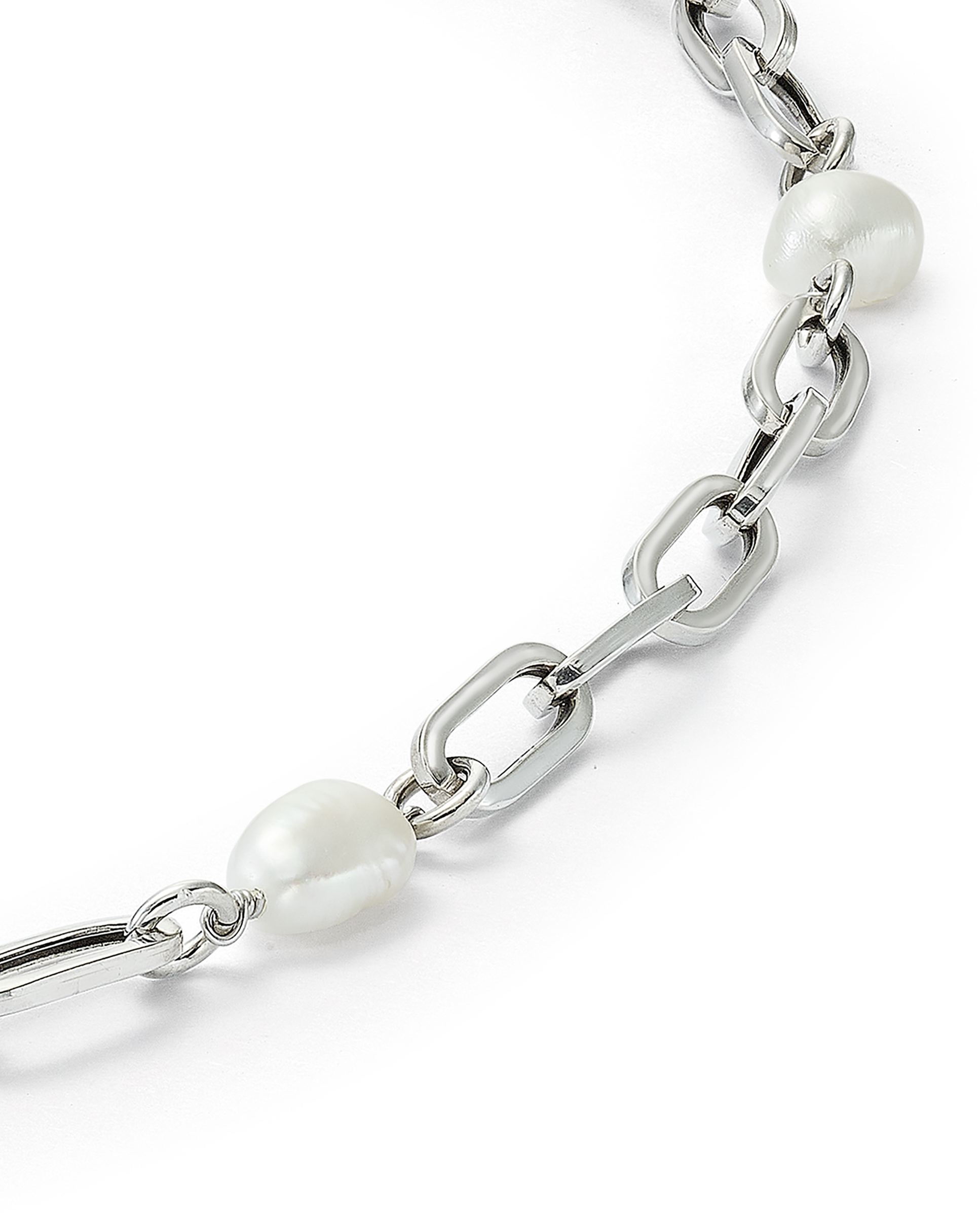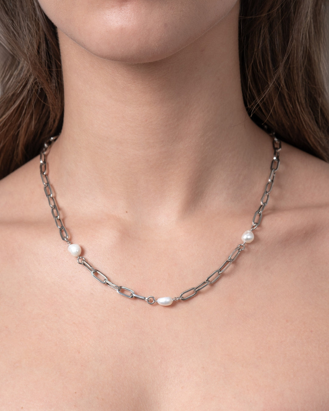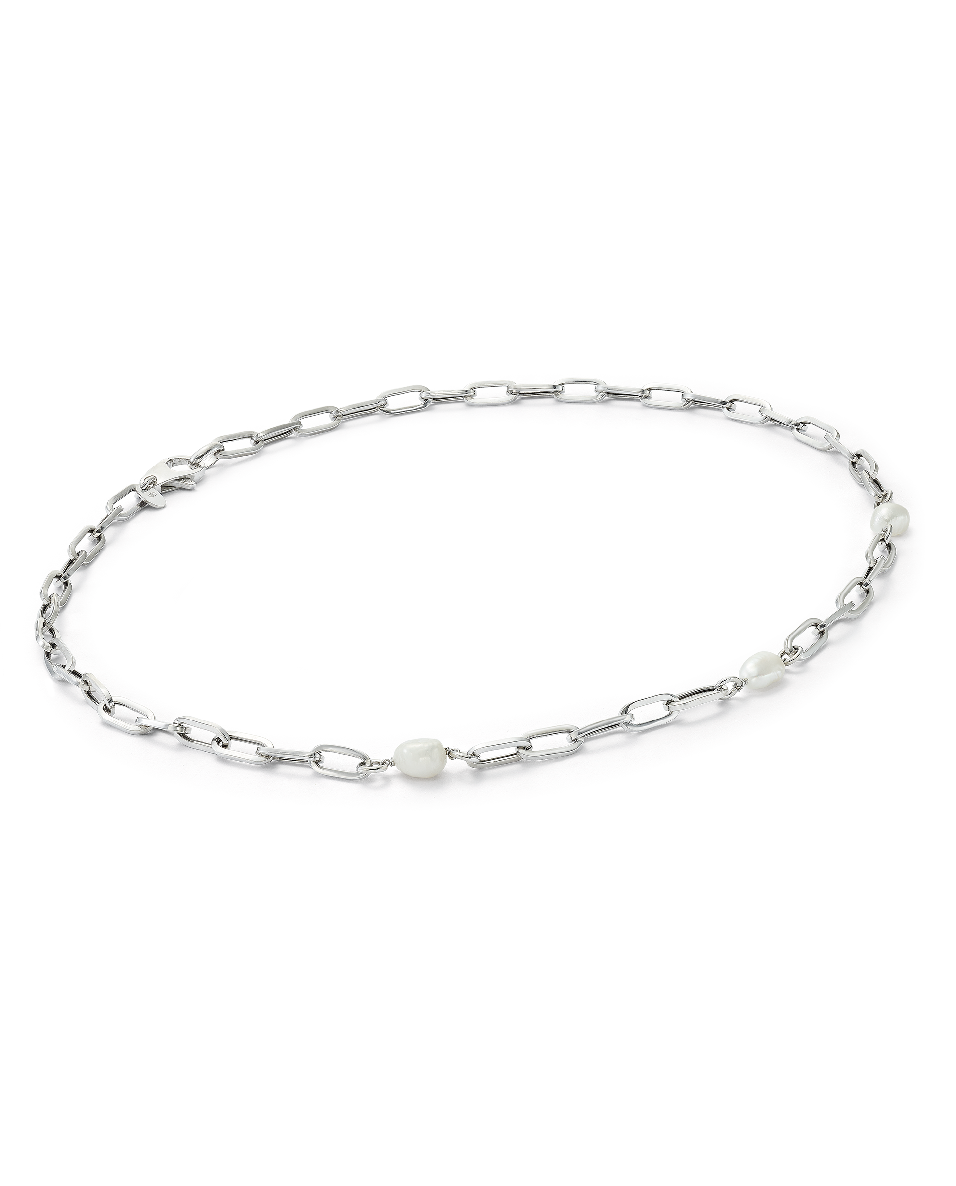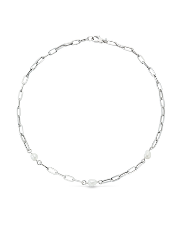 Collar en plata de ley, eslabones y perlas barrocas. Largo 45 cm. Colección Costa Blanca.