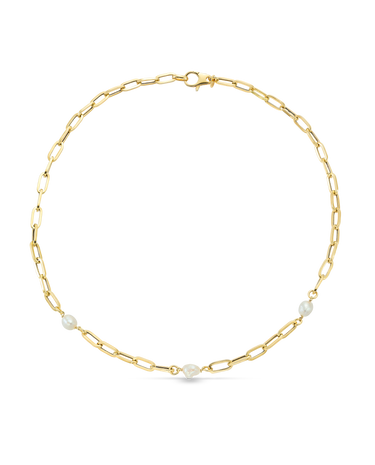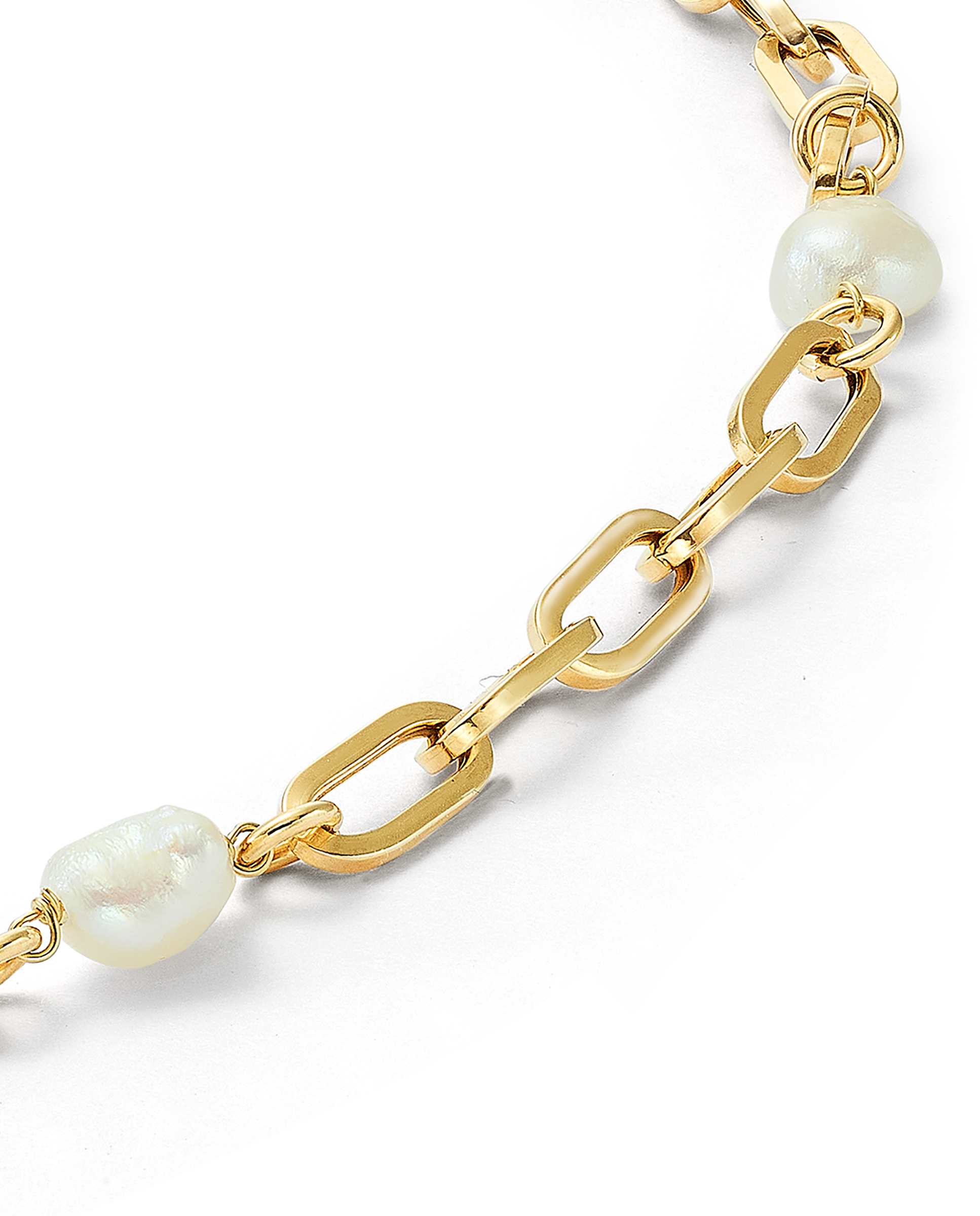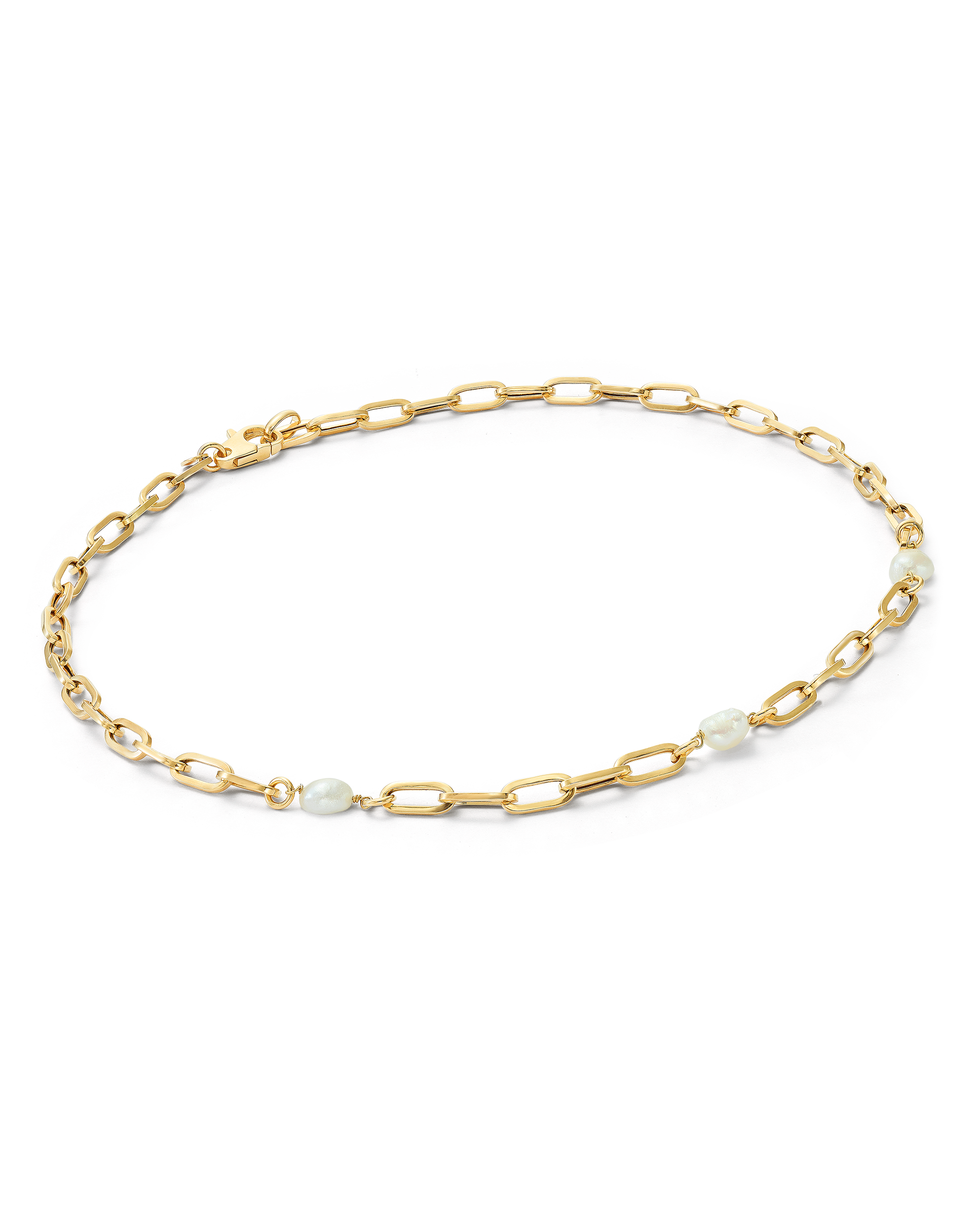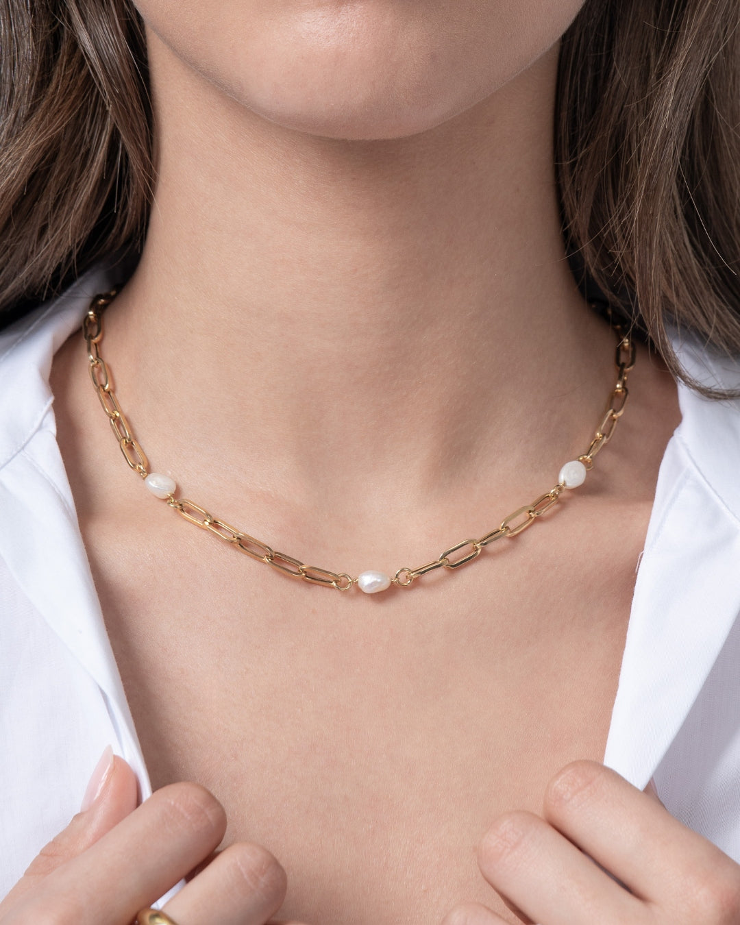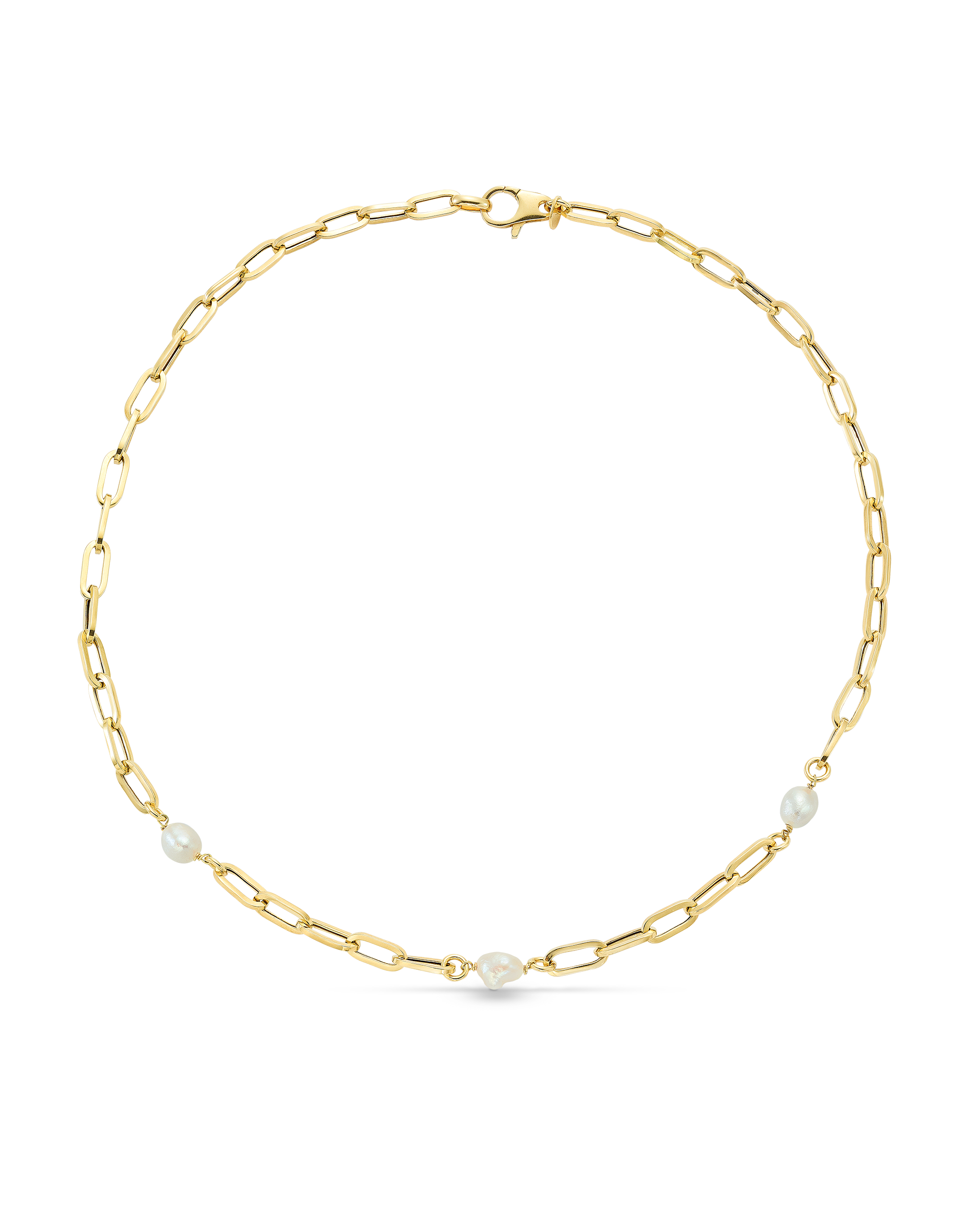 Collar en plata de ley dorada, eslabones y perlas barrocas. Largo 45 cm. Colección Costa Blanca.