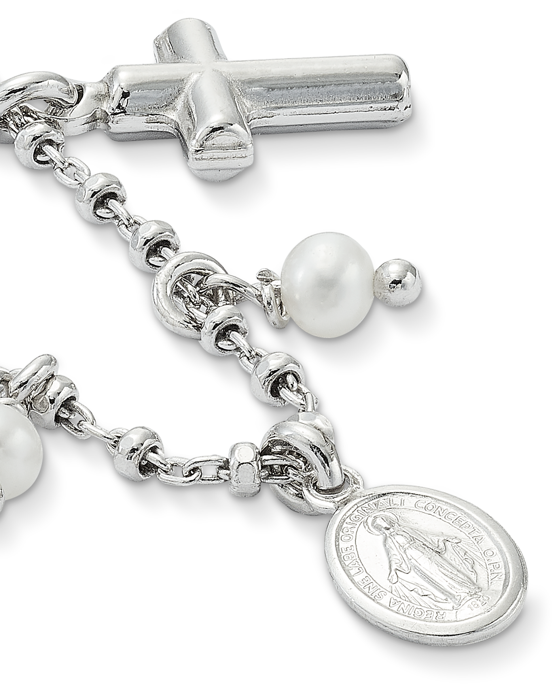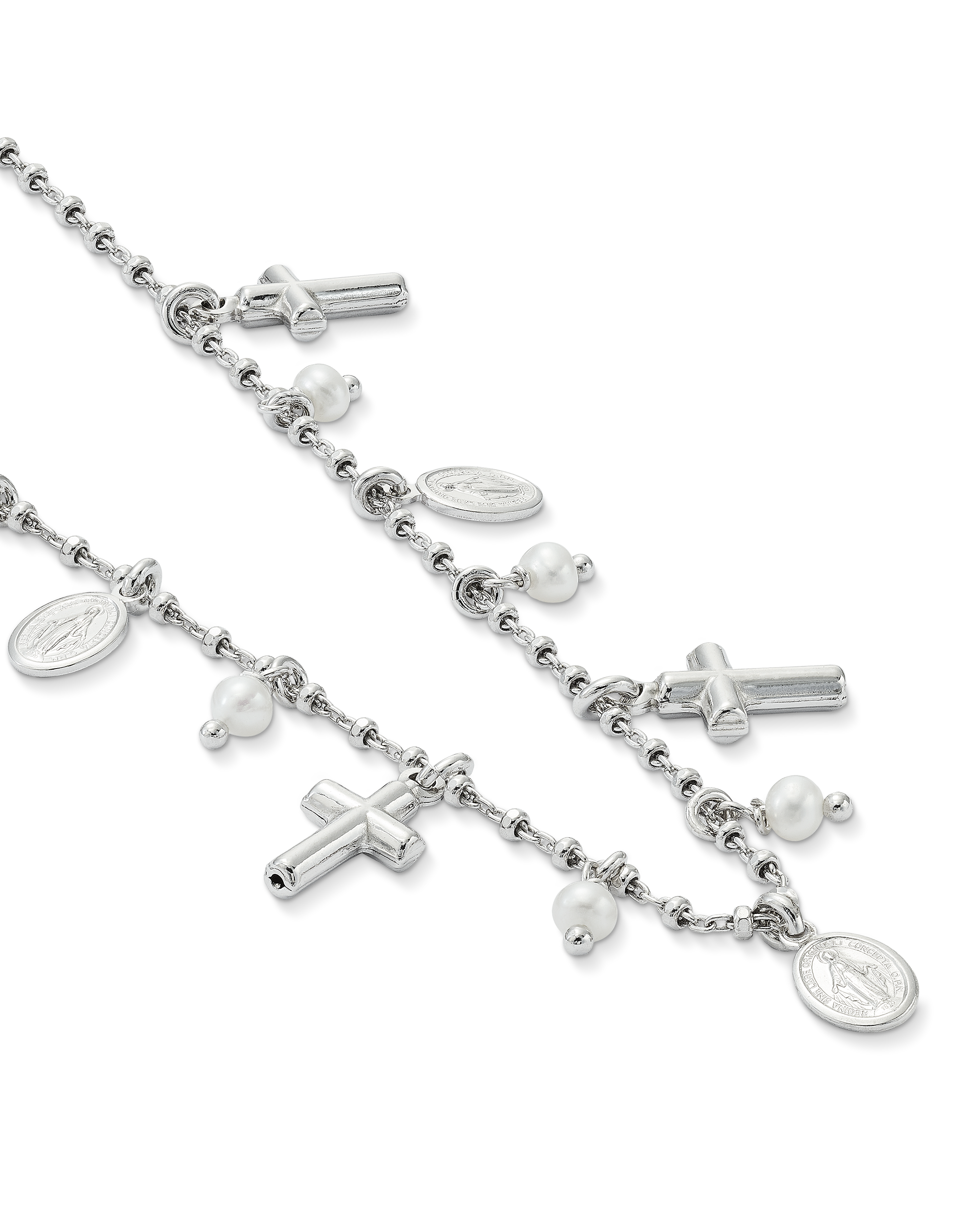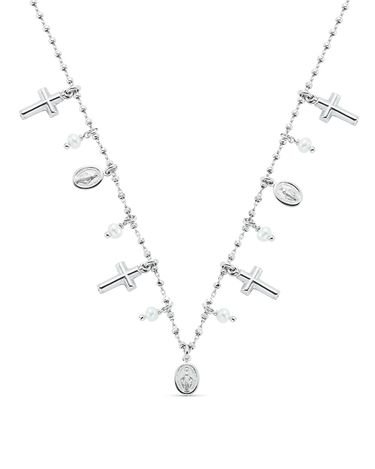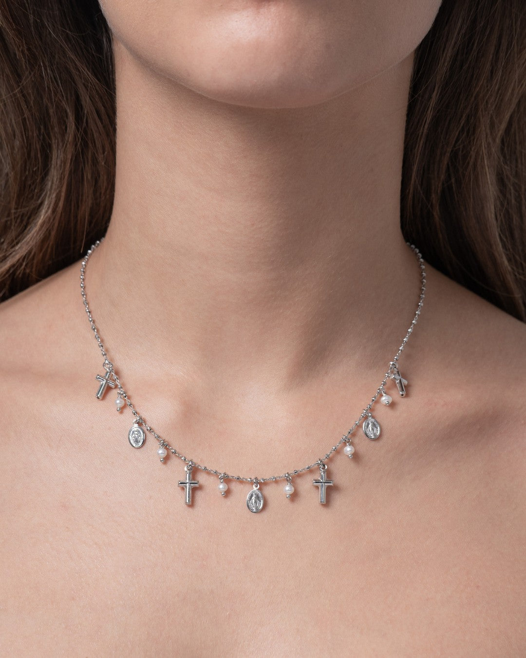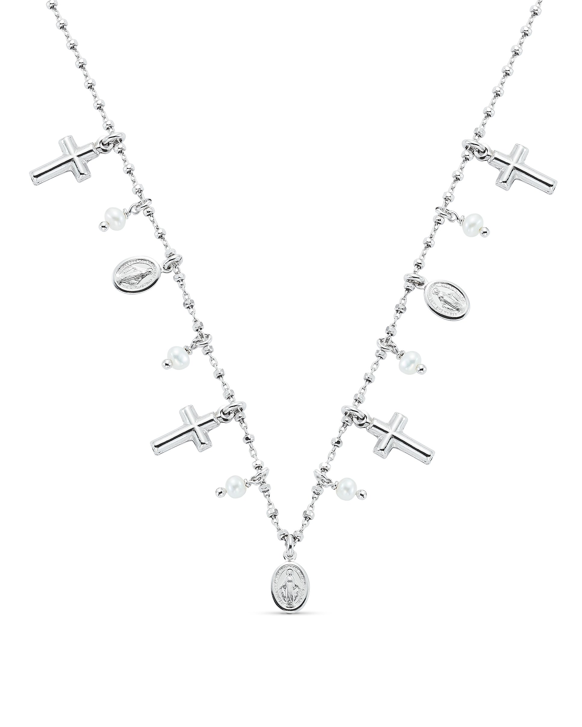 Collar en plata de ley, intercalando tres medallas escapulario Virgen Milagrosa, dos cruces y perlas. Colección Divina.