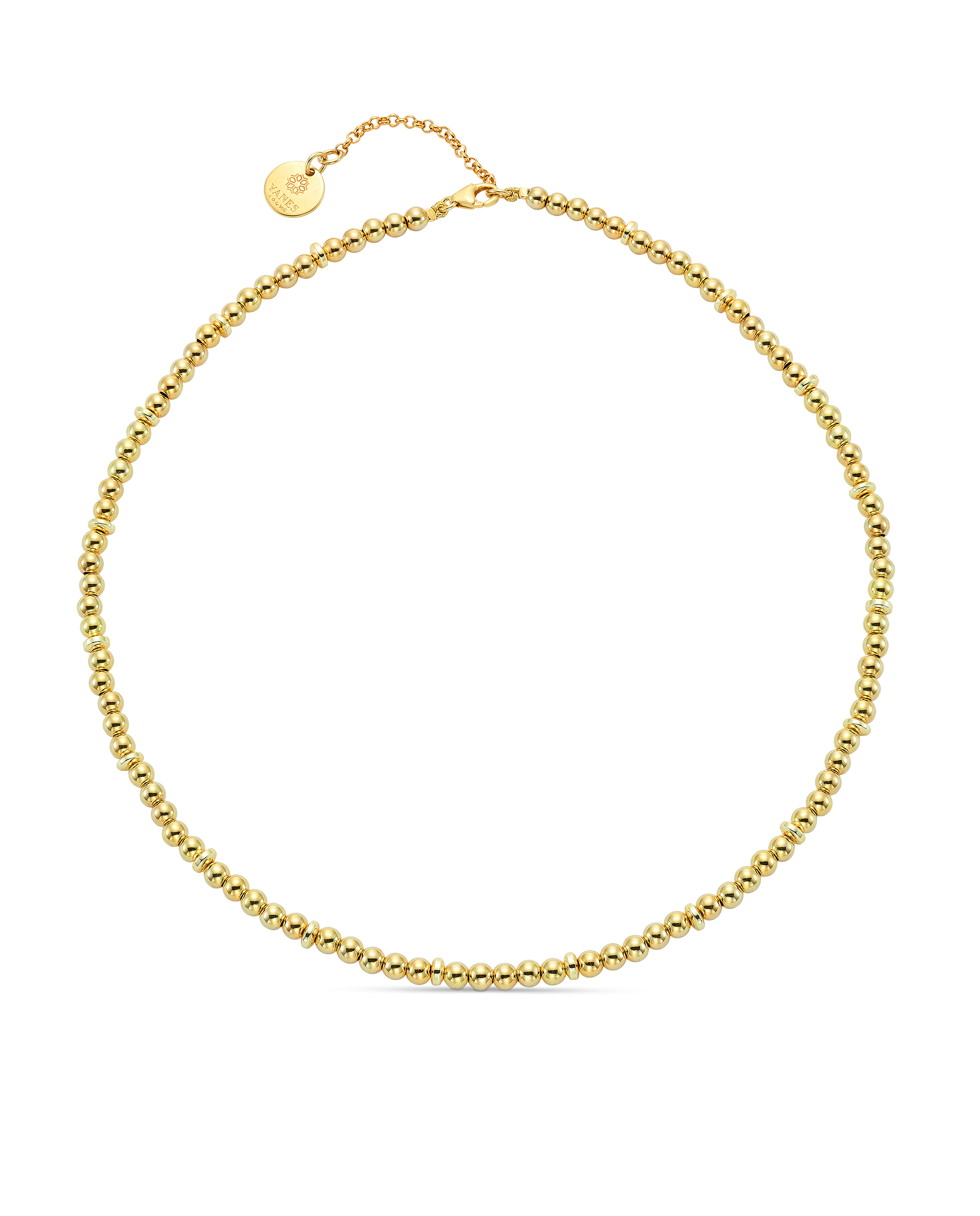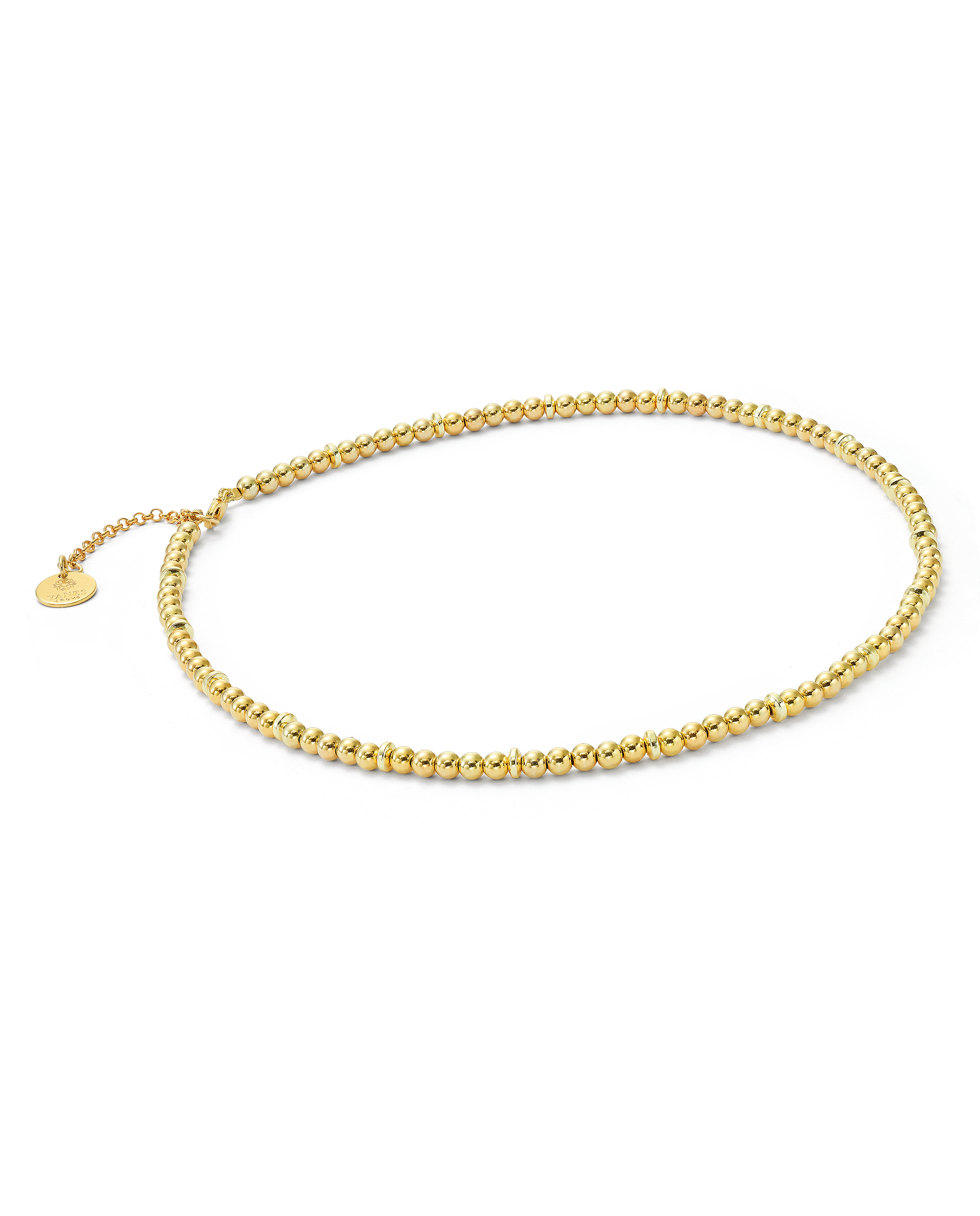 Collar en plata de ley dorada, hematites facetados 3 mm y discos hematites. Largo 45 cm. Colección Costa Blanca.