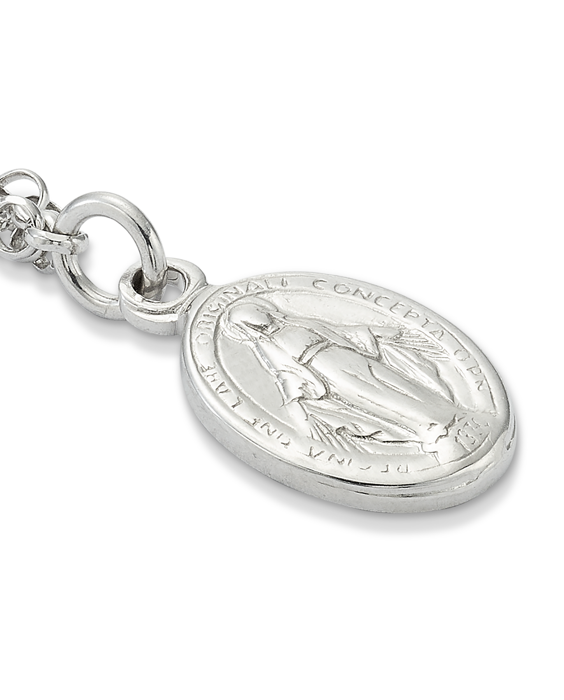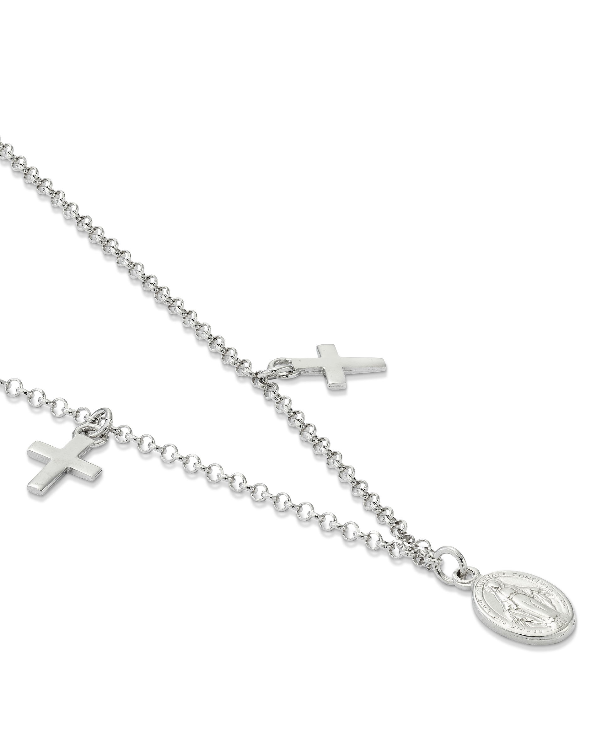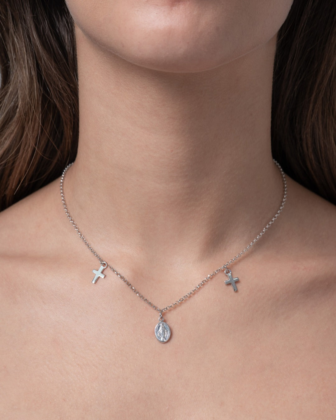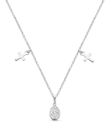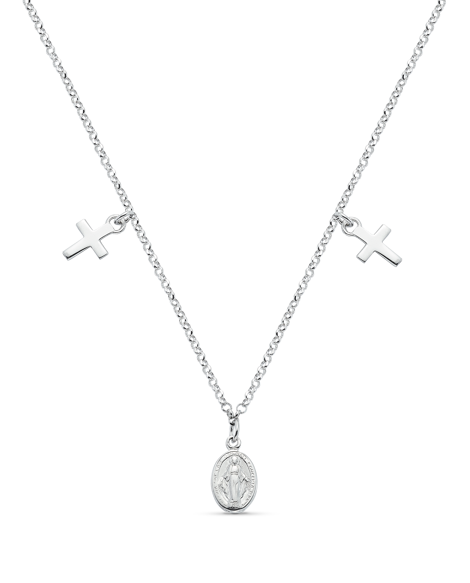 Collar en plata de ley, cadena rolo medalla central escapulario Virgen Milagrosa y dos cruces. Largo 40 cm. Colección Divina.