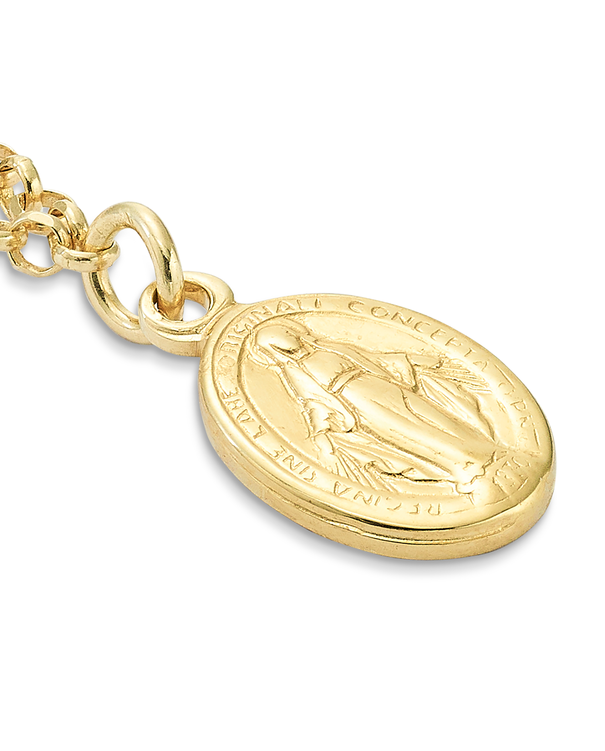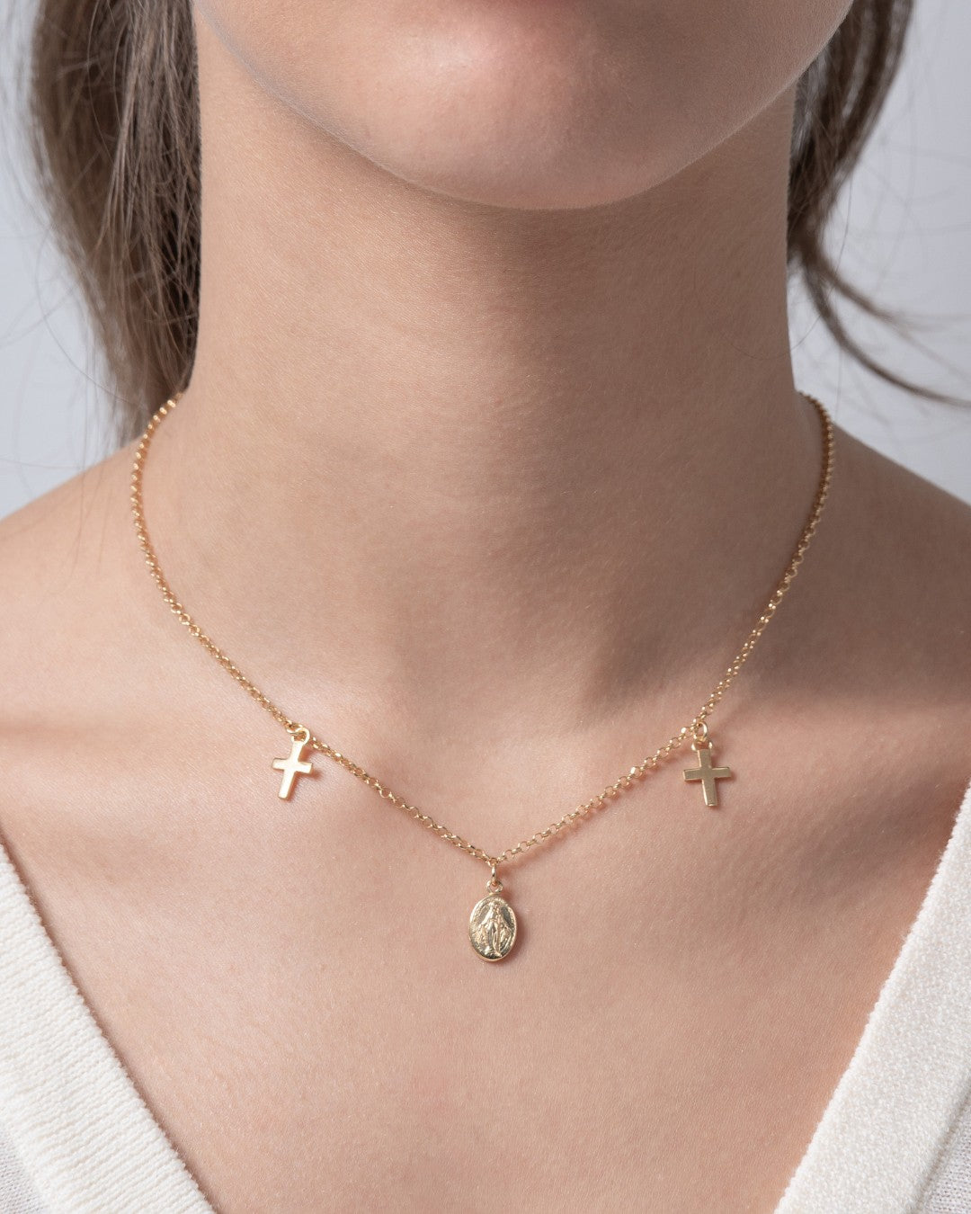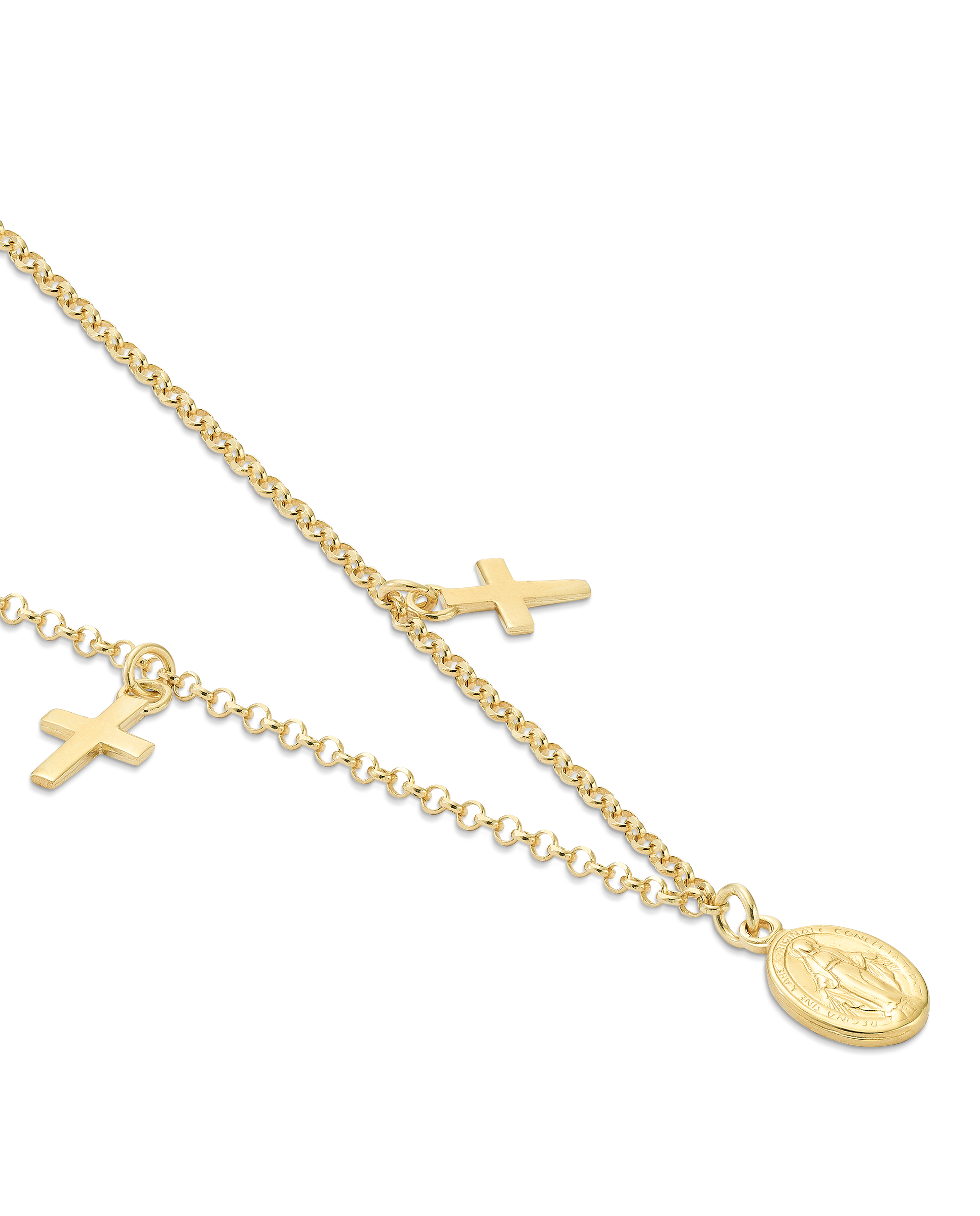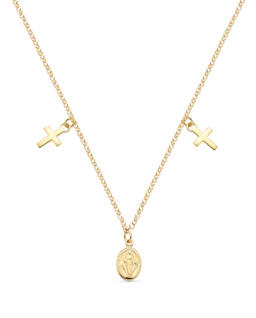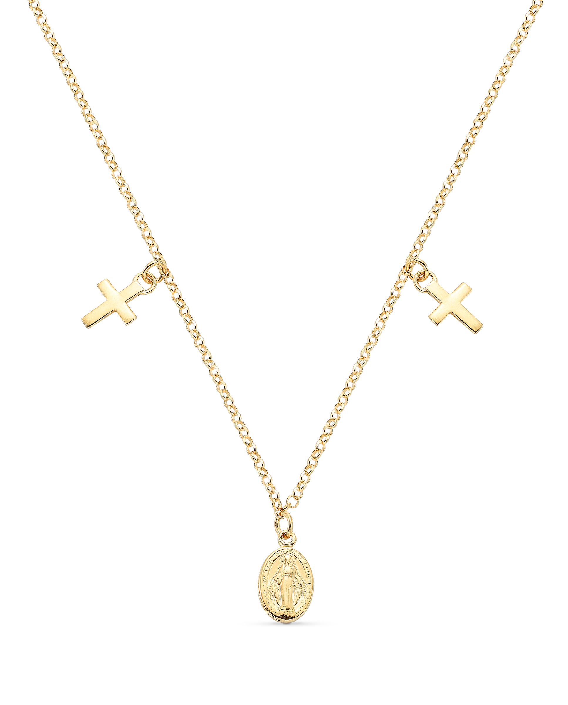 Collar en plata de ley dorada, cadena rolo medalla central escapulario Virgen Milagrosa y dos cruces. Largo 40 cm. Colección Divina.
