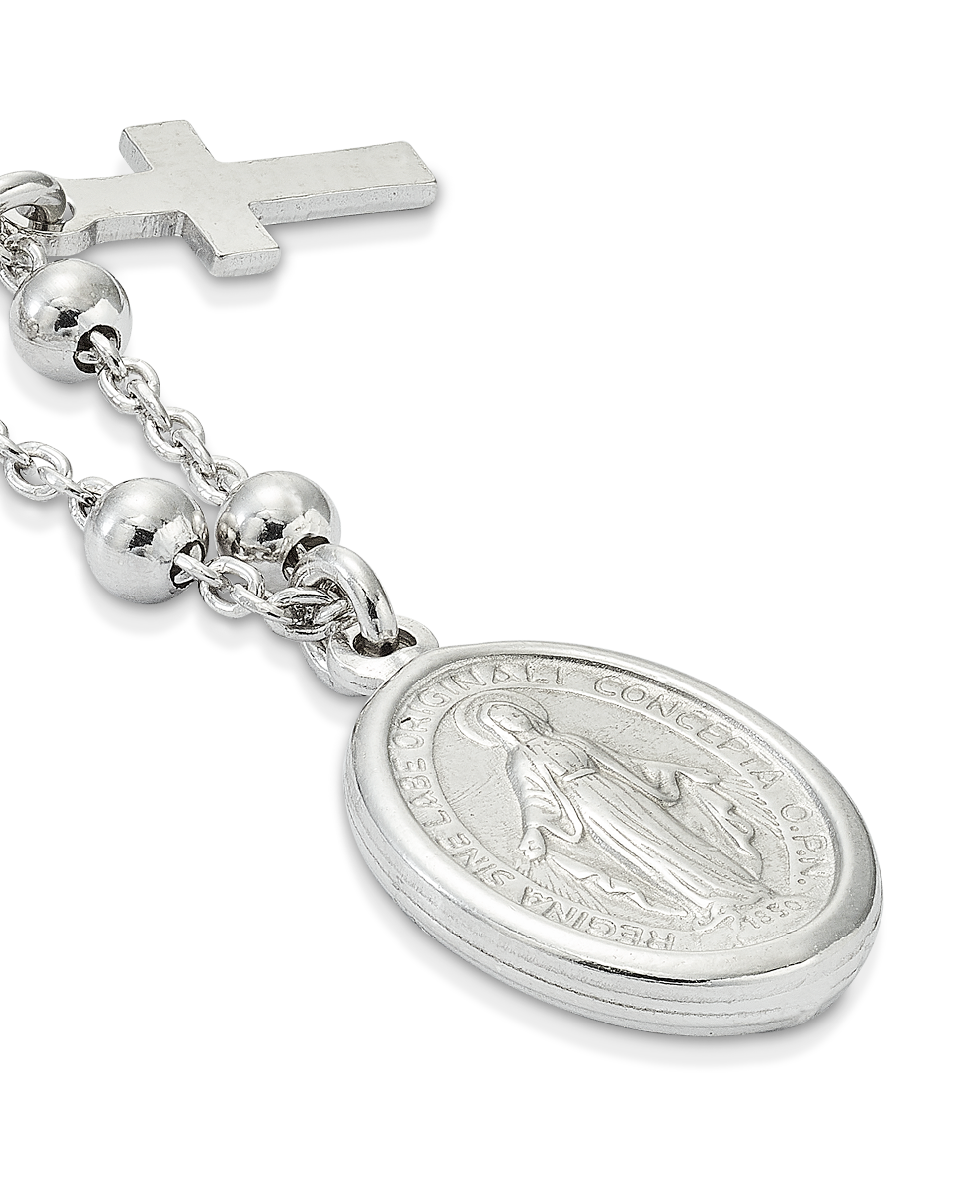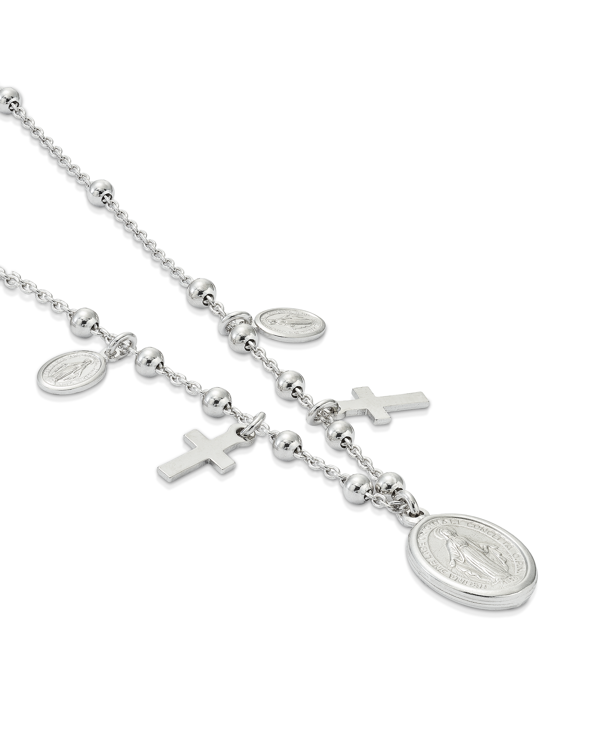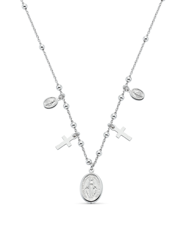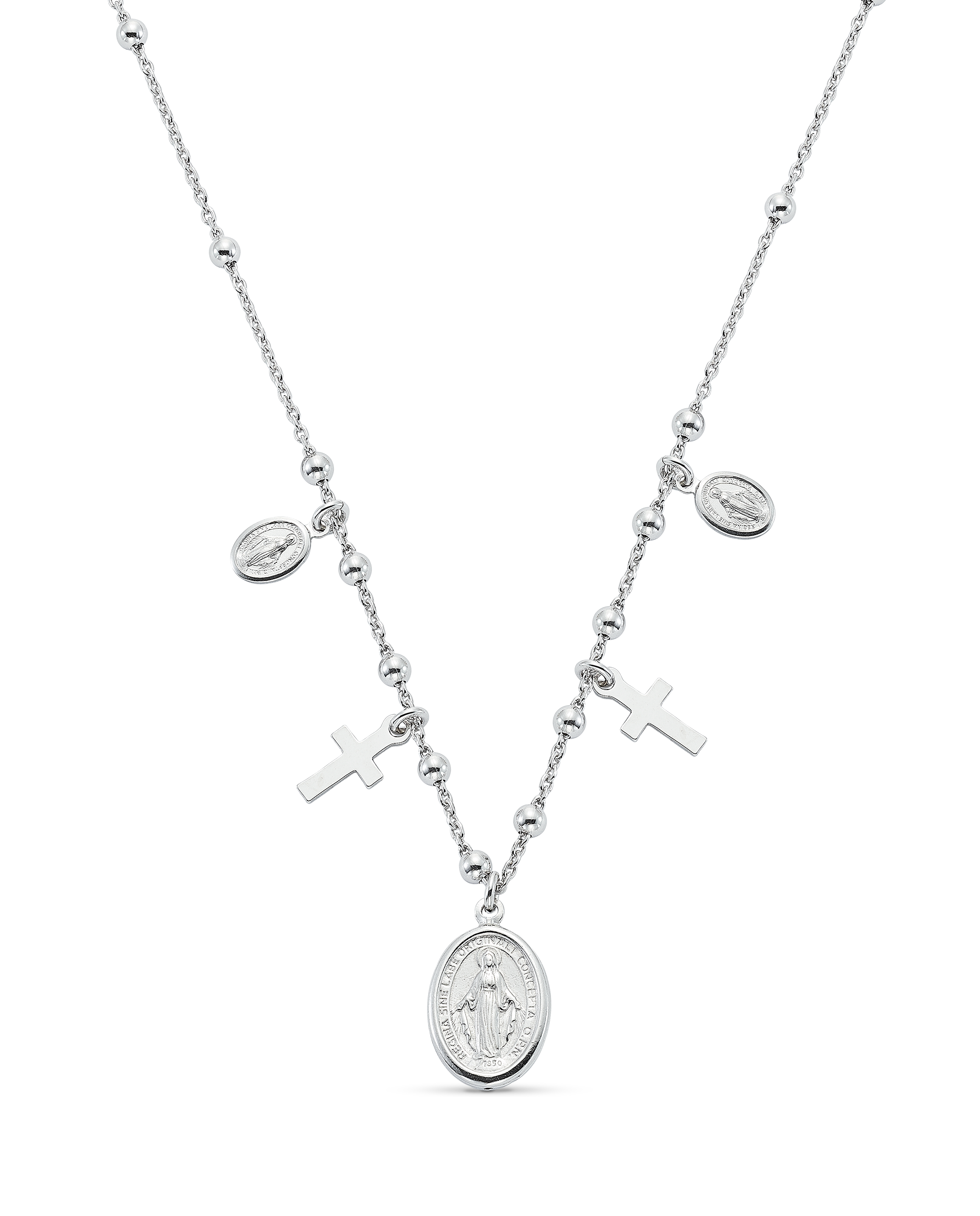 Collar en plata de ley, bolitas con dos cruces y dos medallas pequeñas Virgen Milagrosa, Medalla central Virgen Milagrosa de 14 x 11 mm. Largo 45 cm. Colección Divina.