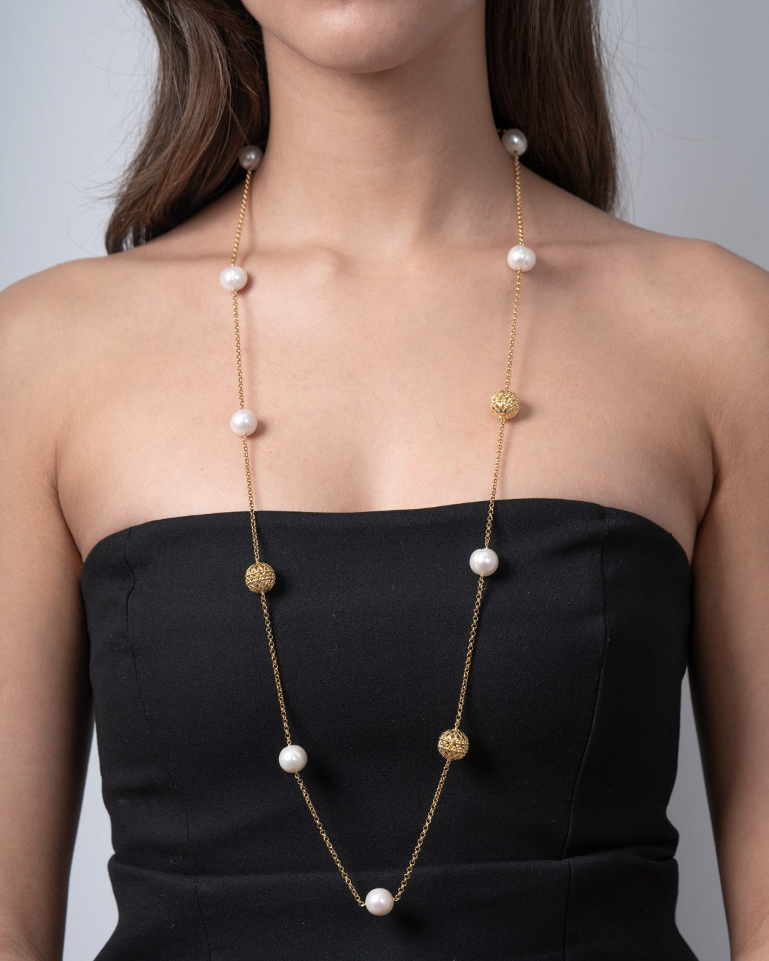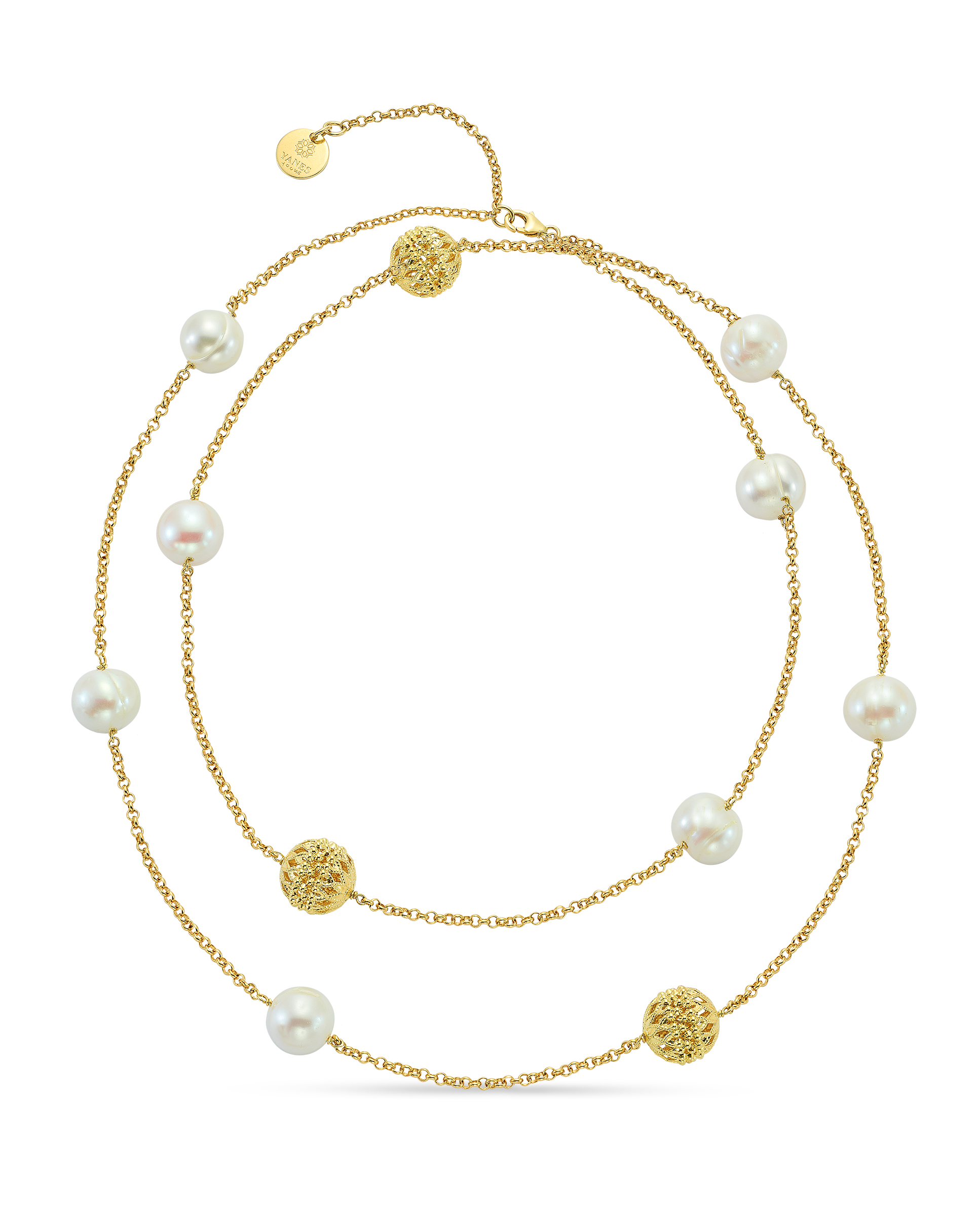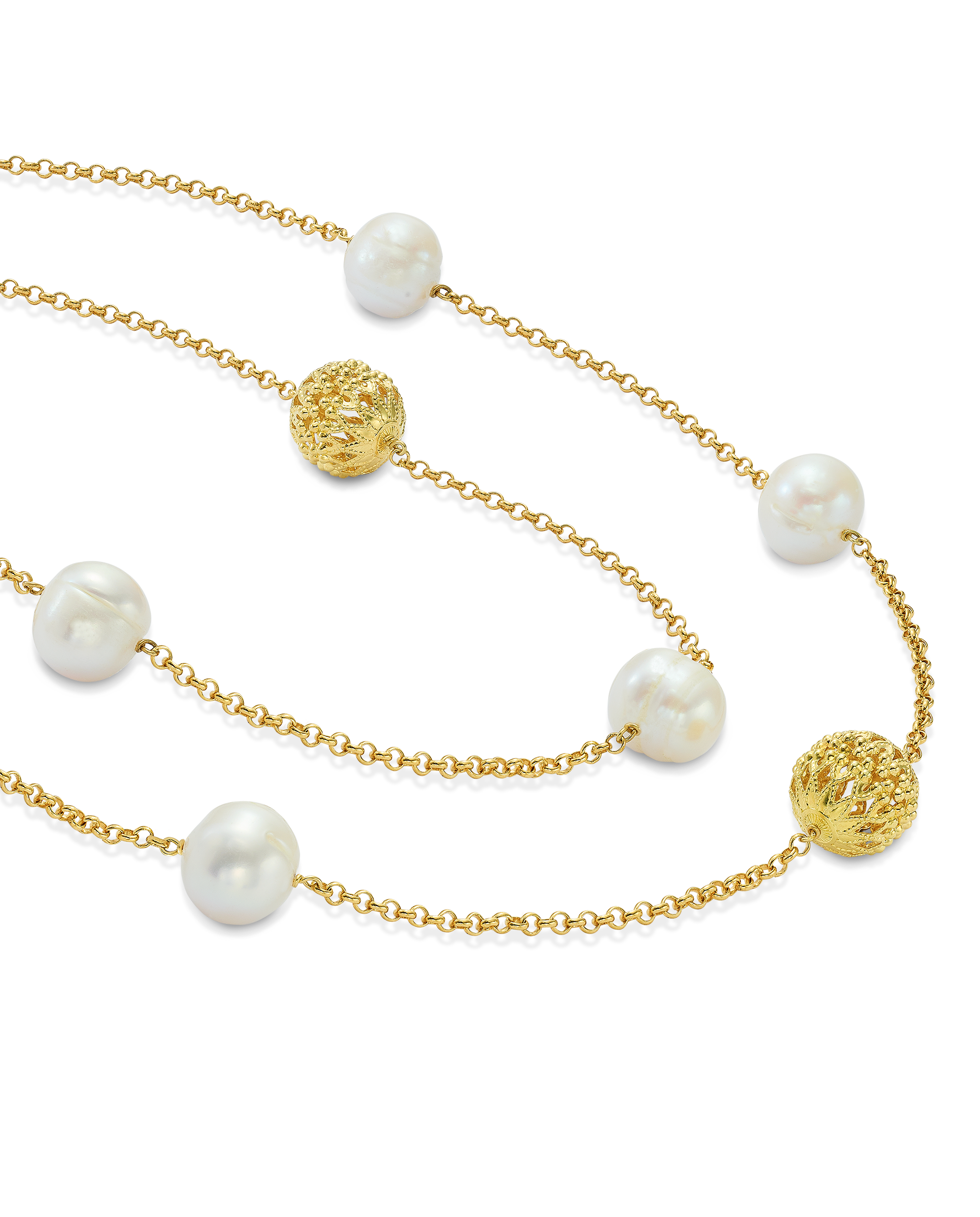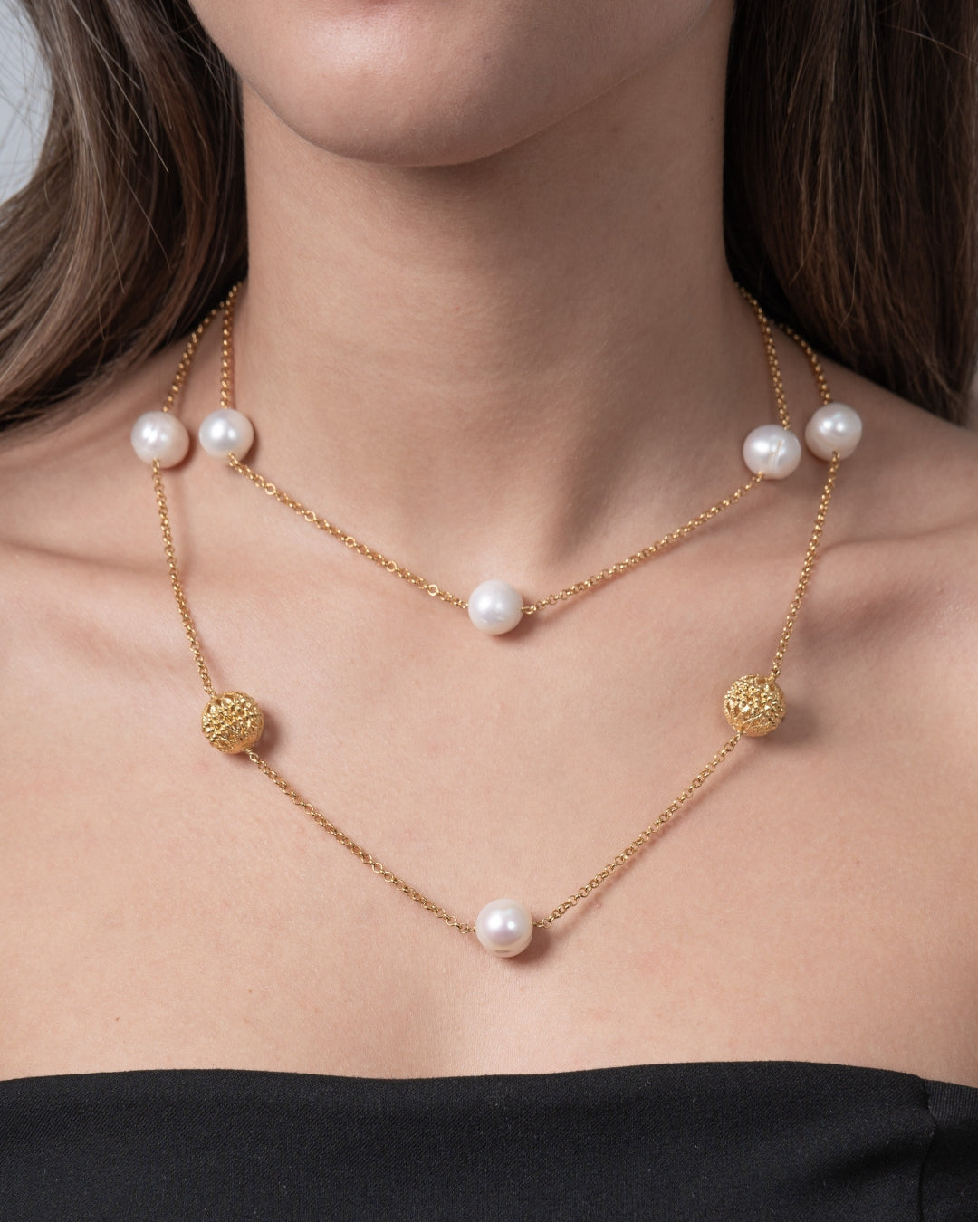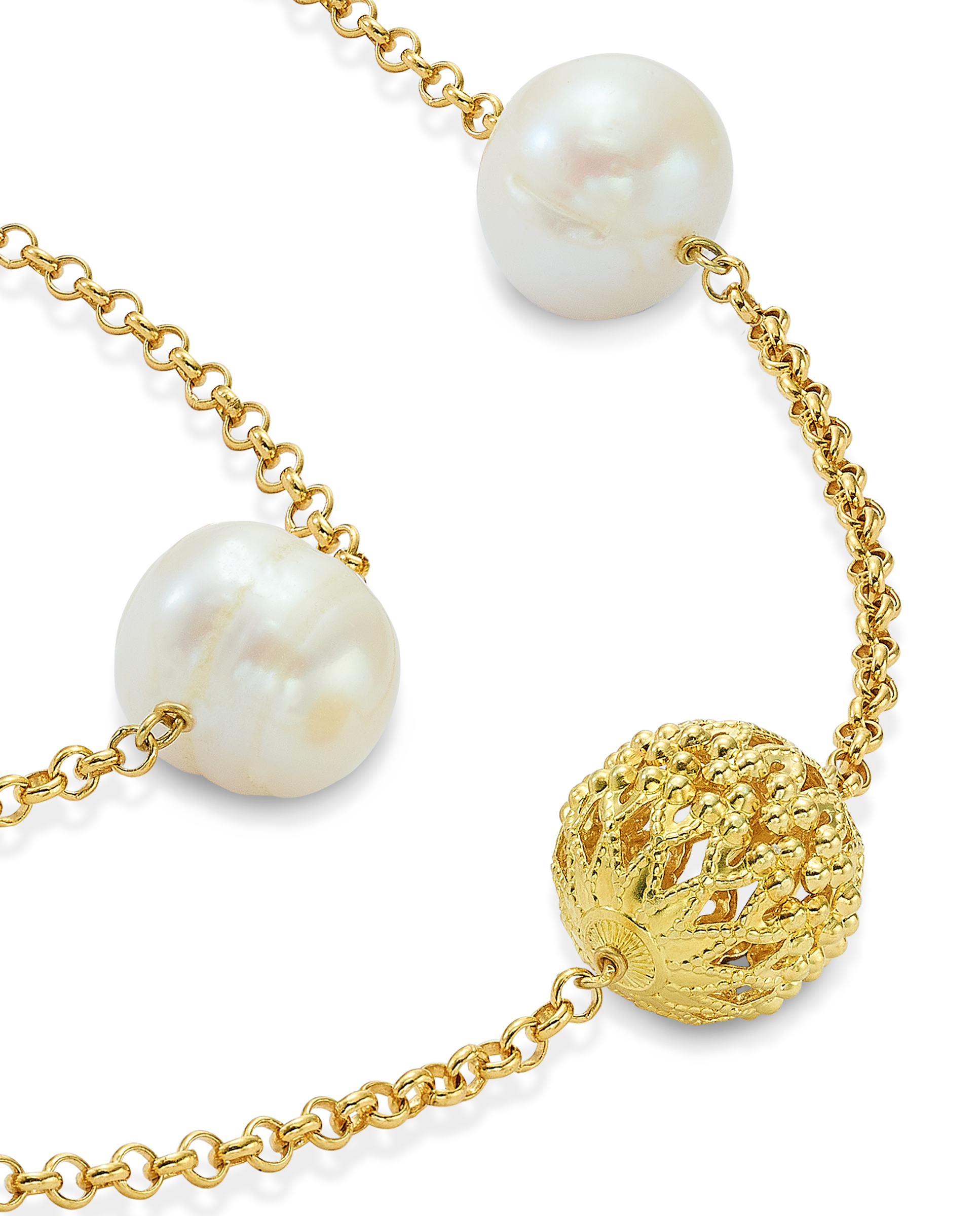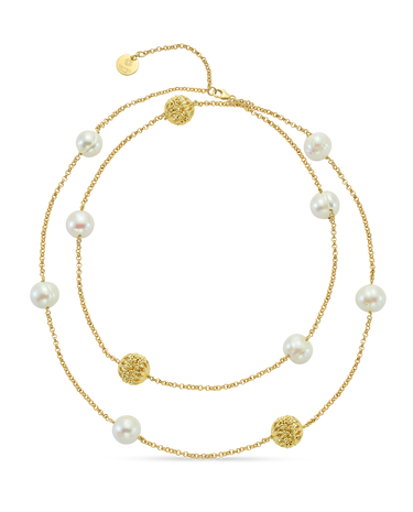 Cadena en plata de ley dorada, intercalando bolas plata dorada 13 mm con perlas. Largo 45 cm. Colección Costa Blanca.