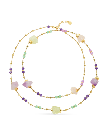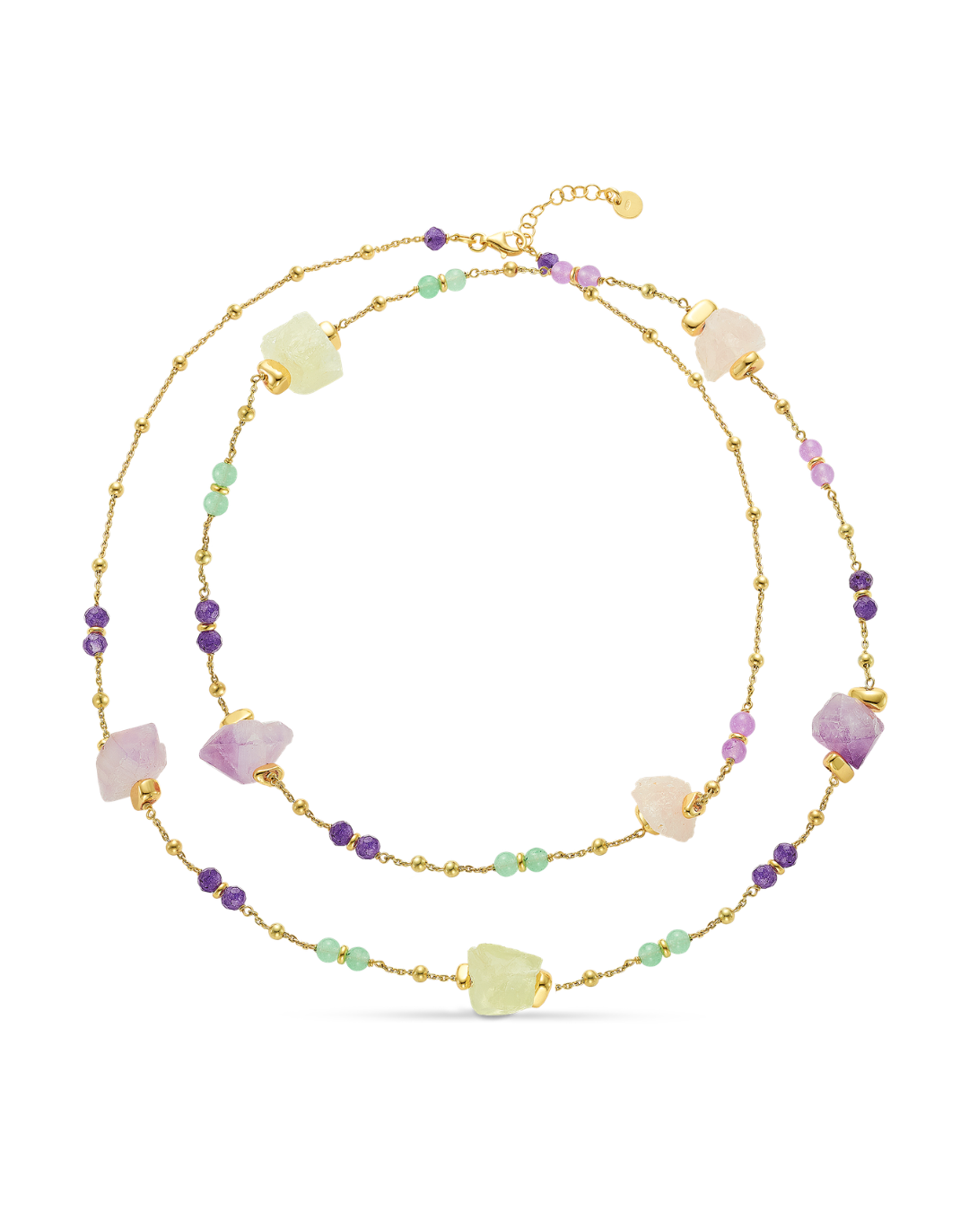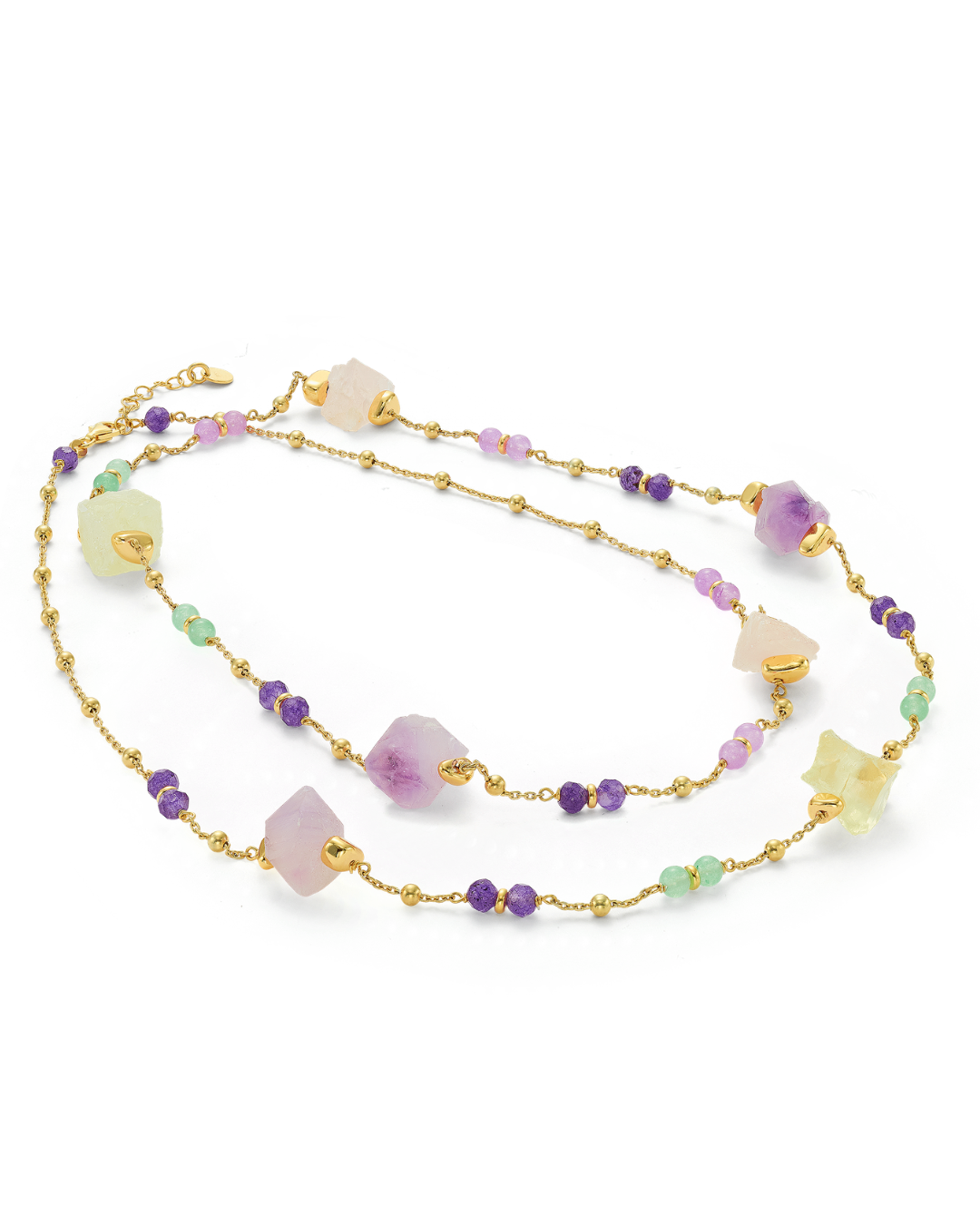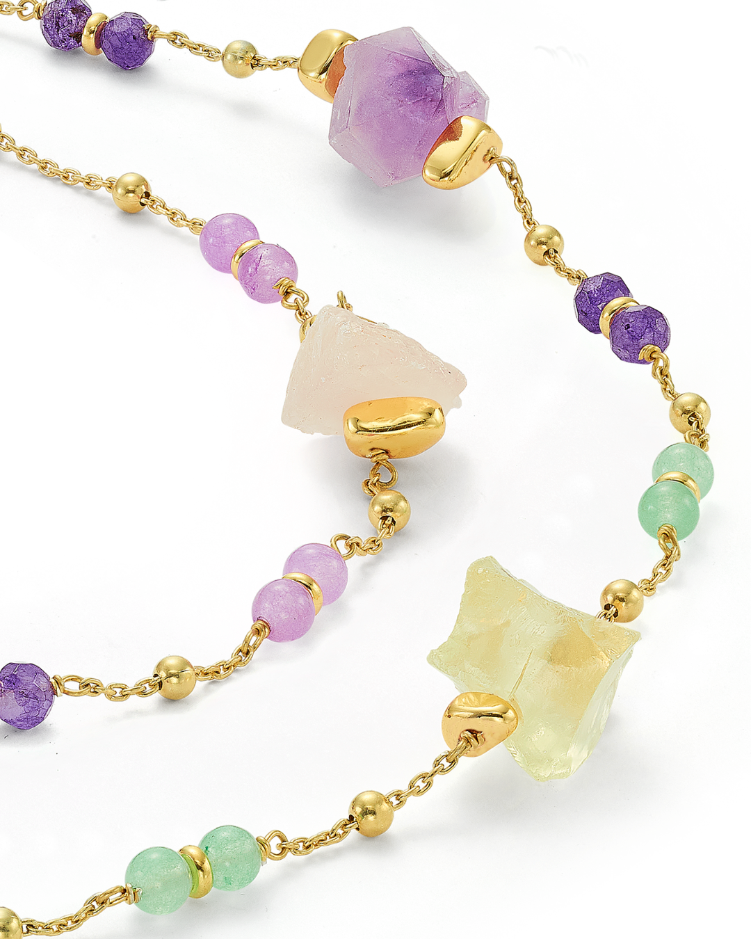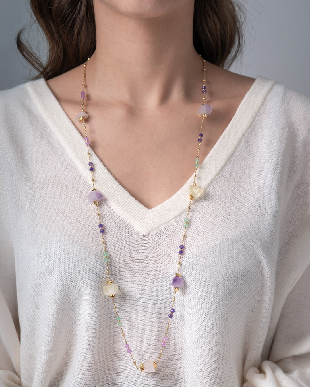 Collar en plata de ley dorada, amatista, cuarzo rosa, cuarzo limón, jade y ágata en bruto combinadas con piedras en bolas y hematites irregulares. Largo 90 cm. Colección Costa Azul.