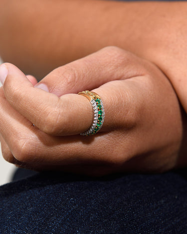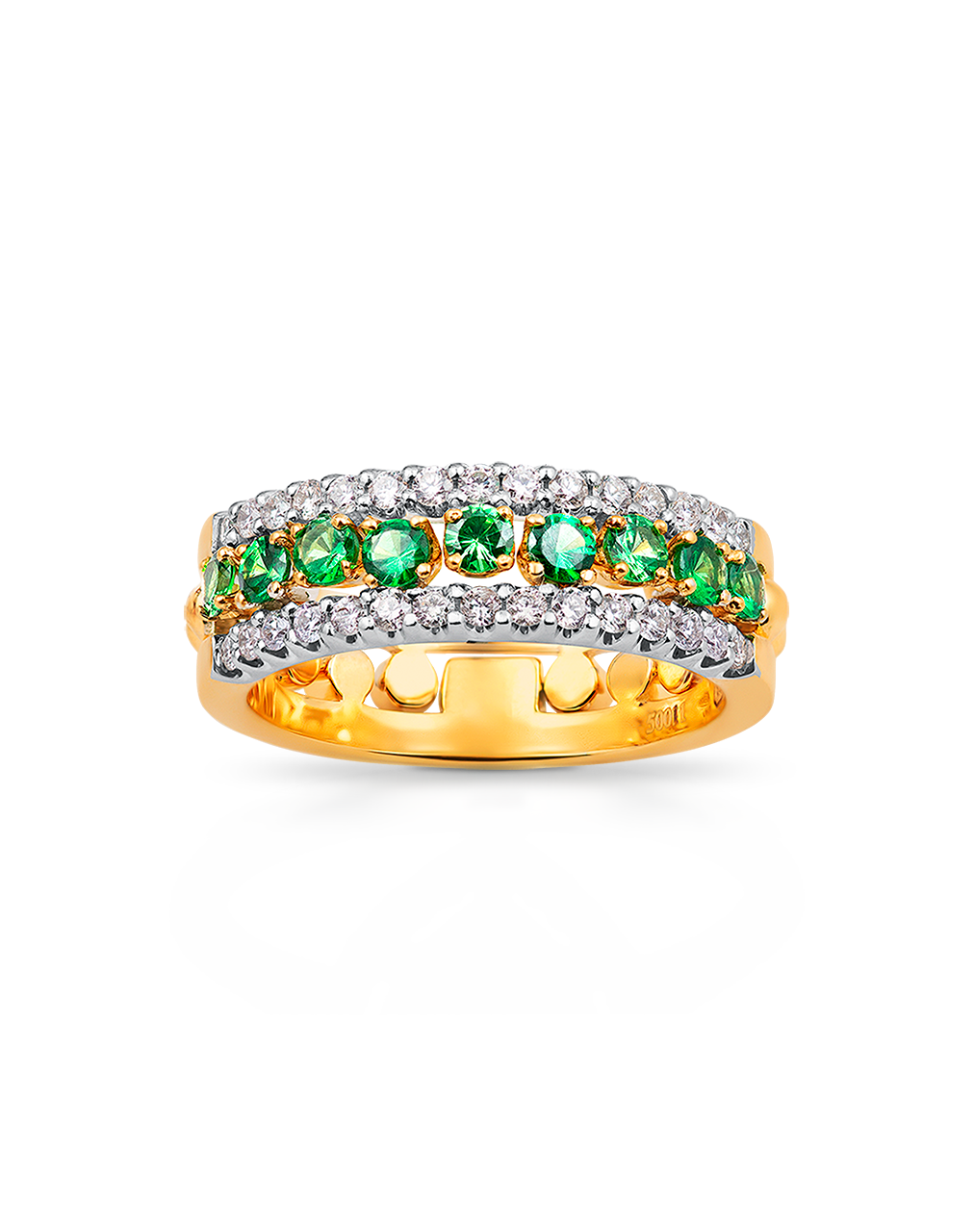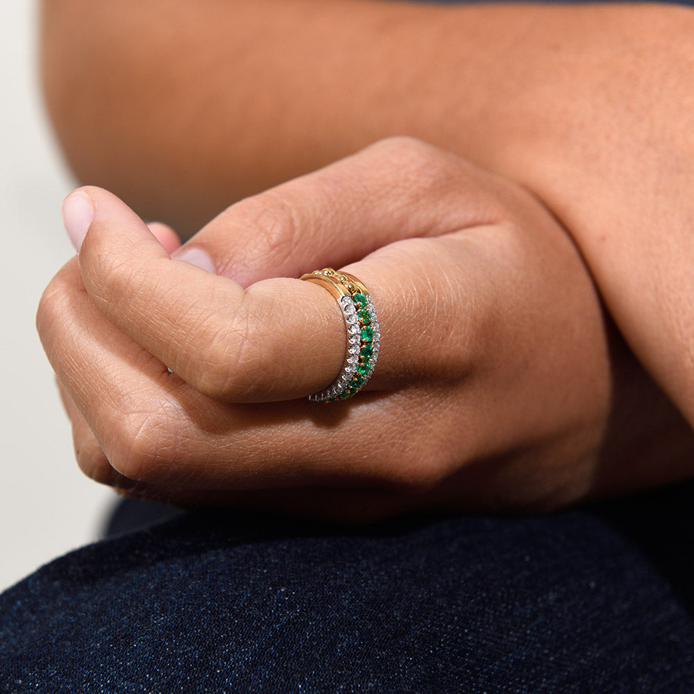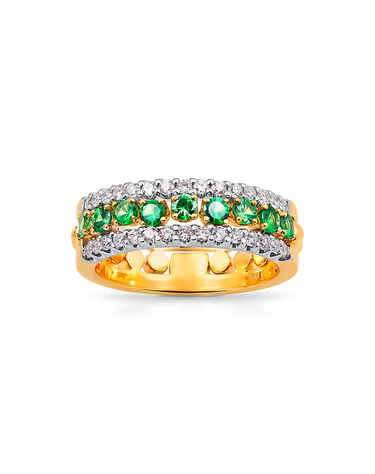 Anillo 3 bandas, centro esmeraldas, 0,61 ct, y 2 bandas diamantes talla brillante, peso 0,40 ct, oro amarillo de 18K. Coleción Conexión.