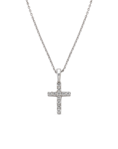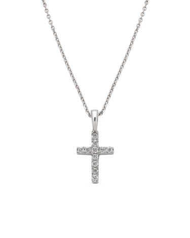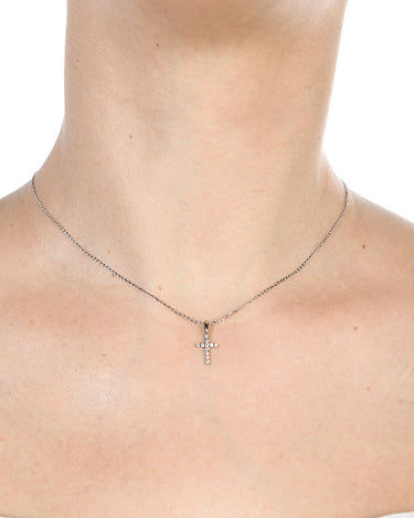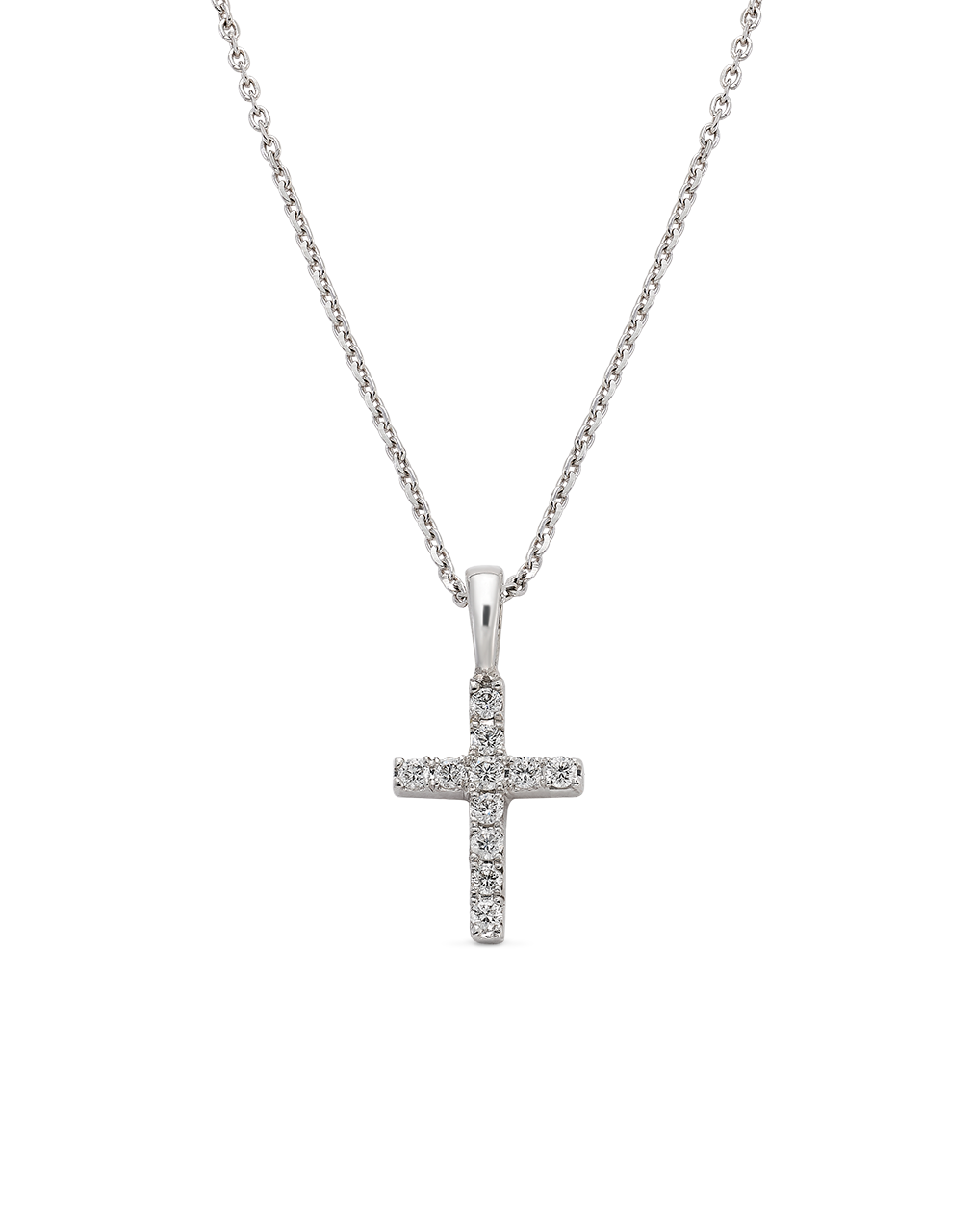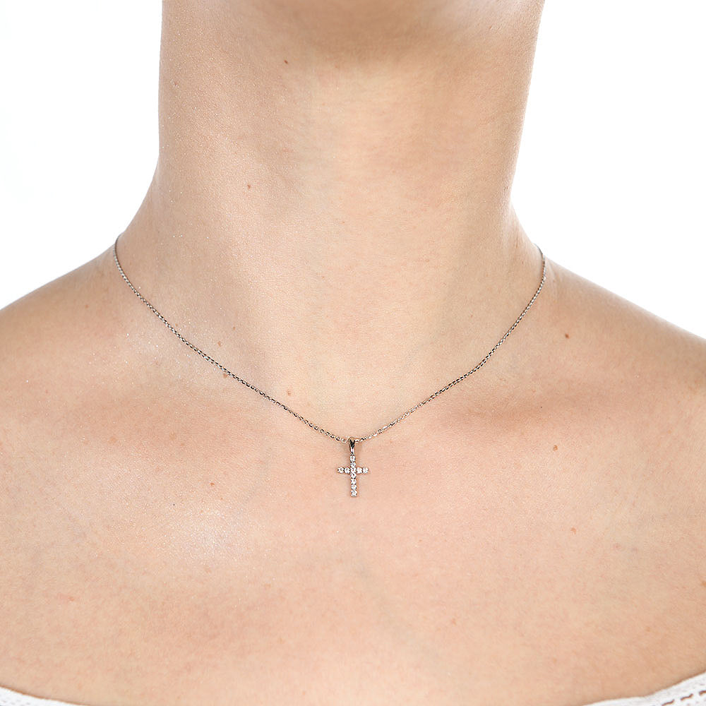 Colgante en oro blanco de 18K, cruz diamantes talla brillante, peso 0,13 ct, color G, pureza SI, engaste cuatro garras. Ancho 2 mm. Cadena no incluida.