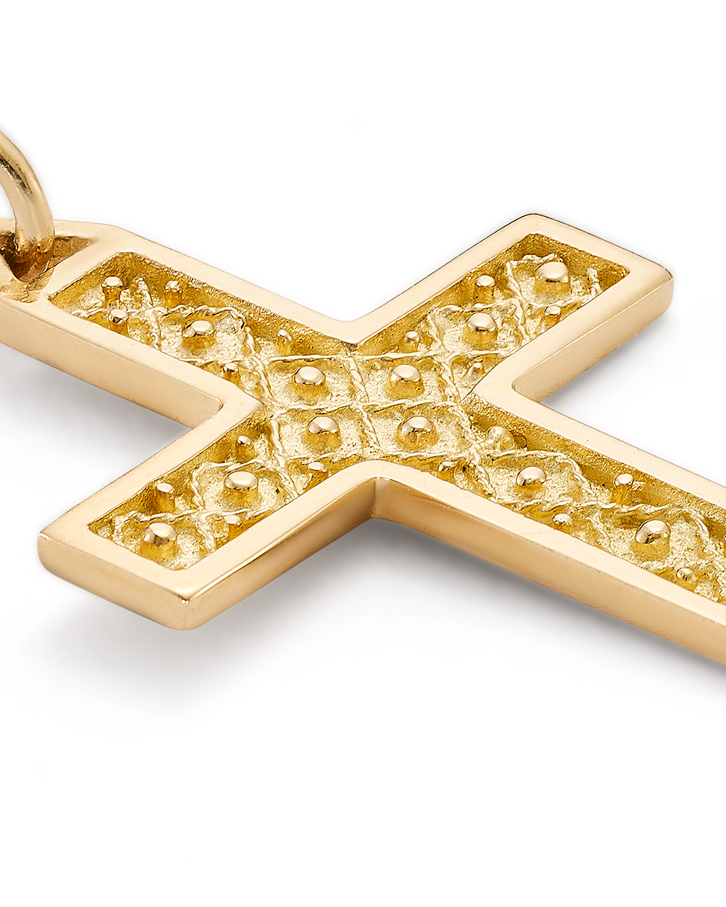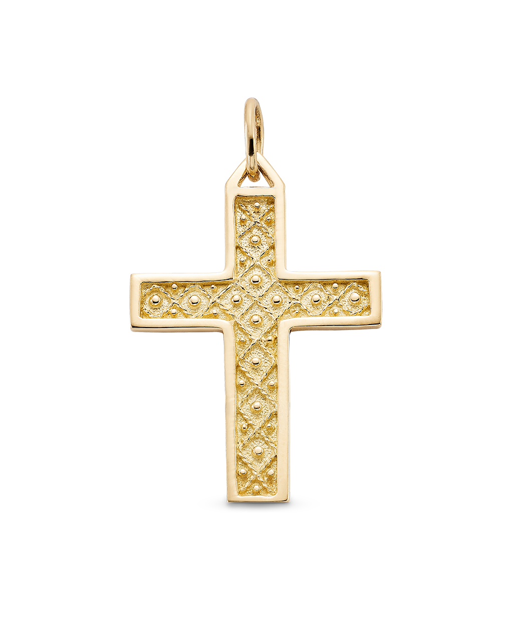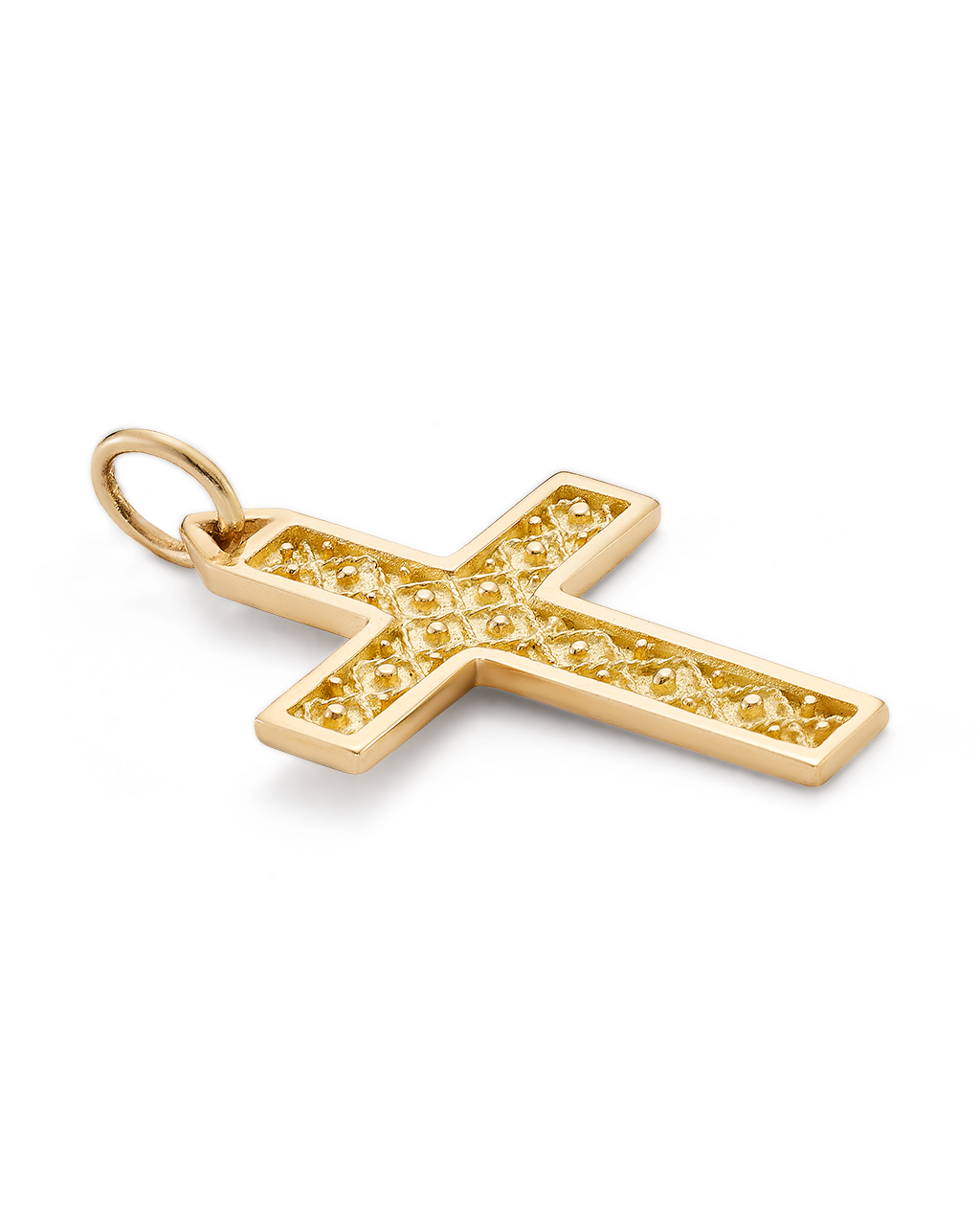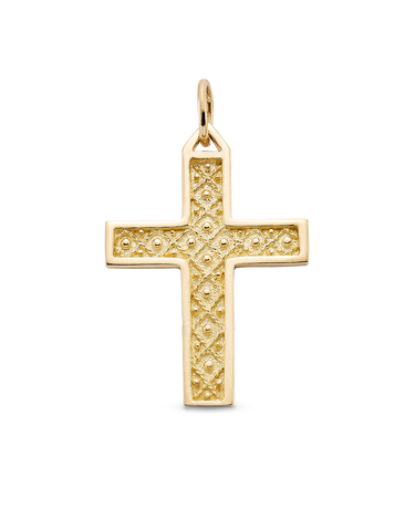 Cruz plana lisa, una cara labrada. Oro amarillo de 18K. Medida 27 x 21 mm, ancho 5 mm. Colección Malpica.