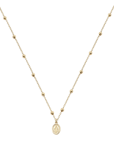 Centro mini medalla Virgen Milagrosa, cadena mini bolas. Oro amarillo de 18K. Medida medalla 5 x 4 mm, largo cadena 42 cm. Divina.