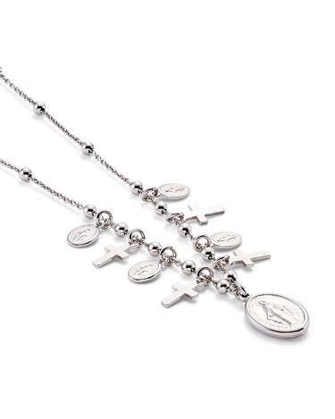 Collar centro cinco medallas Virgen Milagrosa intercalando cuatro cruces. Plata de ley. Medida motivo 8 cm, cruces 12 mm, medallas 10 mm, medalla central 18 mm. Cadena mini bolas terminada en cruz, medida 43 - 49 cm. Colección Divina.