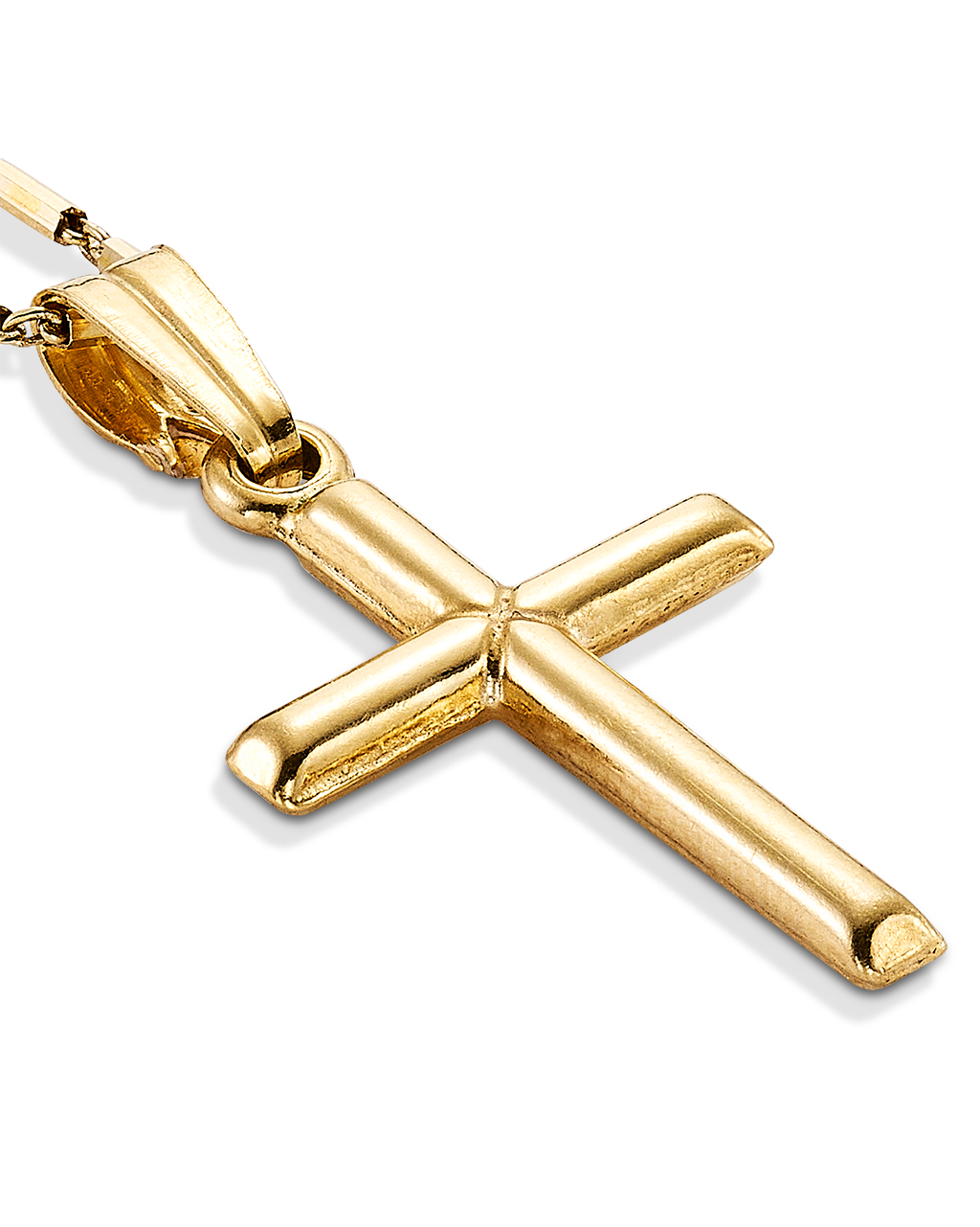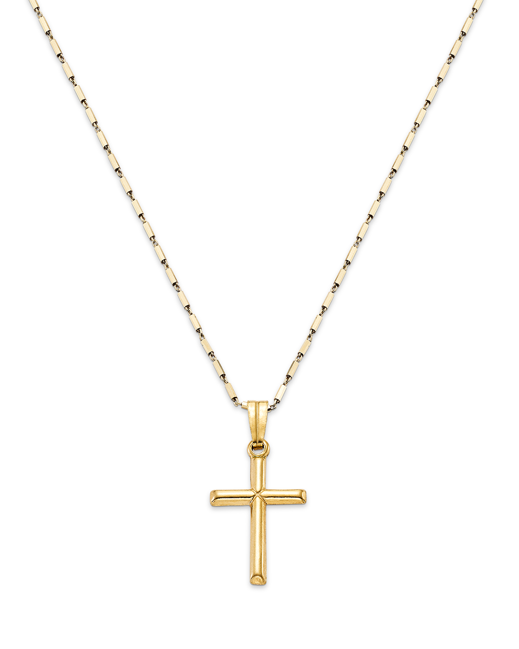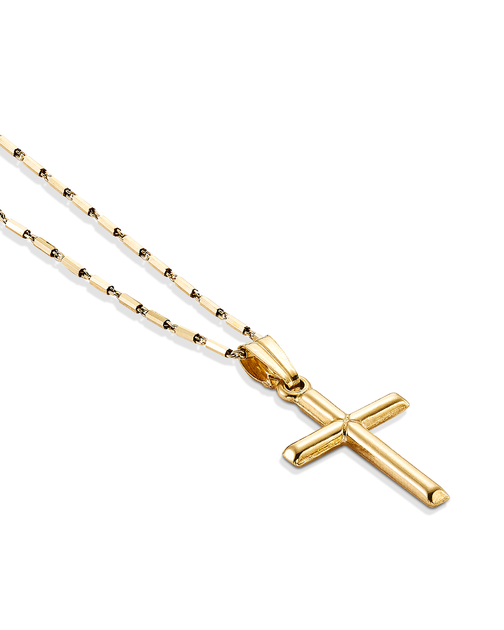 Cruz y cadena eslabones planos. Plata de ley dorada. Medida cruz 21 x 15 mm, medida cadena 44 - 49 cm. Colección Divina.