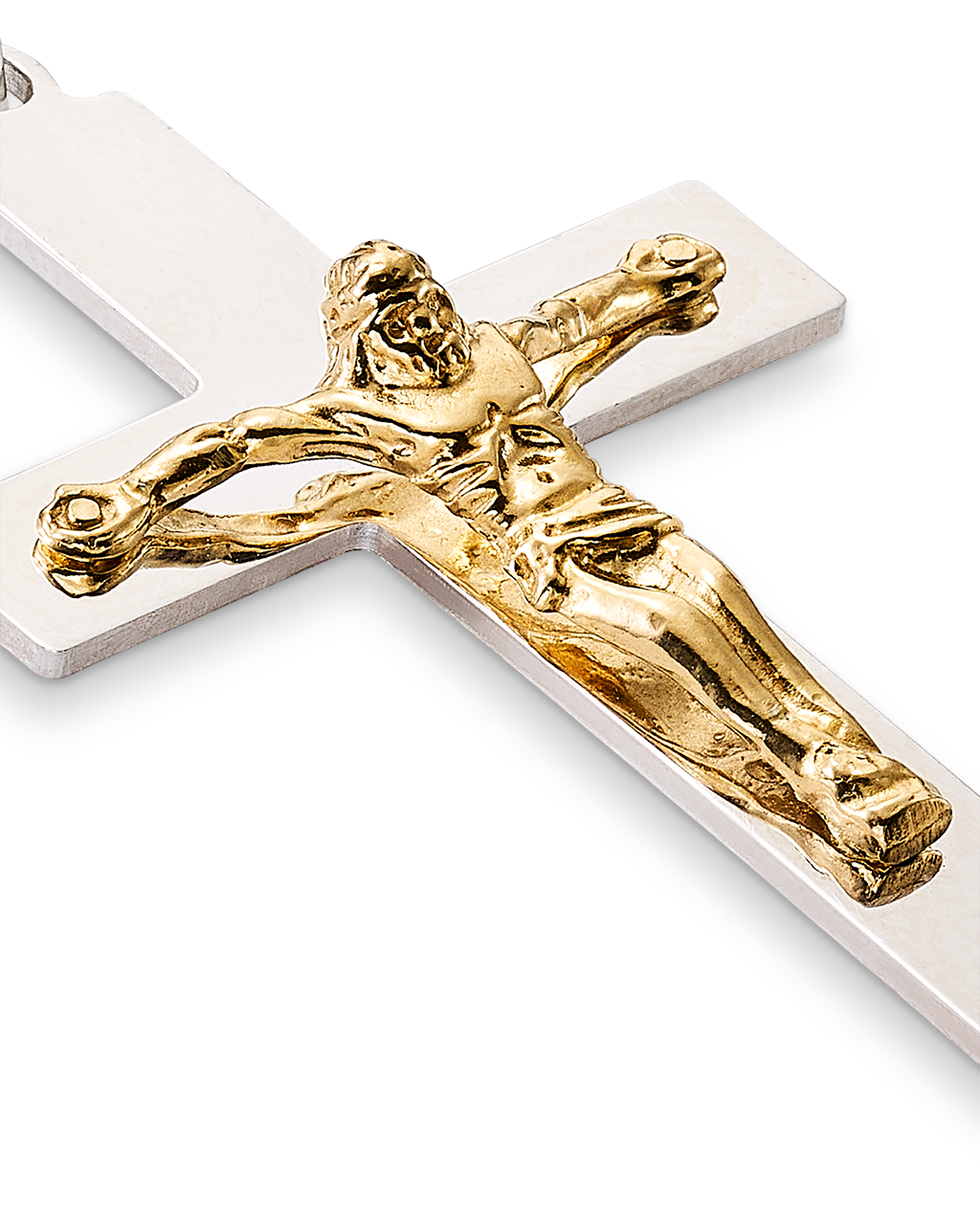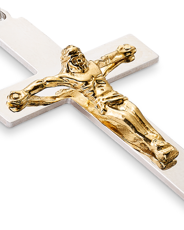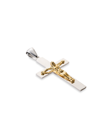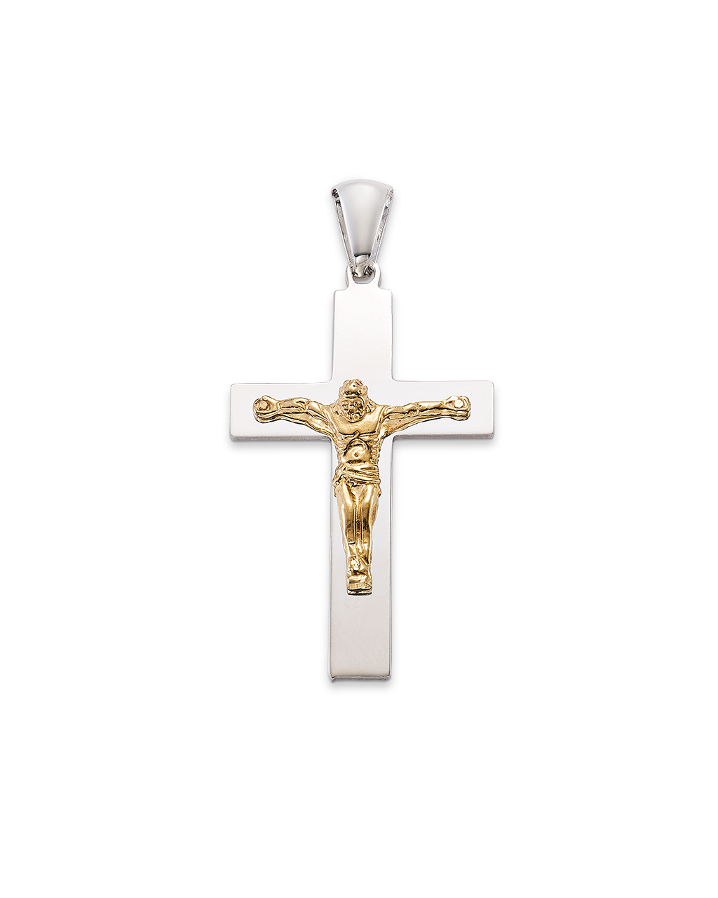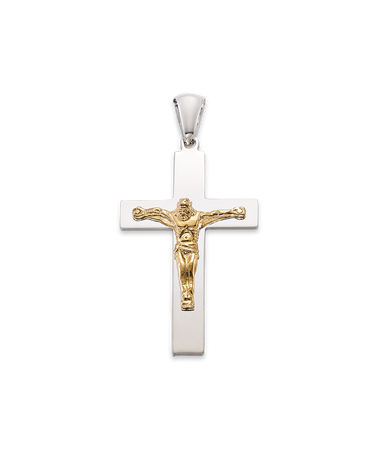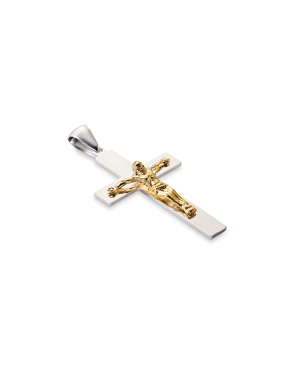 Cruz plana con Cristo. Plata de ley dorada. Medida 37 x 23 mm, ancho 5 mm. Colección Divina.