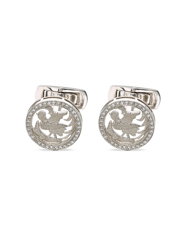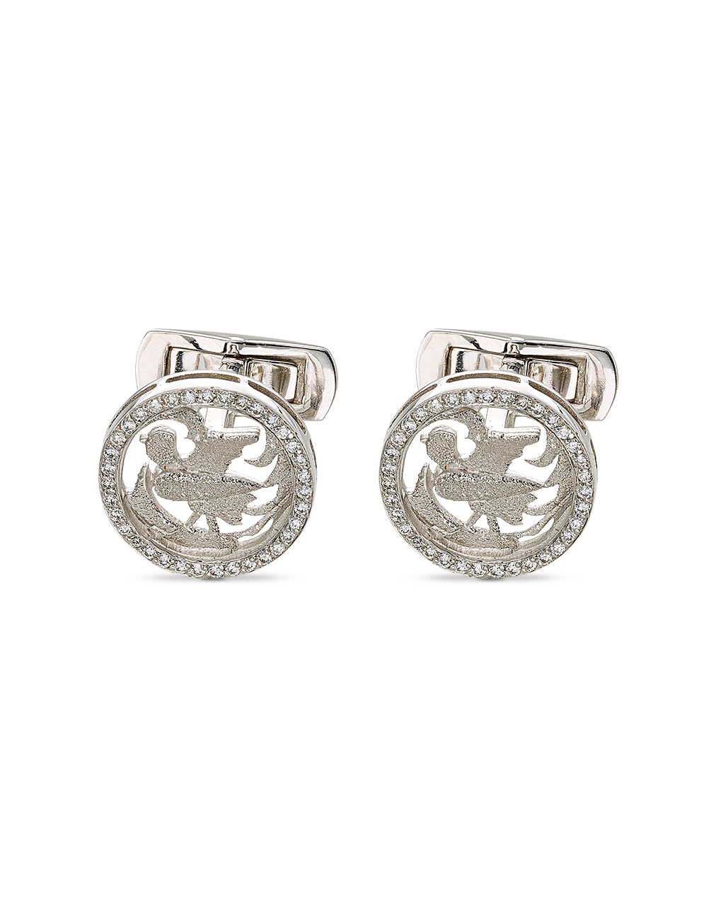 Gemelos centro paloma, bisel diamantes talla brillante de 0,36 ct, oro blanco de 18K. Diámetro 15 mm. Colección Alhambra fabricada artesanalmente en nuestros talleres.