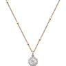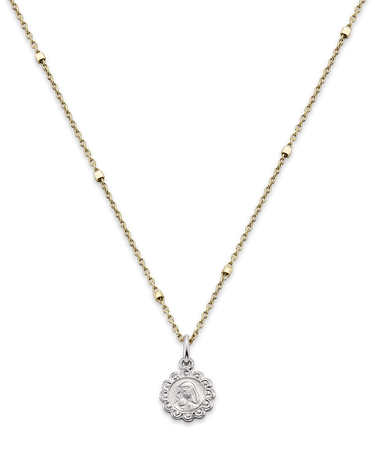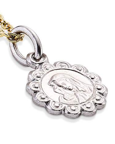 Medalla Virgen arropando niño. Plata de ley. Cadena con terminación medalla ángel de la guarda. Plata de ley dorada. Medida medalla 8 mm, medida cadena 43 - 49 cm. Colección Divina.