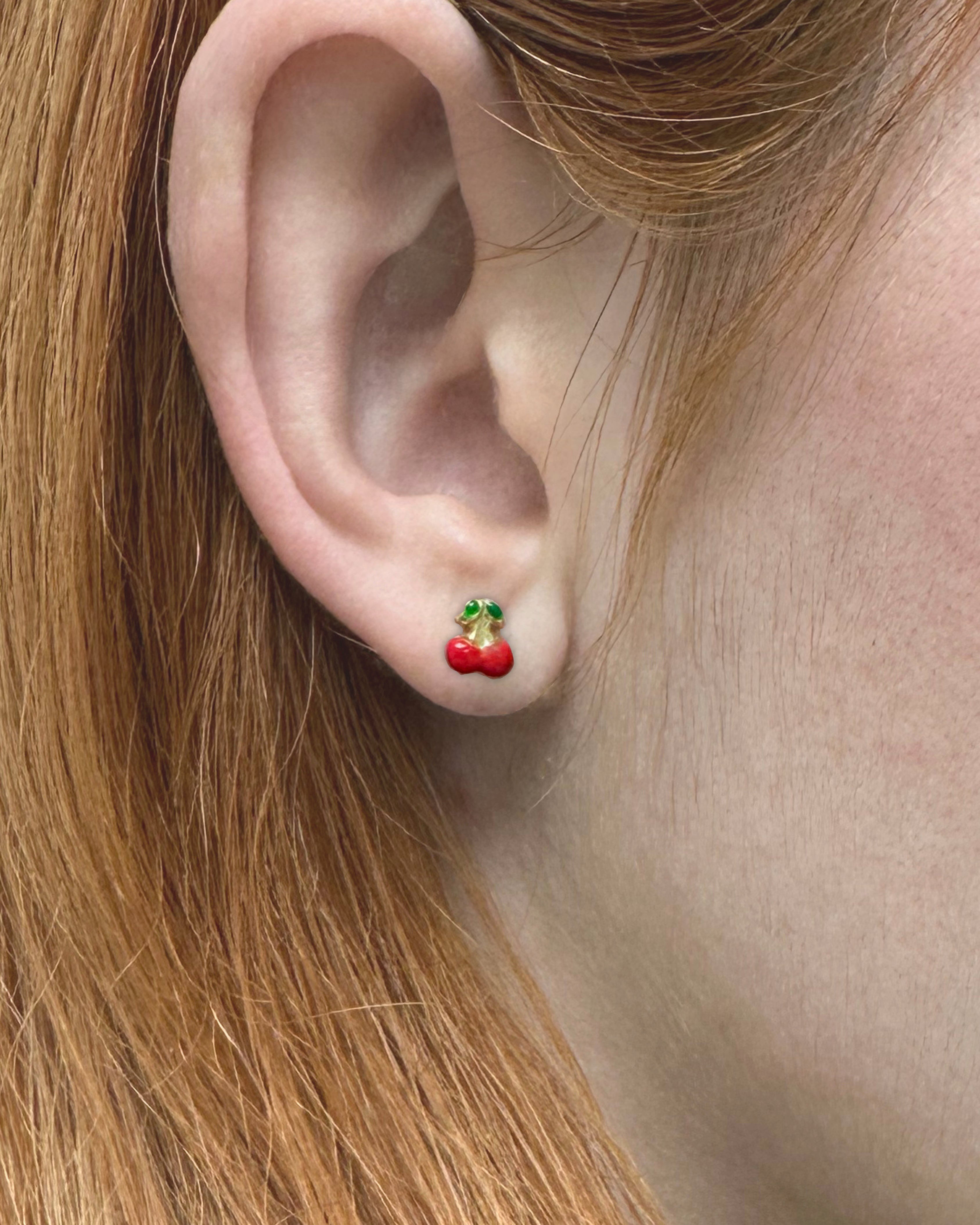 Pendientes cerezas esmalte, oro amarillo de 18K. Medida 7 x 7 mm. Cierre rosca bebé. Colección Babies and Kids.