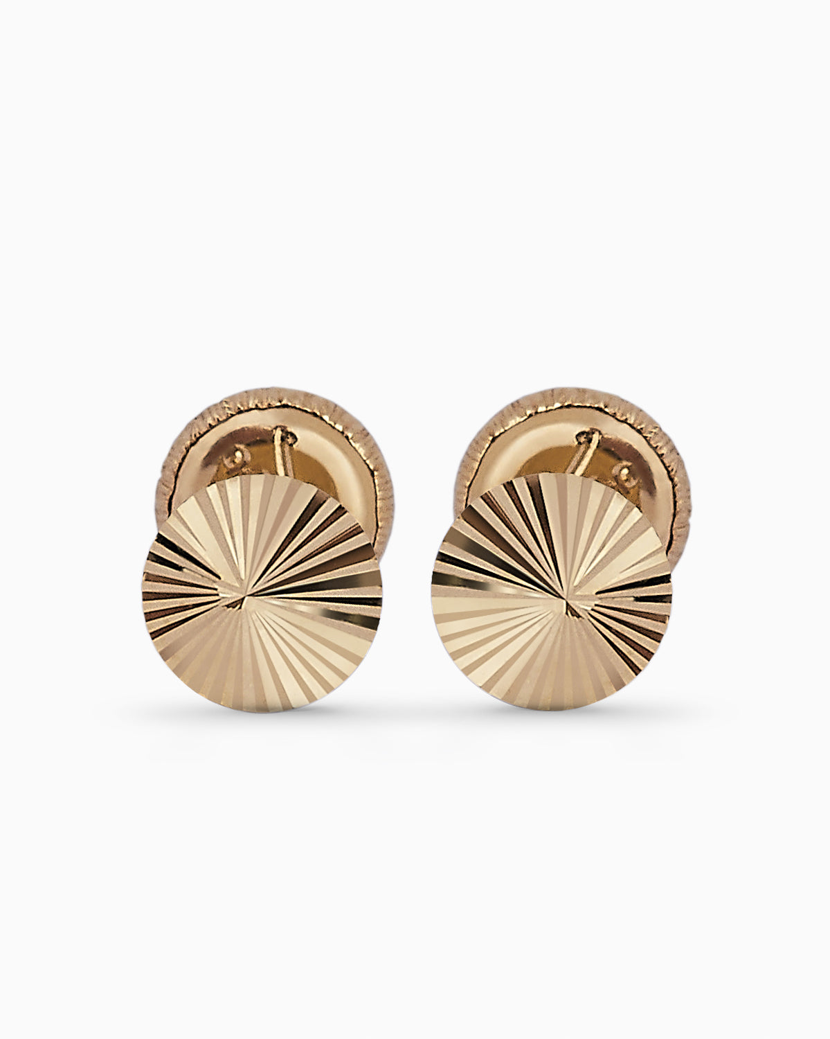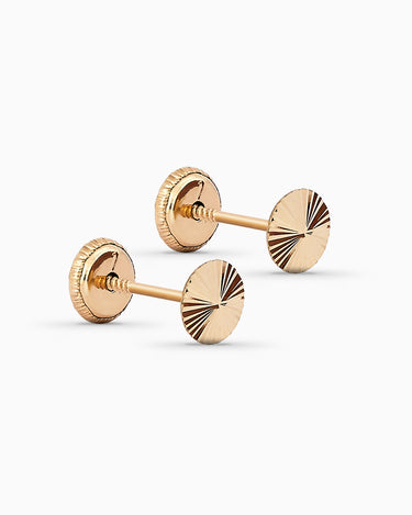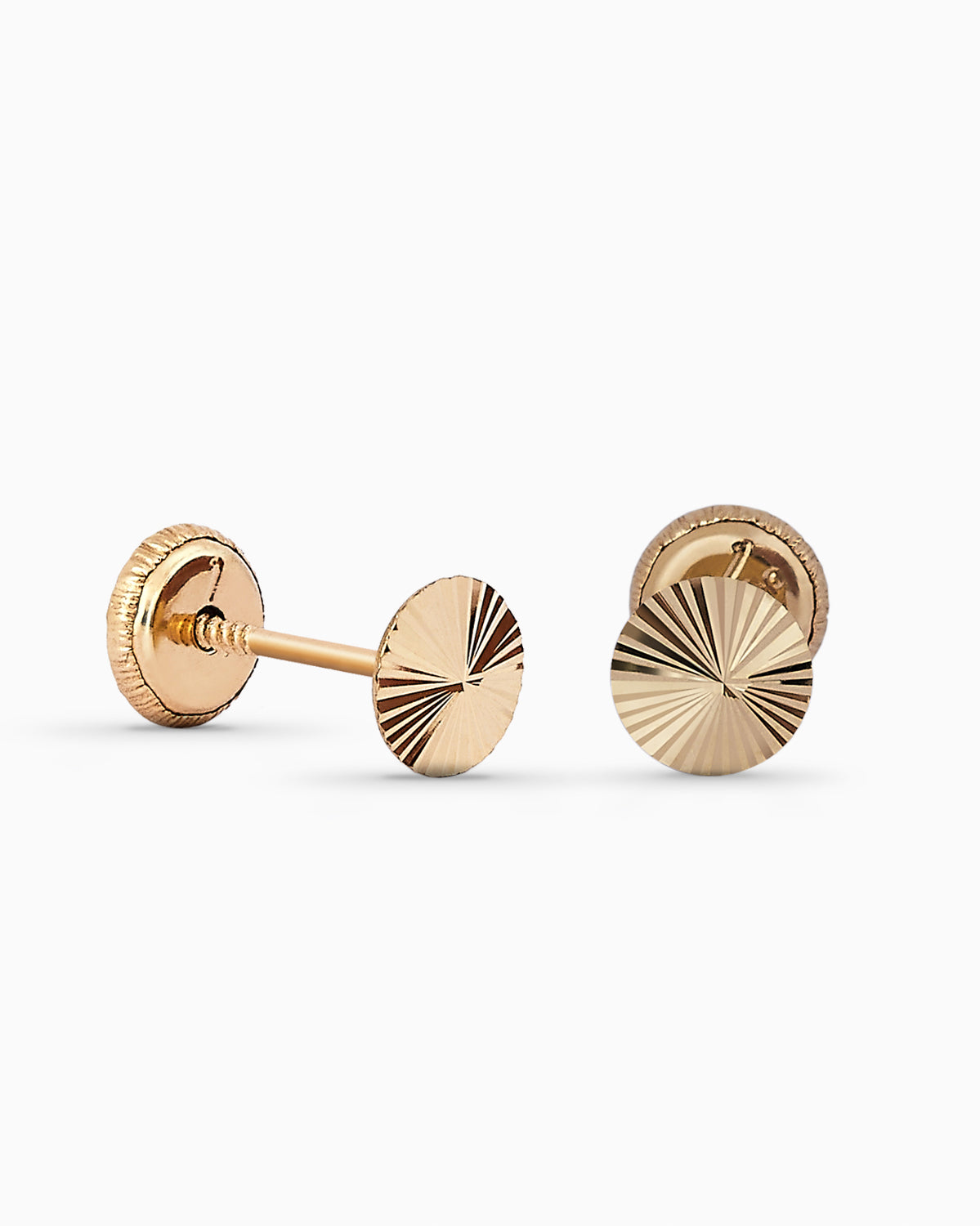 Pendientes disco tallado, presión rosca. Oro amarillo de 18K. Diámetro 5 mm. Pendientes Bebé.