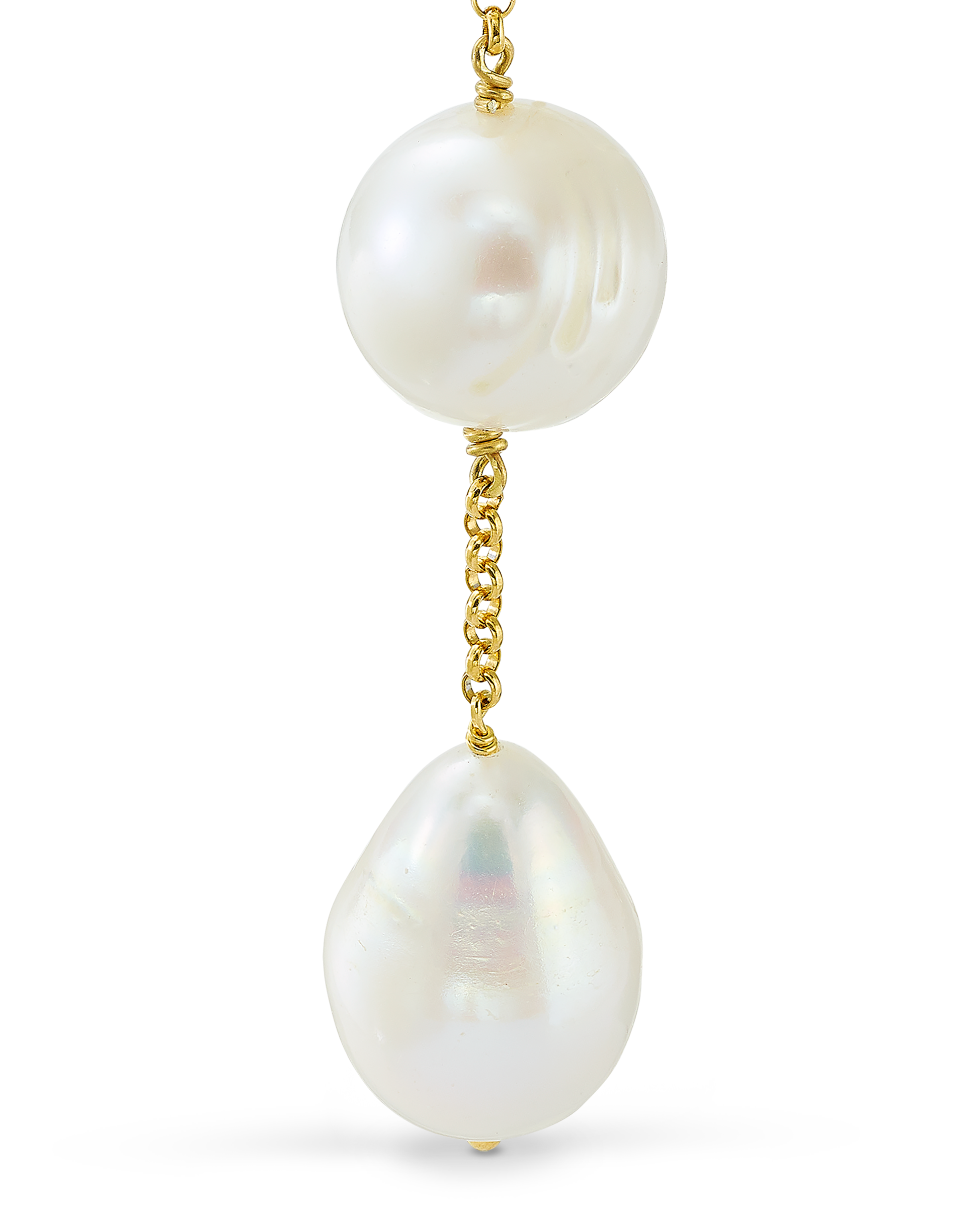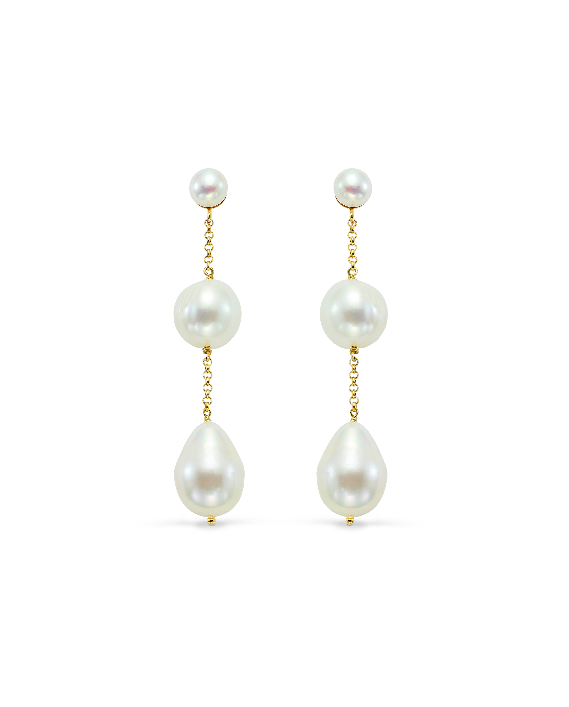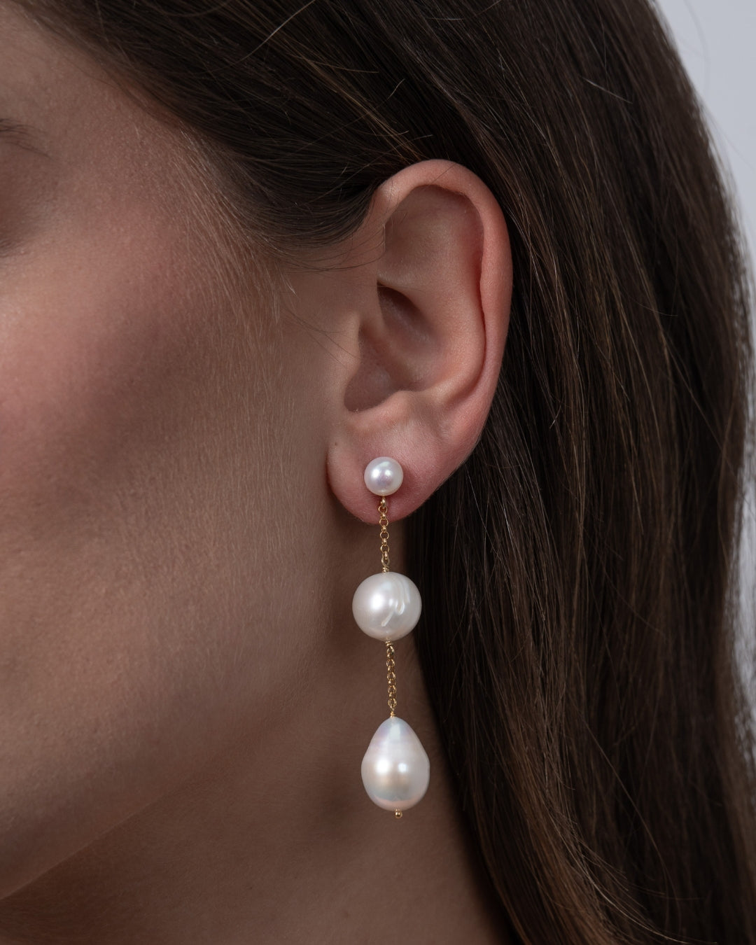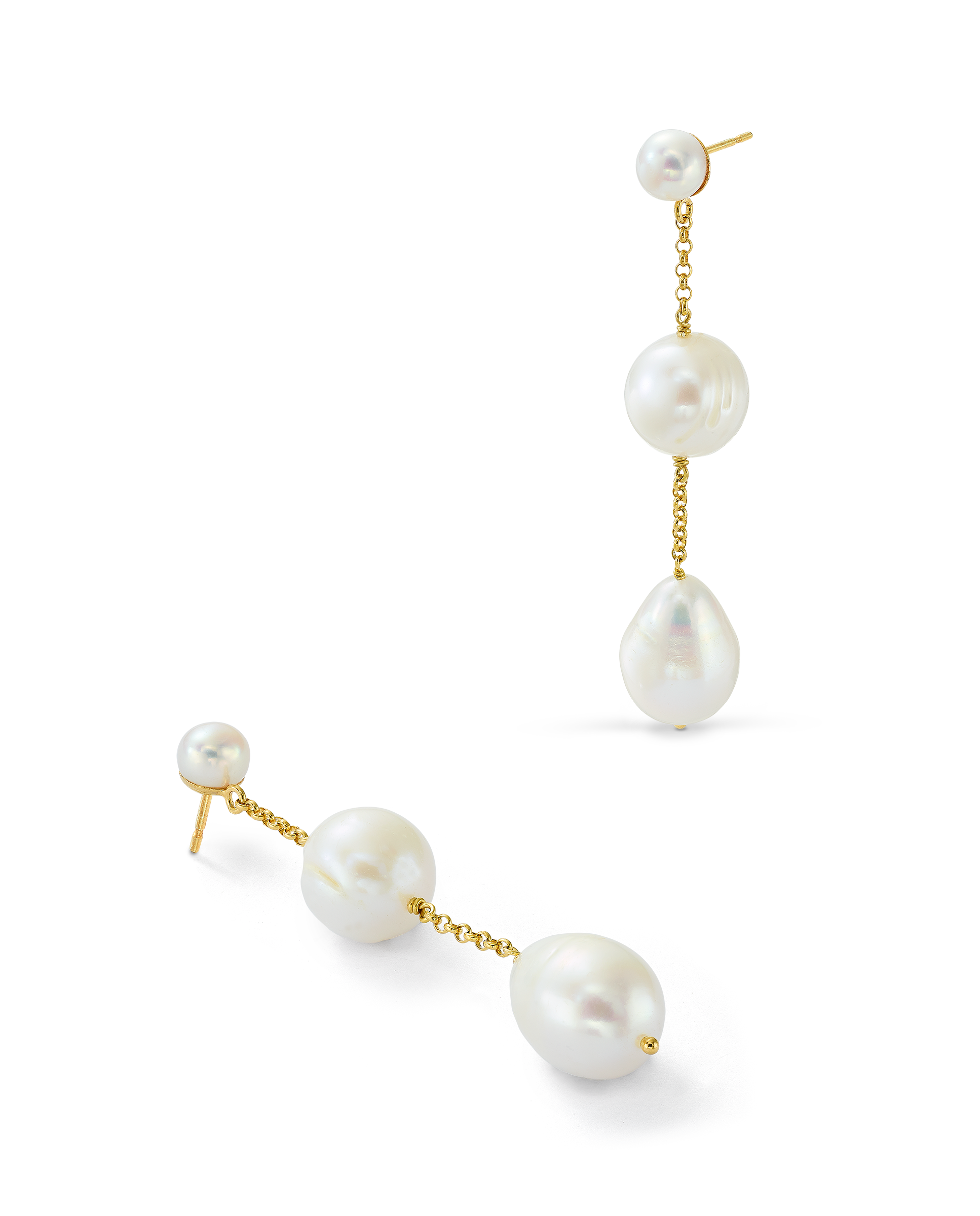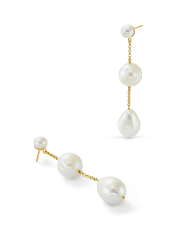 Pendientes en plata de ley dorada, colgantes perlas barrocas. Medida largo total 6 cm aprox. Colección Costa Blanca.