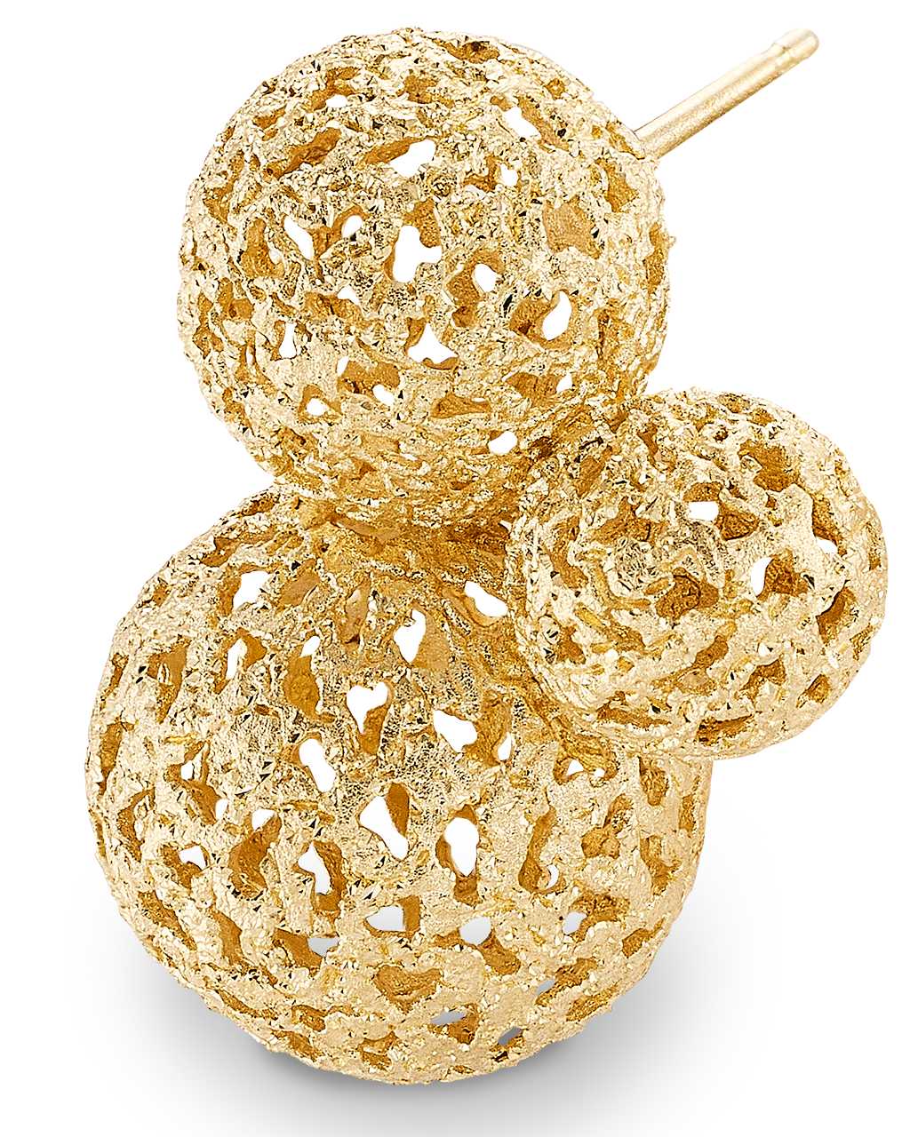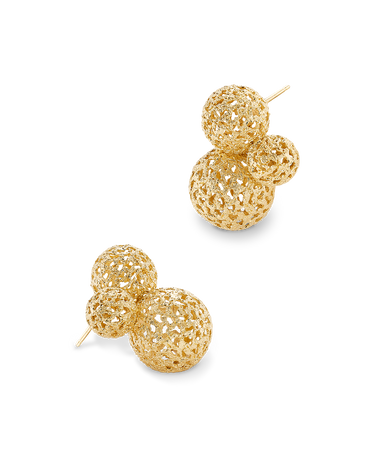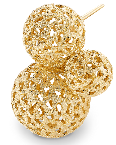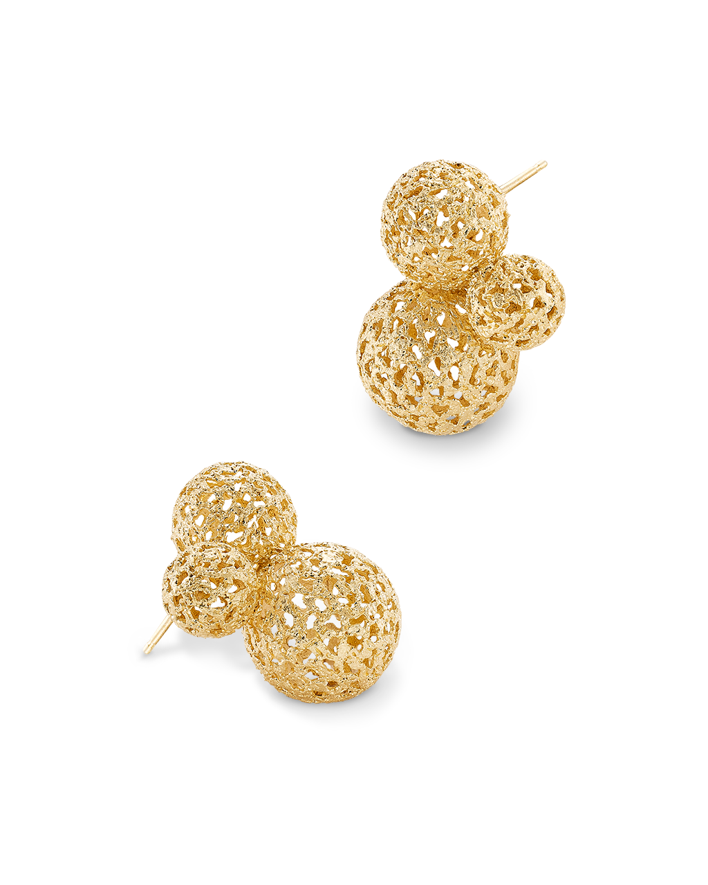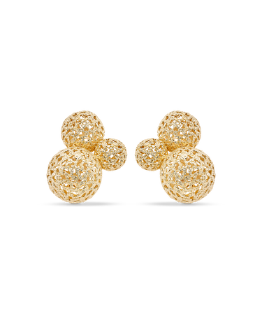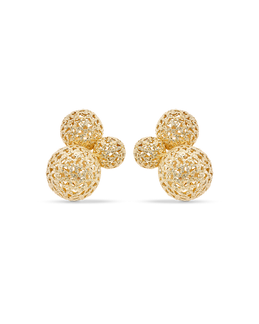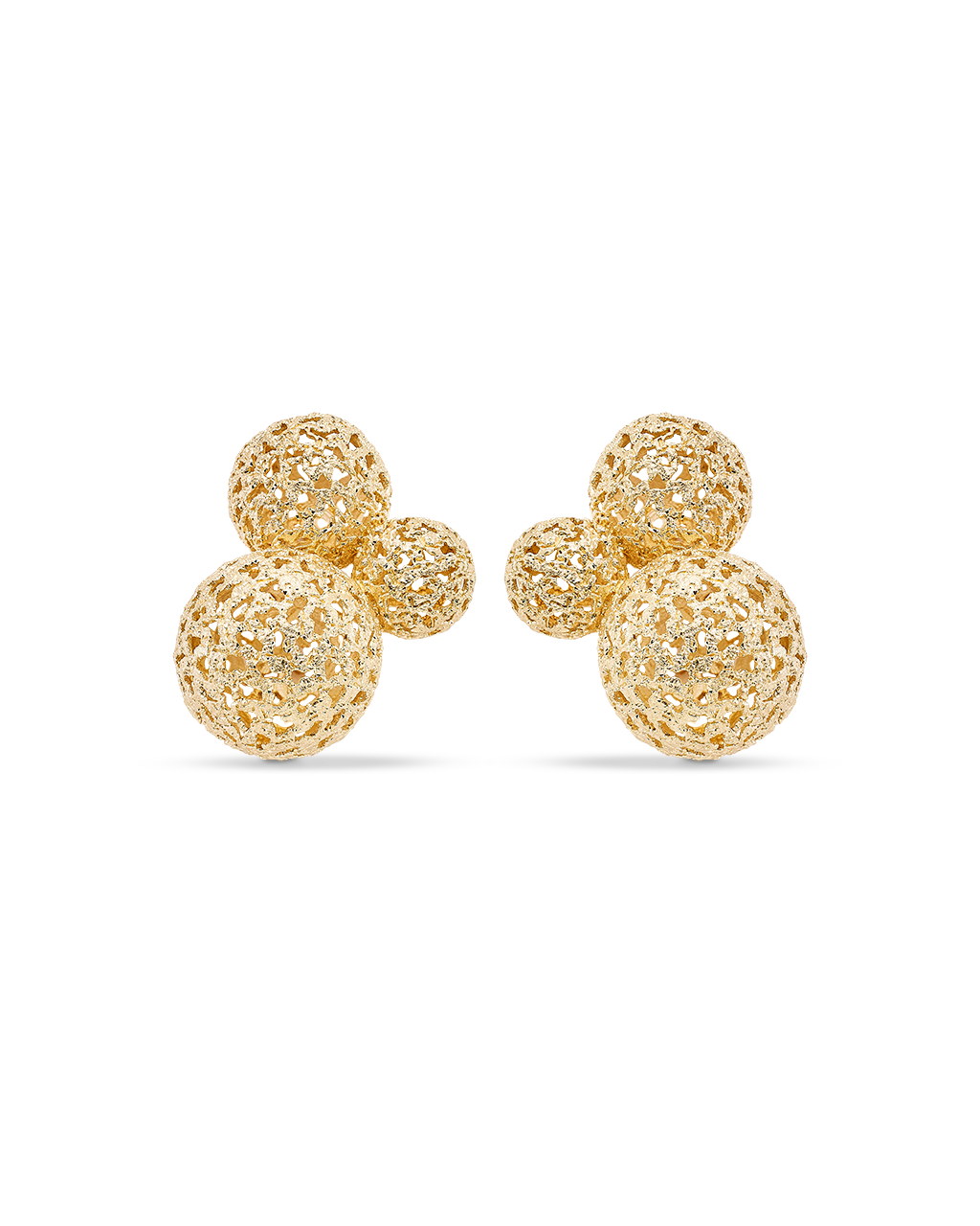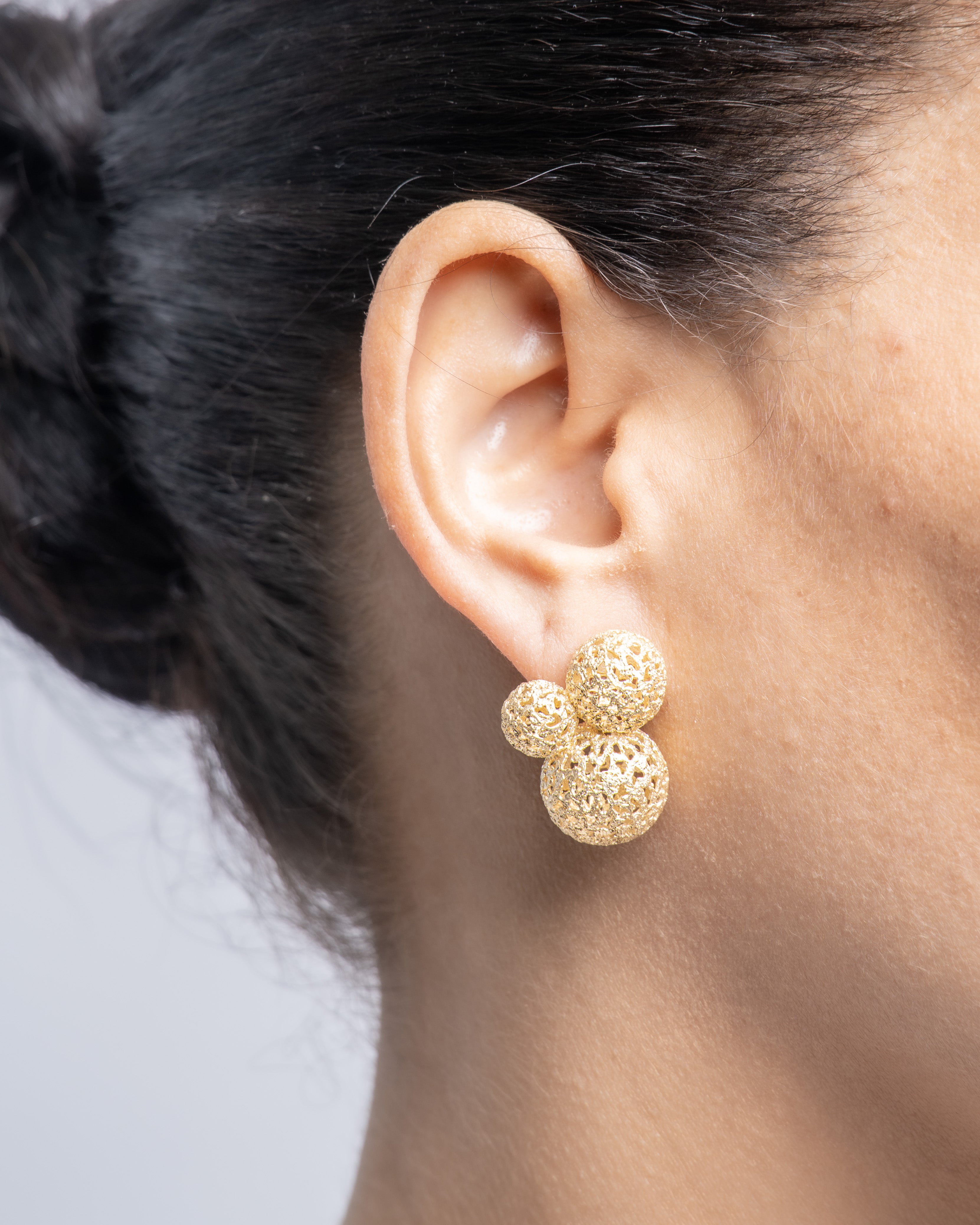 Pendientes tres bolas fligrana varios tamaños, acabado polvo diamante, plata de ley dorada. Medida centro 25 x 20 mm. Colección Bolshoi.