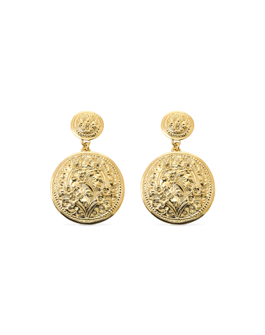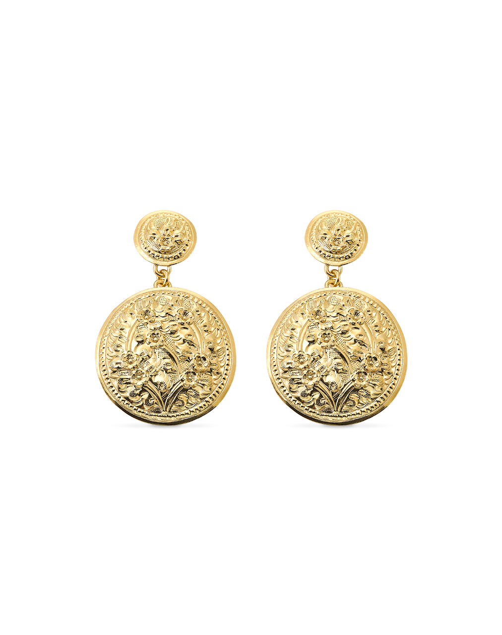 Pendientes discos grabados flores, plata de ley dorada. Diámetro discos 12 - 28 mm. Colección Traviata.