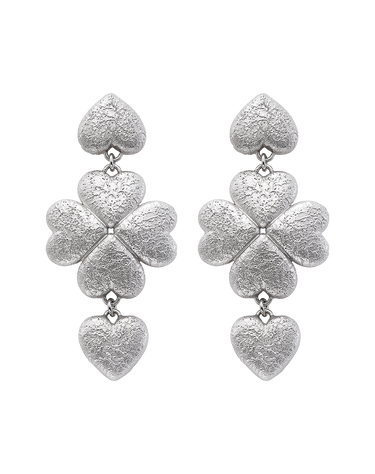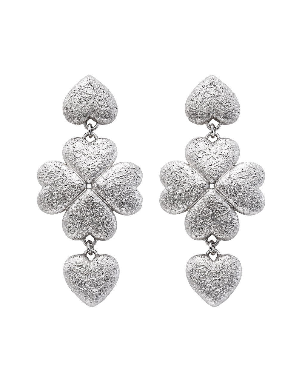 Pendientes trébol cuatro corazones y corazón colgante, acabado polvo de diamante, plata de ley. Largo total 5 cm. Colección Menudos Corazones.