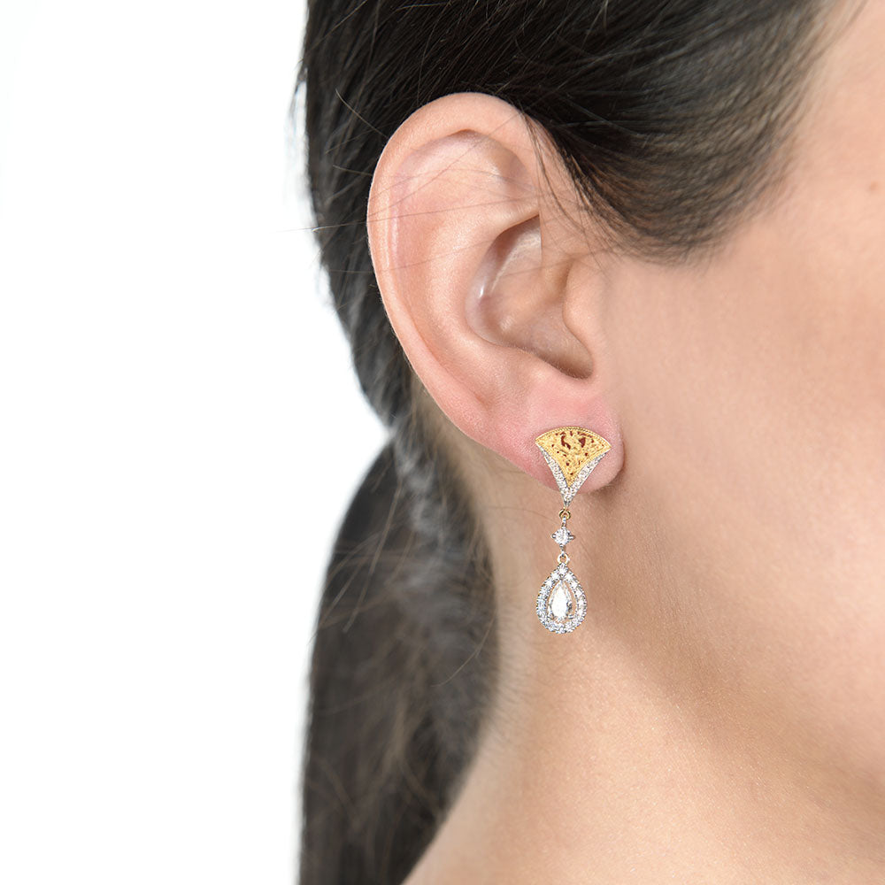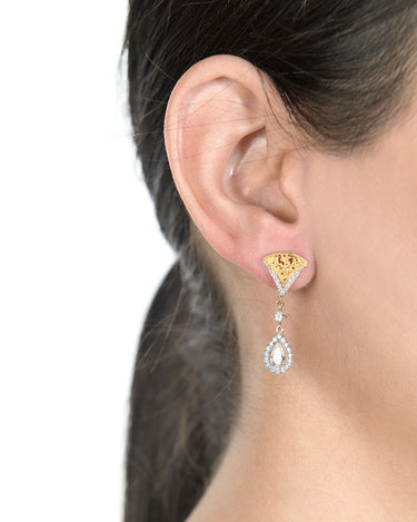 Pendientes motivo triangulo filigrana y bisel diamantes, talla brillante, colgante diamante talla perilla rodeada de diamantes, 0,60 ct, color D, pureza Si, GIA 3x, oro amarillo de 18K 18K, peso 4g. Triángulo 10 x 10 mm, Diamante pera 0,90 x 0,60 mm. Largo total 3 cm. Colección Alhambra fabricada artesanalmente en nuestros talleres.