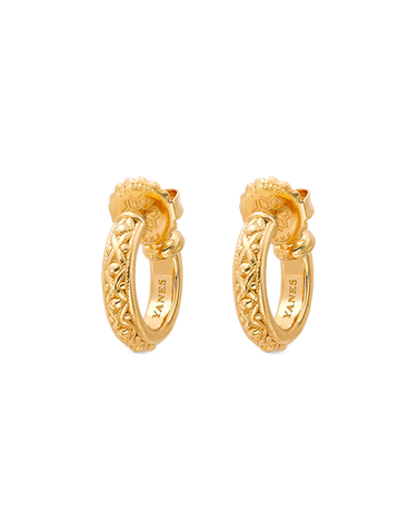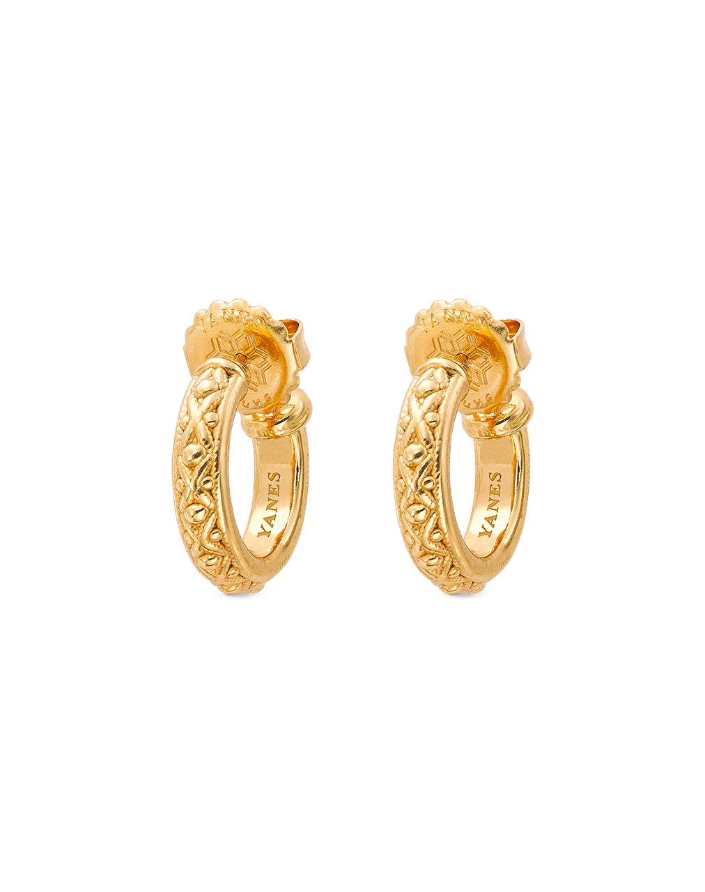 Pendientes aros, modelo pequeño, acabado "tambor", cordones y bolas, plata de ley dorada. Ancho 4 mm. Diámetro 1,8 cm. Colección Malpica Young.