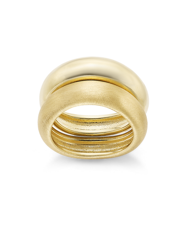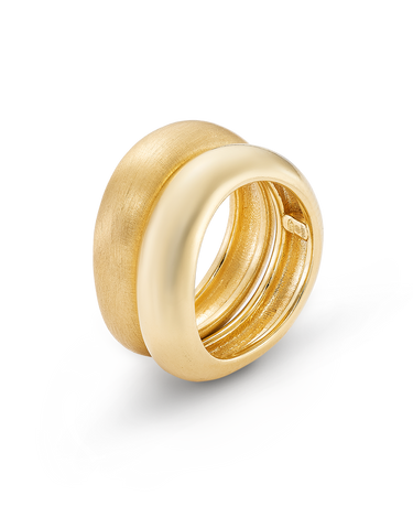 Dos anillos separados que encajan en onda. Plata de ley dorada acabado mate y brillo. Ancho de cada anillo 6 mm. Colección Pixie.