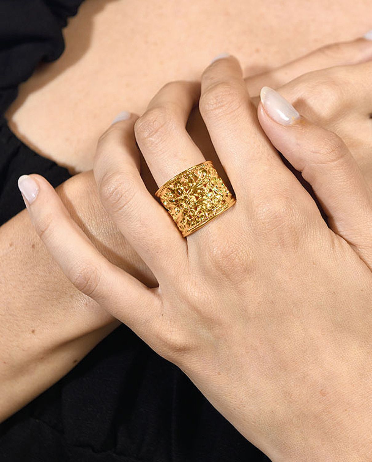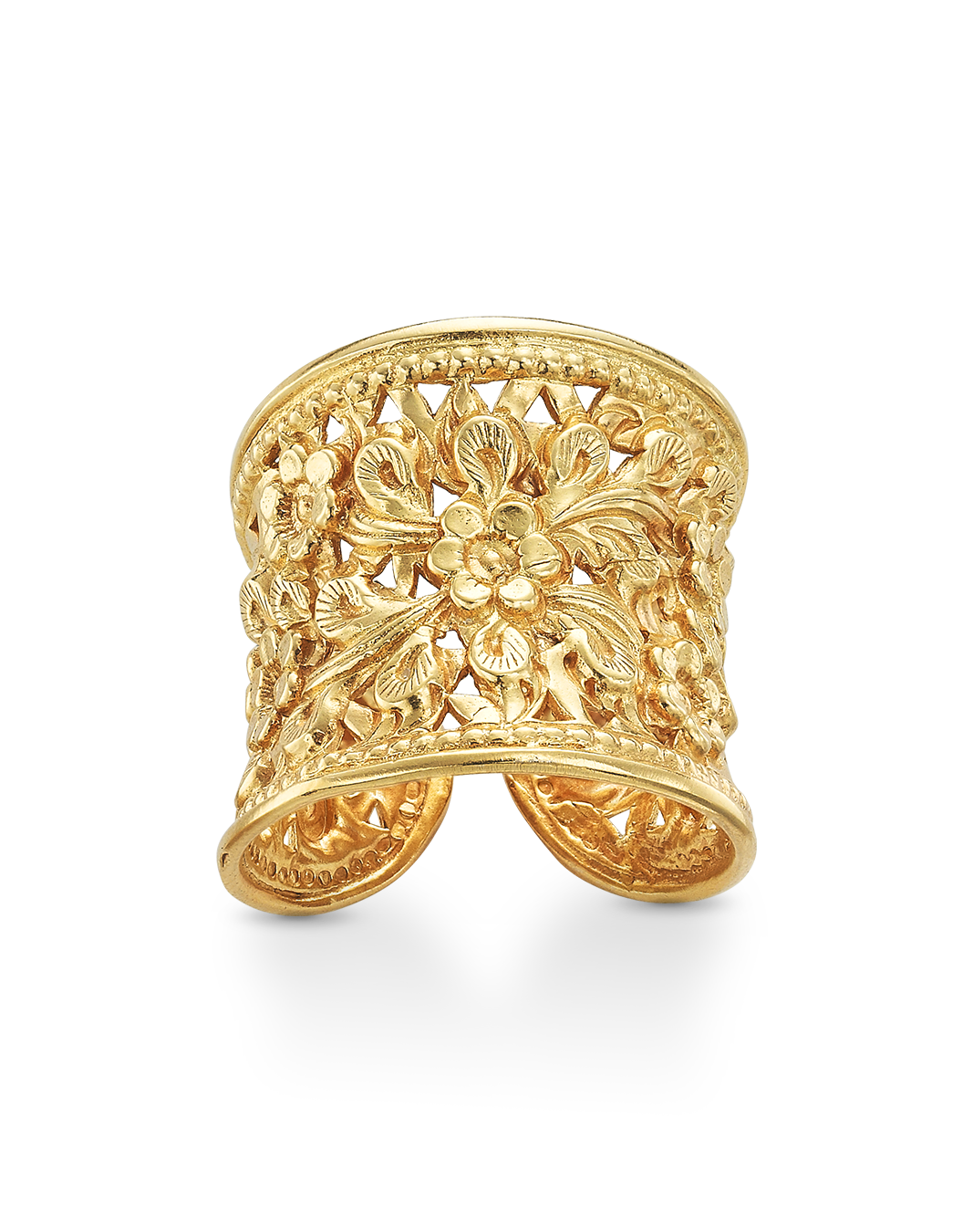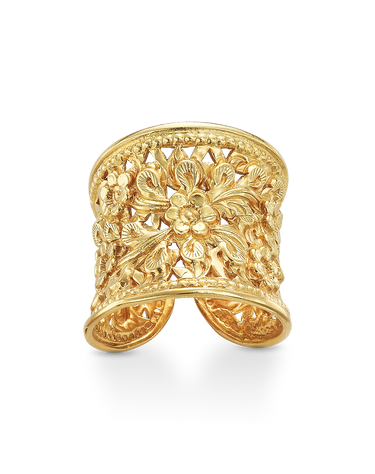 Anillo dibujo filigrana flores, ajustable, plata de ley dorada. Ancho 2 cm. Colección Traviata.